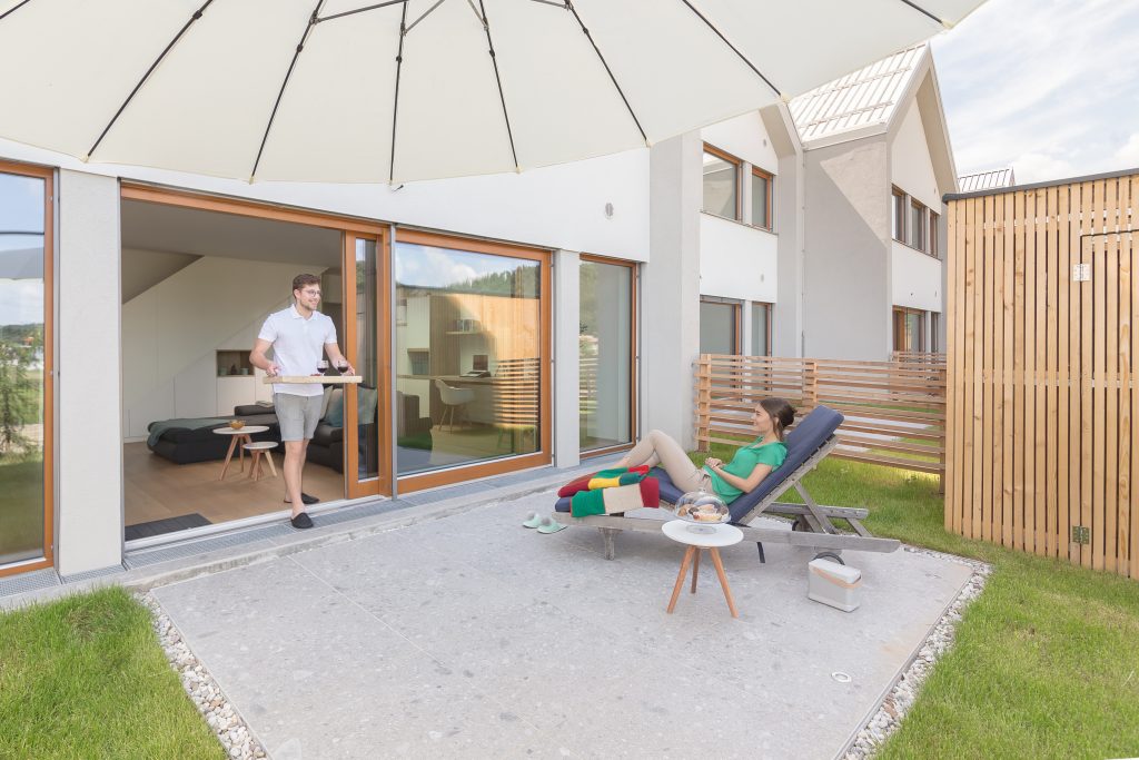 The Drenovo neighbourhood is distinguished by modern architecture and energy-saving construction of prefabricated wooden houses with a strong emphasis on exterior design. Sophisticated technological procedures and hidden details ensure optimal living conditions and durability of the facilities. The houses are fire, flood and earthquake safe and adequately thermally and sound insulated. The thoughtful layout of the units allows the residents the greatest possible privacy.