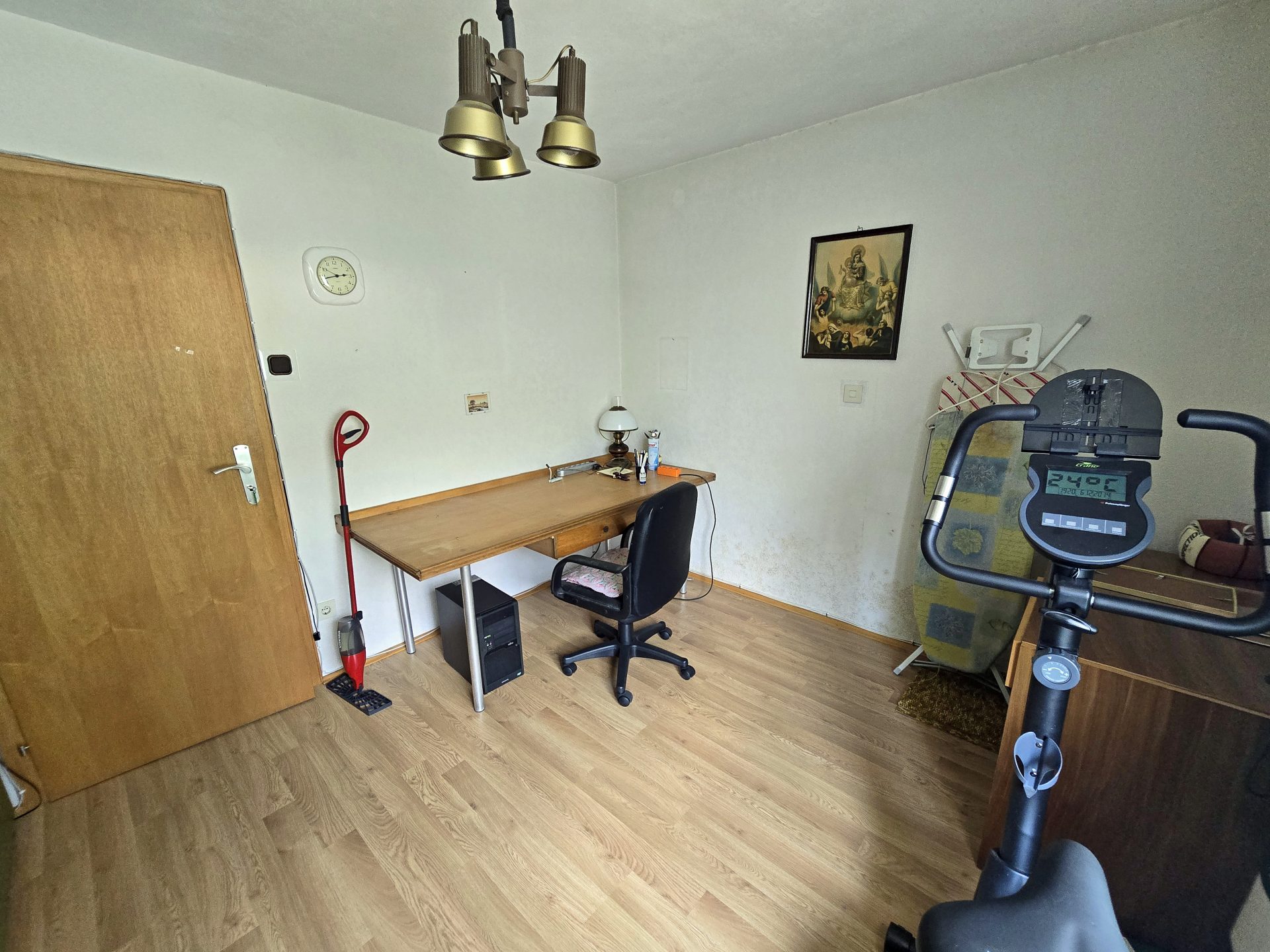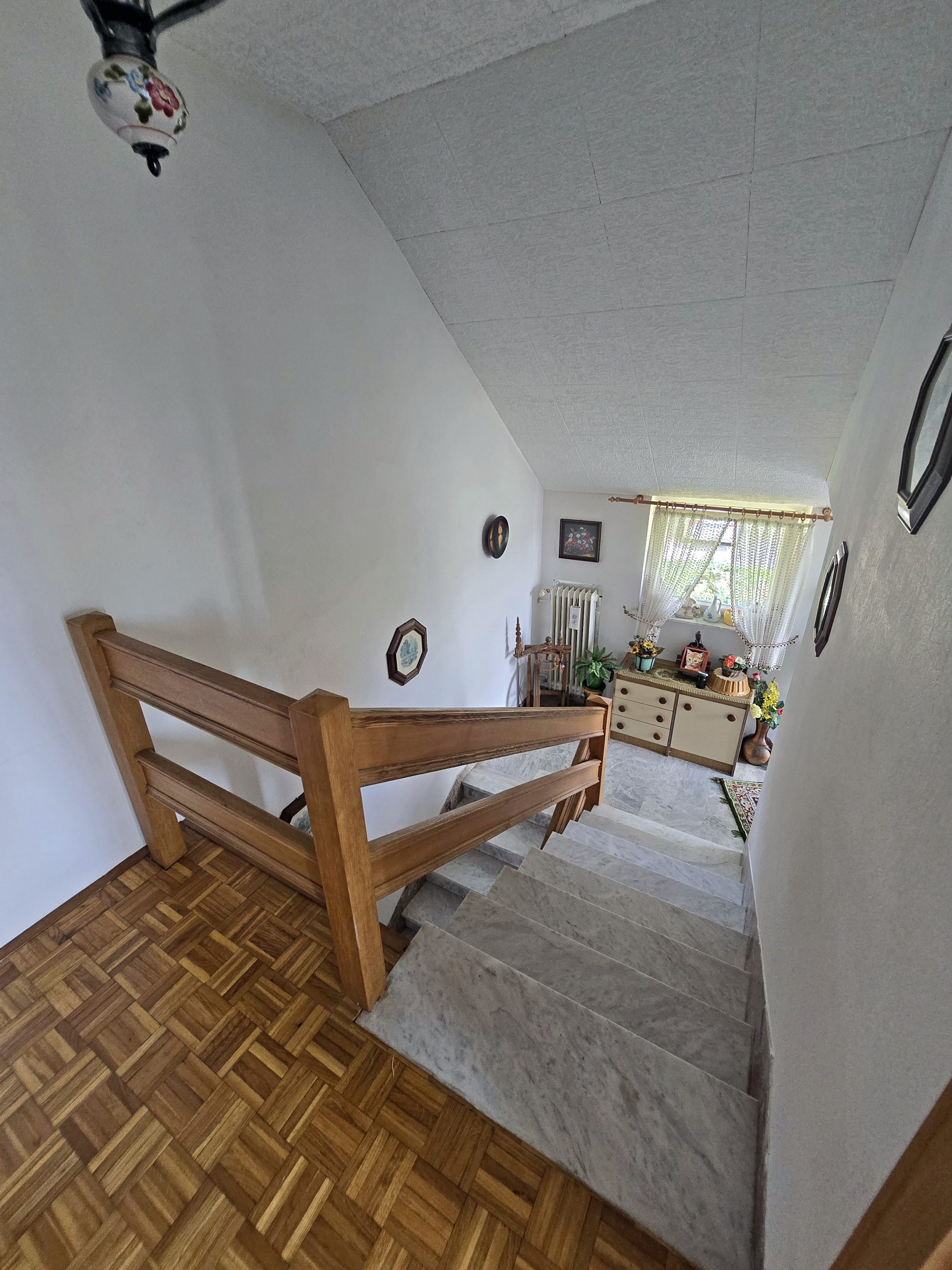 On the ground floor there is an entrance hallway, hallway with wooden staircase, large and bright living room area with access to the balcony, dining area and a kitchen with access to the balcony, bathroom, toilet and 2 bedrooms.