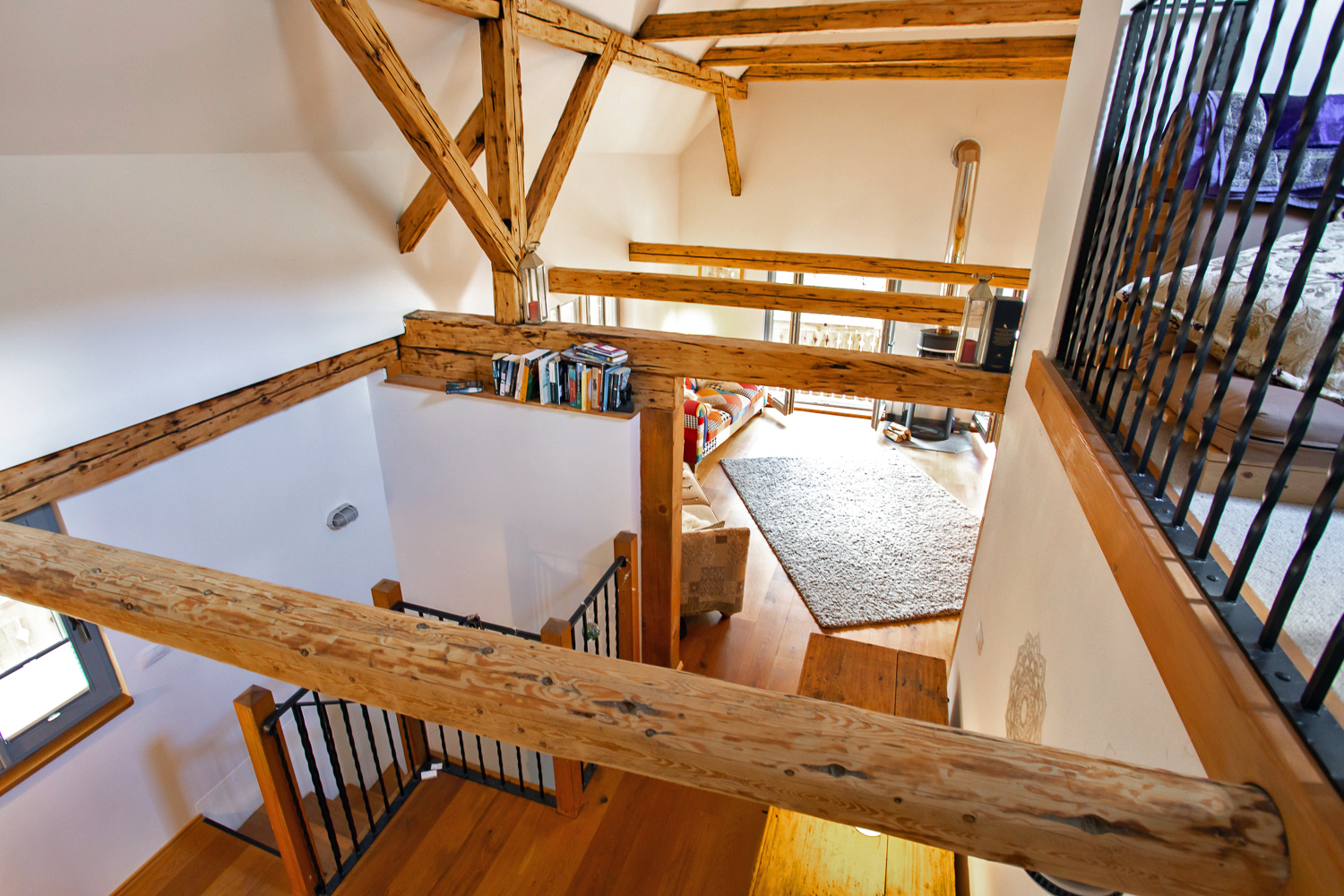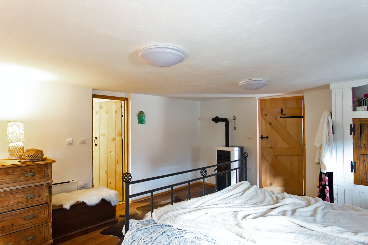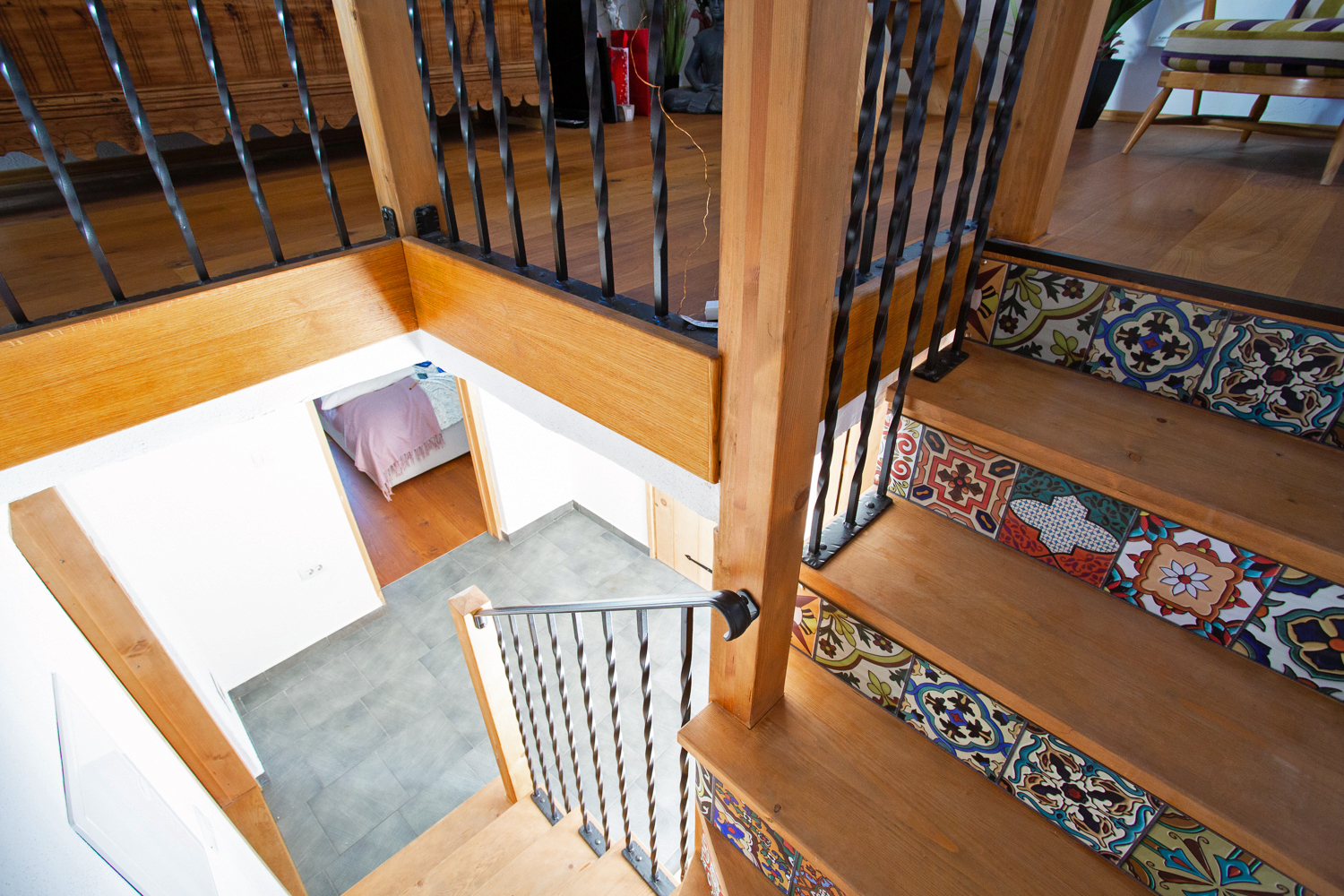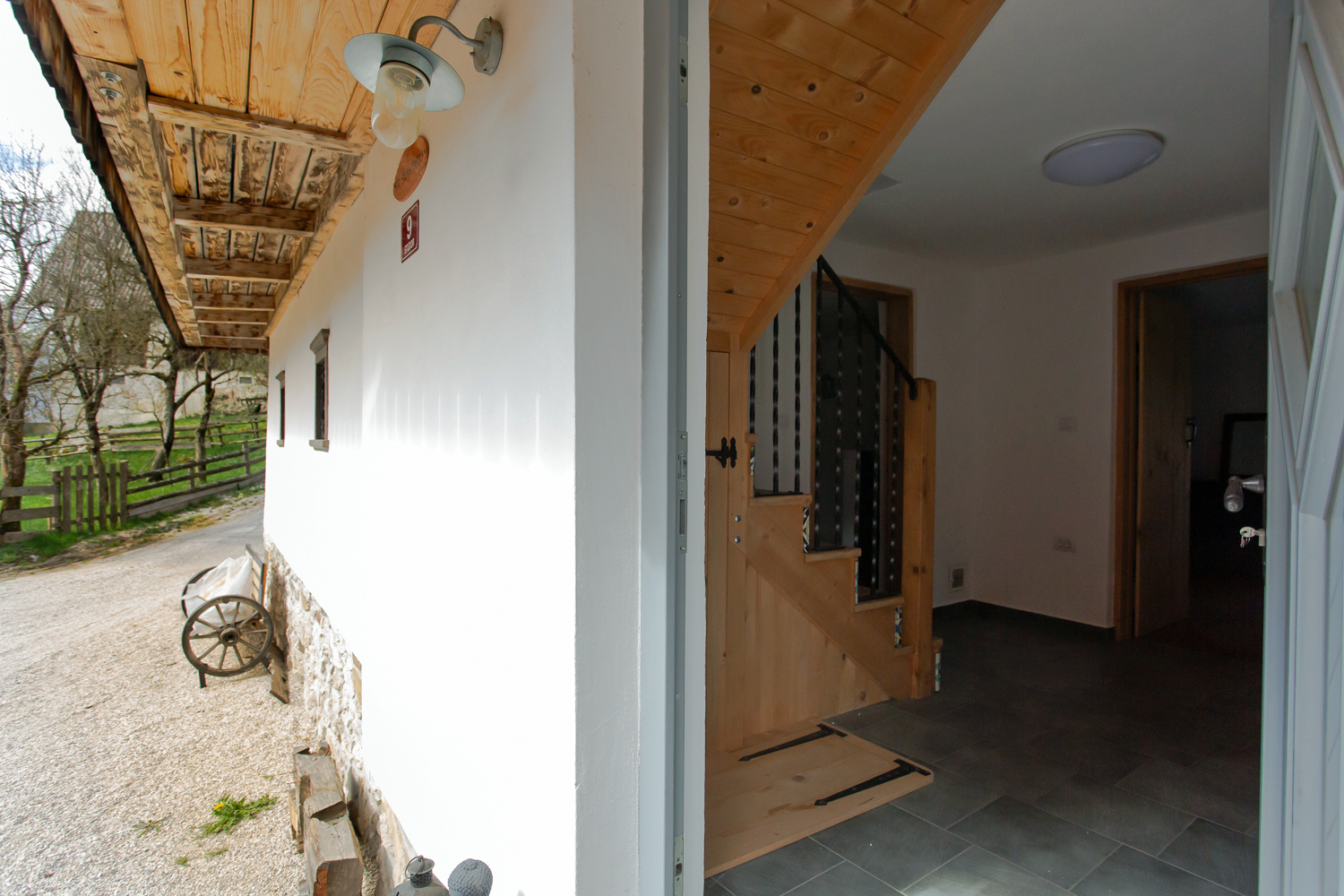 V zgornjem nadstropju se nahaja dnevni in jedilni prostor odprtega tipa, z velikimi vrati/okni, balkon, kuhinja. Kuhinja je opremljena z vsemi potrebnimi aparati. V dnevni sobi je tudi kamin na drva.