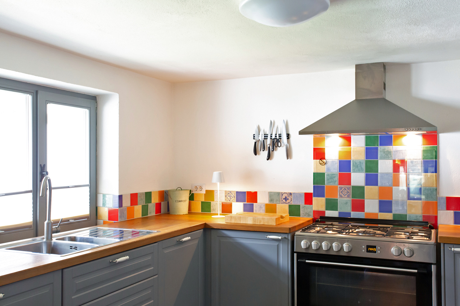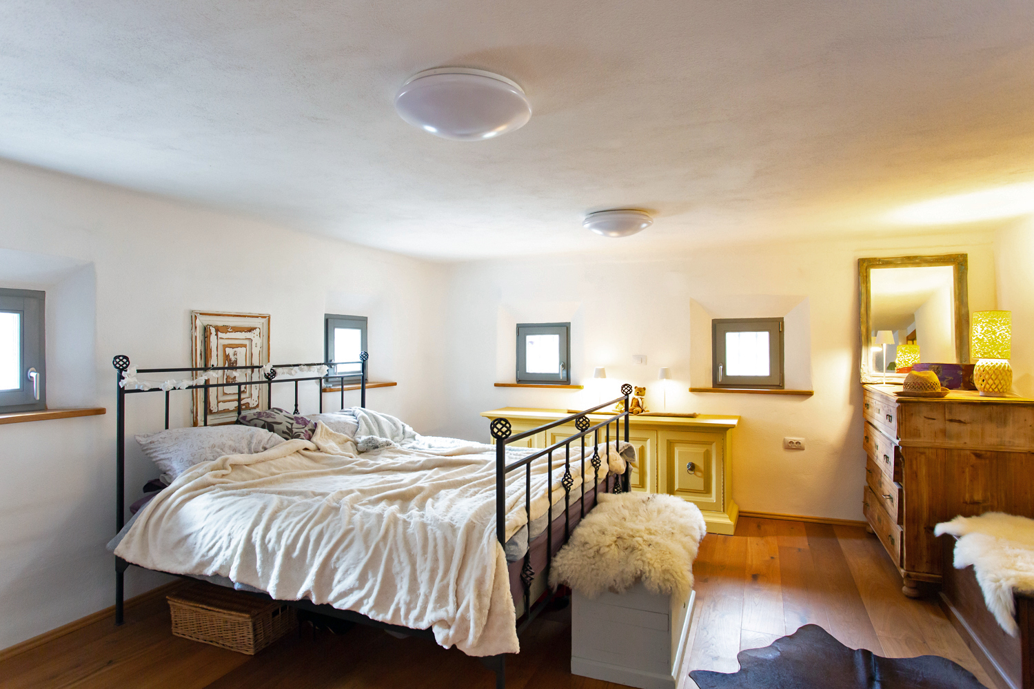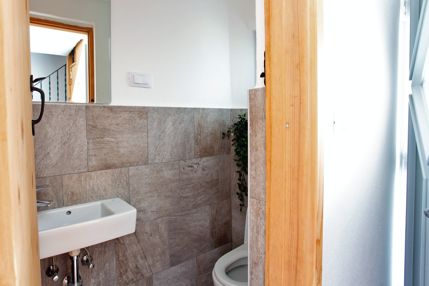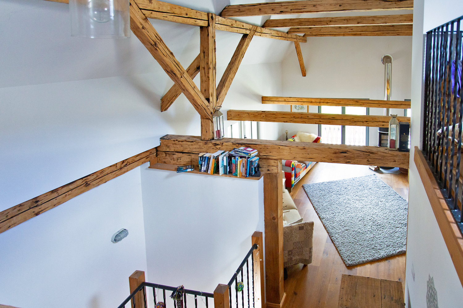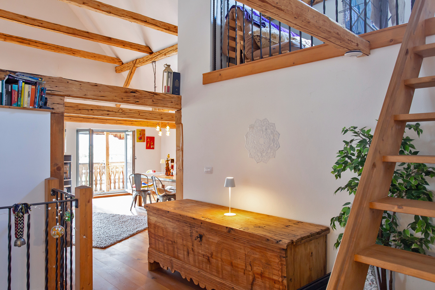 V zgornjem nadstropju se nahaja dnevni in jedilni prostor odprtega tipa, z velikimi vrati/okni, balkon, kuhinja. Kuhinja je opremljena z vsemi potrebnimi aparati. V dnevni sobi je tudi kamin na drva.