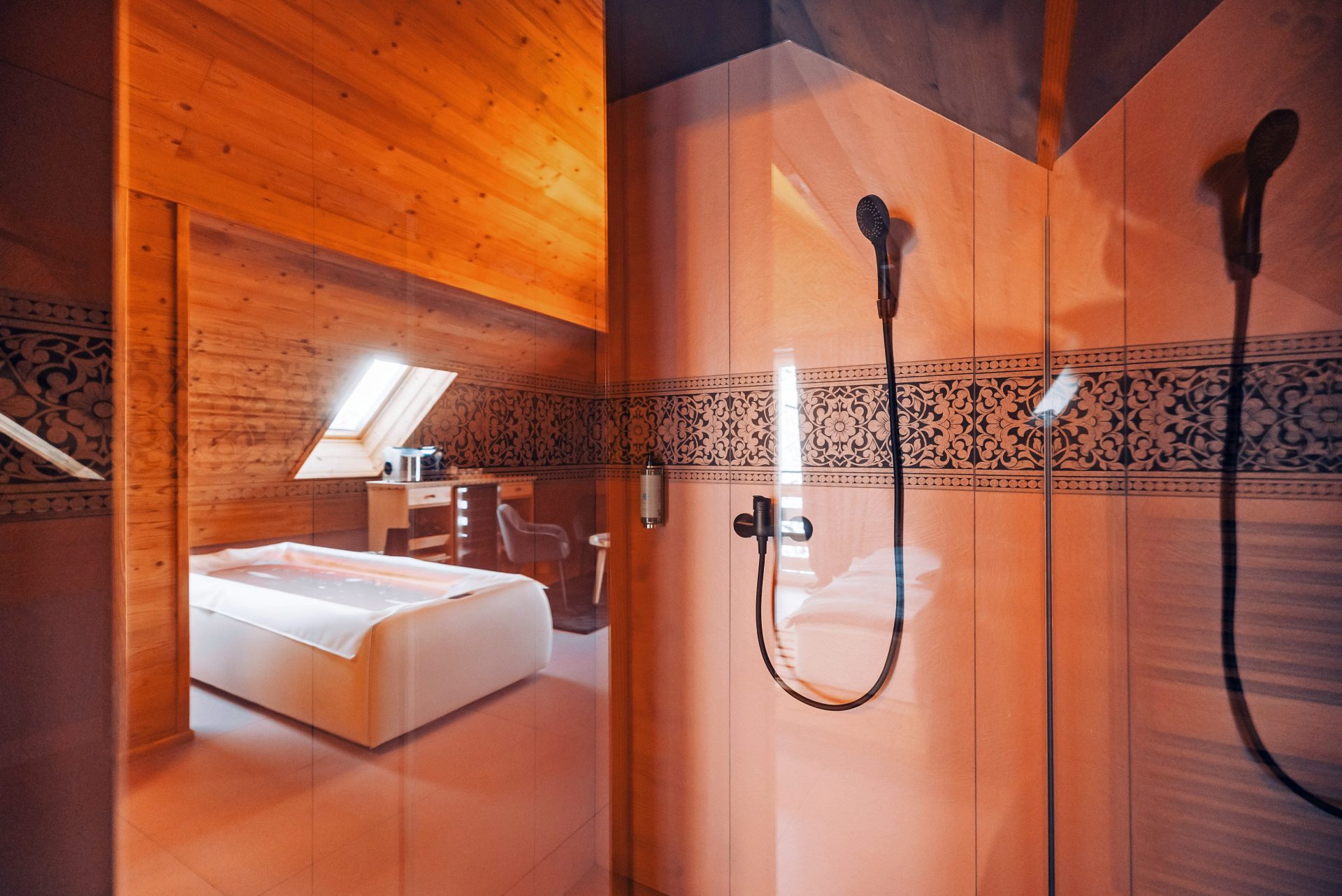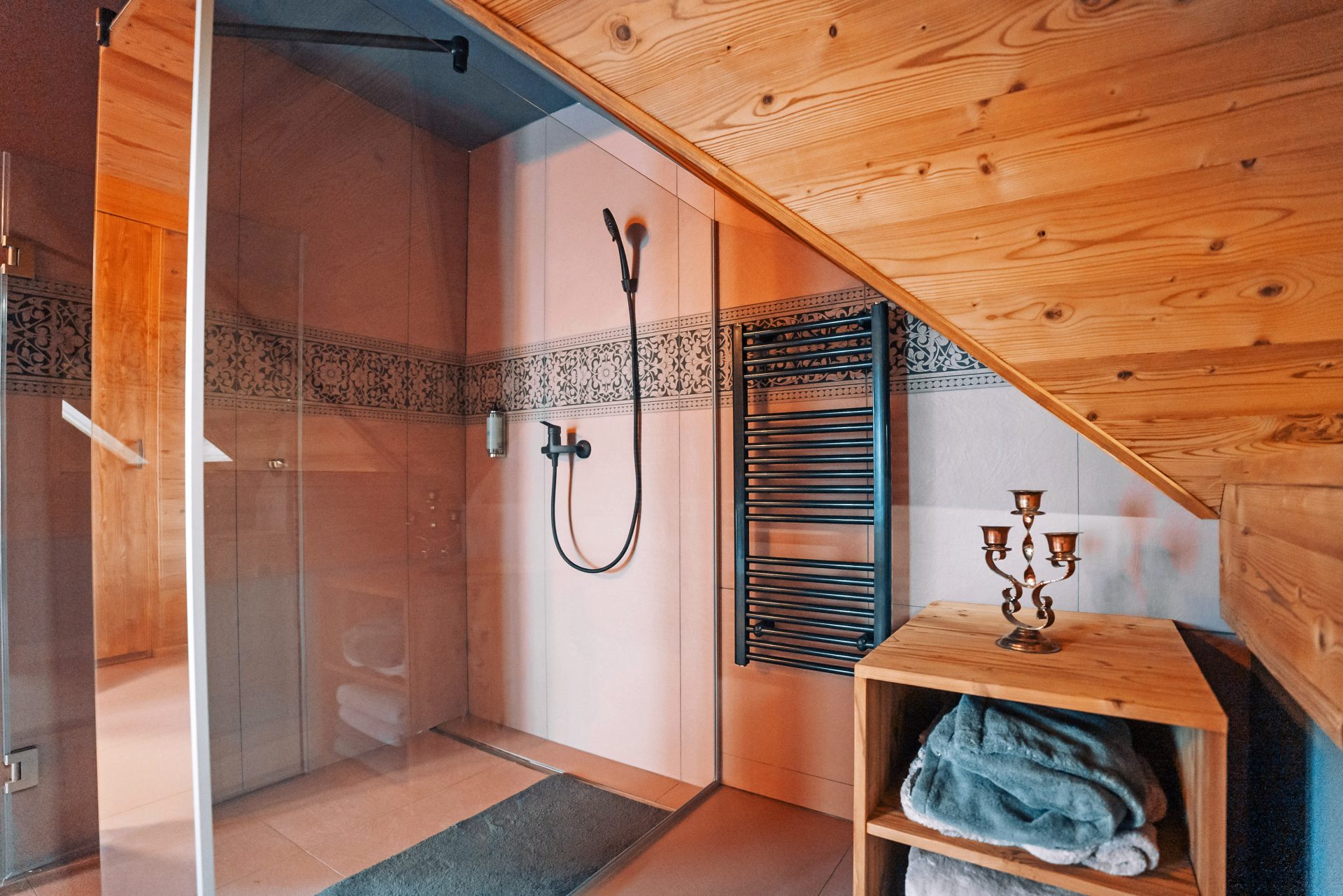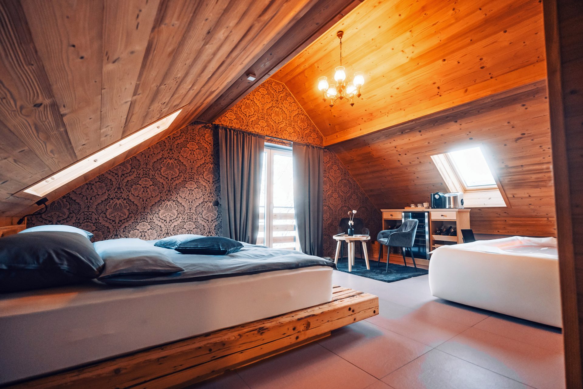 The master bedroom on the top floor, comfortable double bed bedroom with shower cabin, toilet and equipment made of natural materials, everything you need for complete relaxation awaits you.