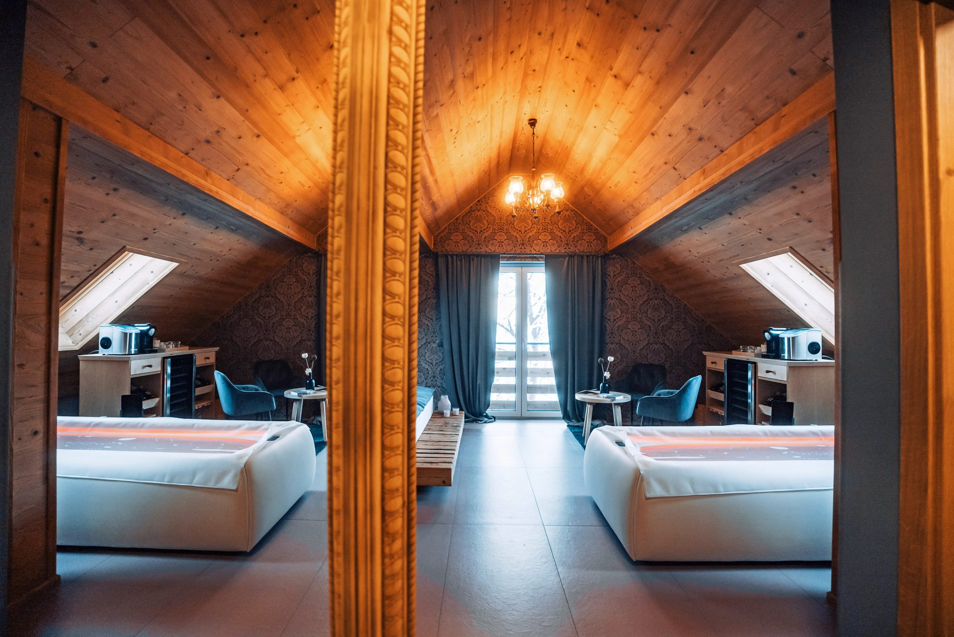 In addition to the infrared sauna, you can also use the innovative and patented Zerbody body and mind regeneration system – dry floating. The floating bed contains 400 l of water, heated to 36 degrees, in which you float without direct contact with the water, as it is covered with a membrane. Dry floating offers many health benefits that can be experienced in just a few minutes of floating. Everything from relieving stress and chronic pain to recovering from sports activities.
