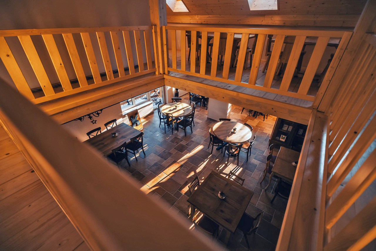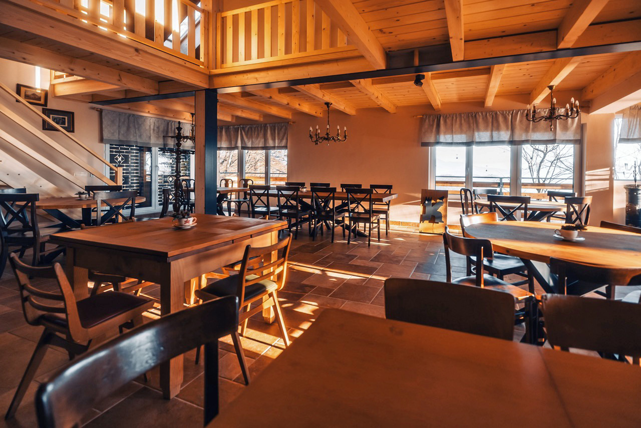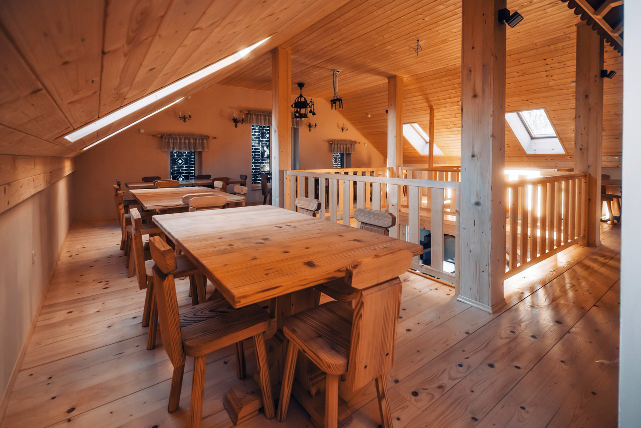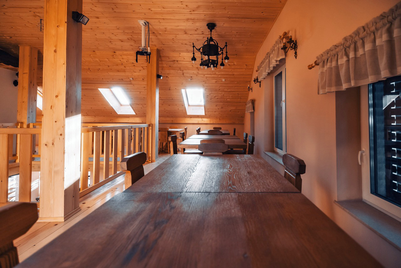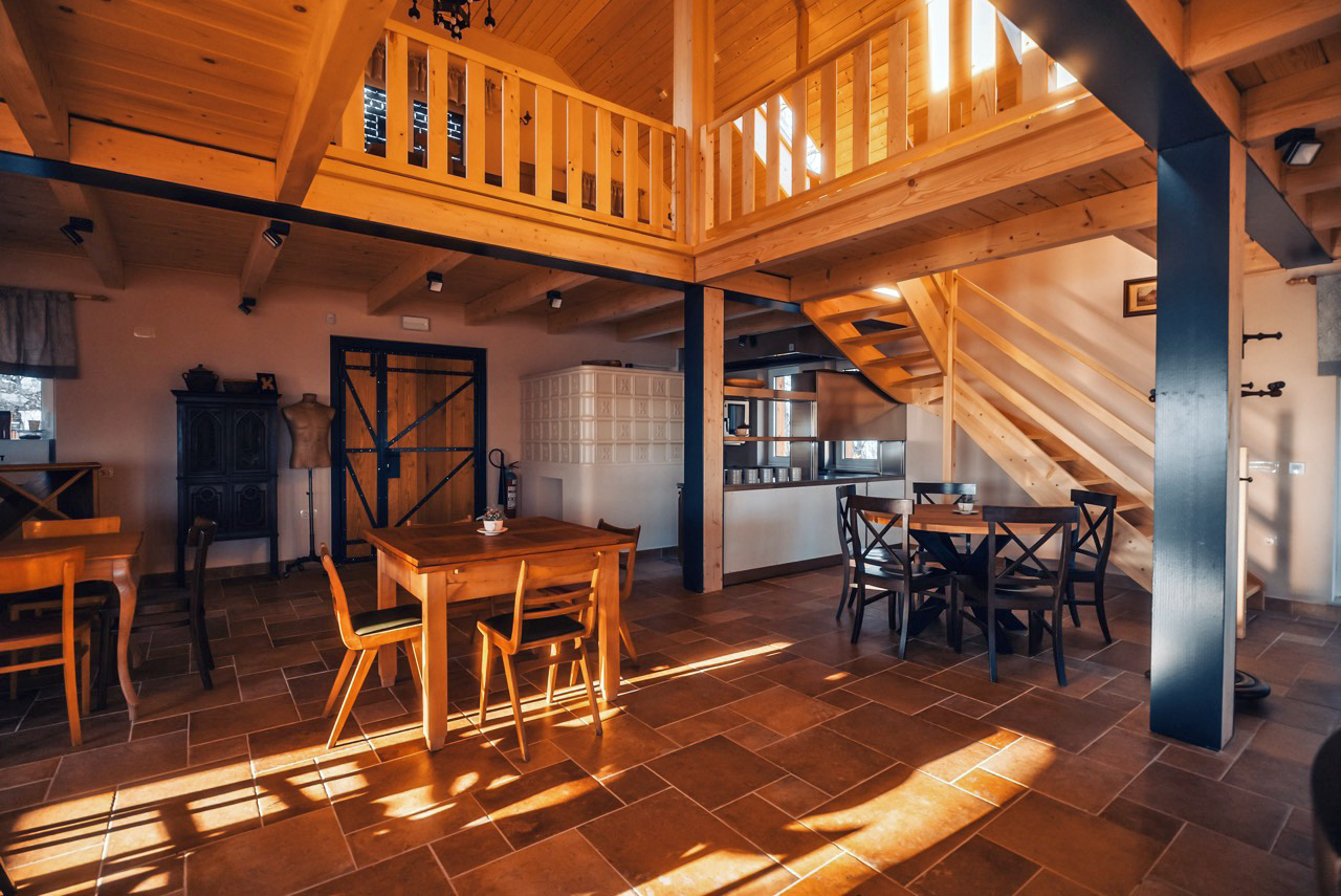 The main building is 286 sqm and provides a large main area where the kitchen is and tables for guest. This is a large open space with a wooden stove and a kitchen. There is also access to the outside area, balcony and a terrace.