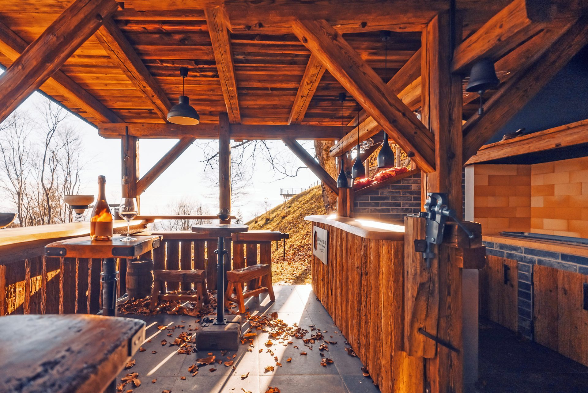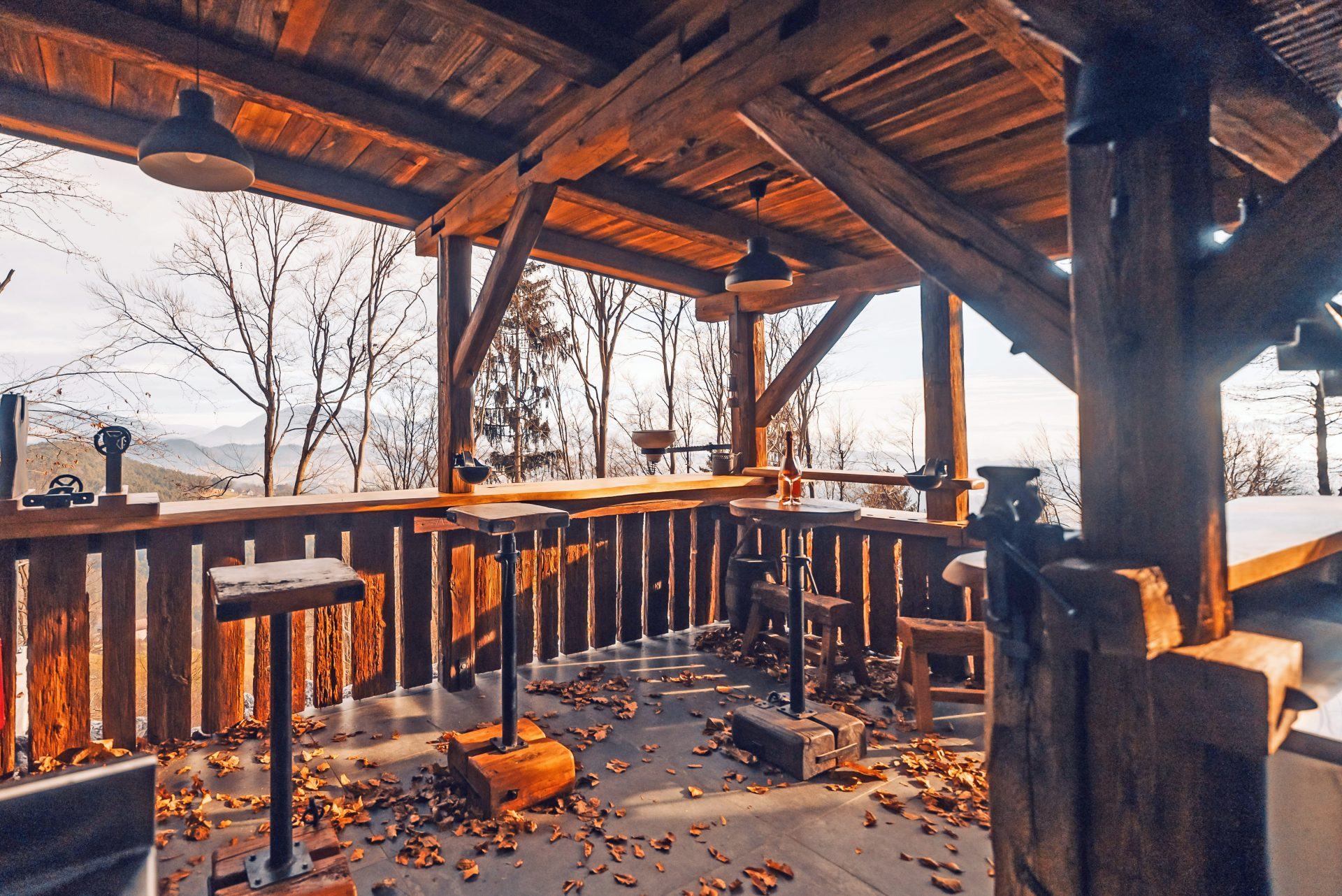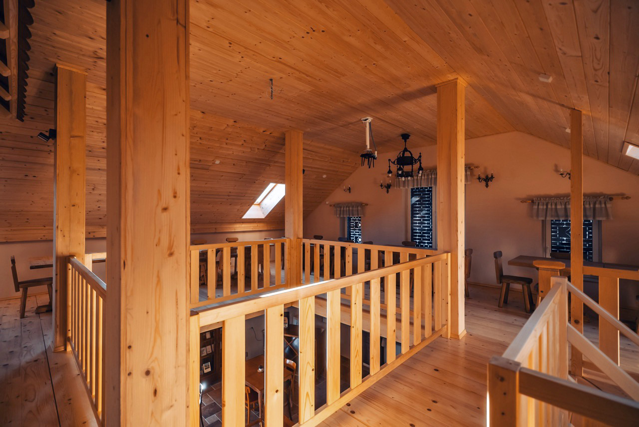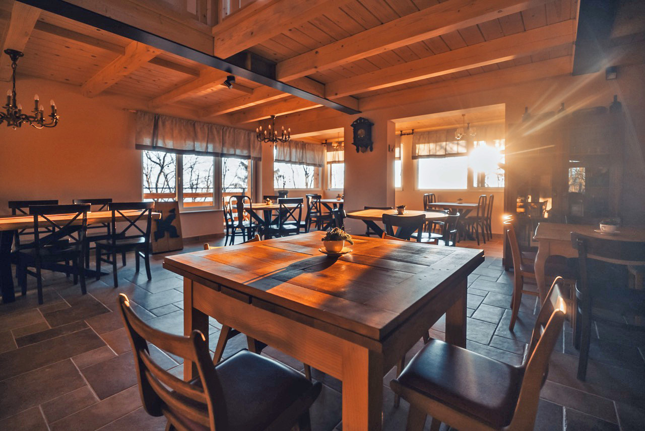 The main building is 286 sqm and provides a large main area where the kitchen is and tables for guest. This is a large open space with a wooden stove and a kitchen. There is also access to the outside area, balcony and a terrace.