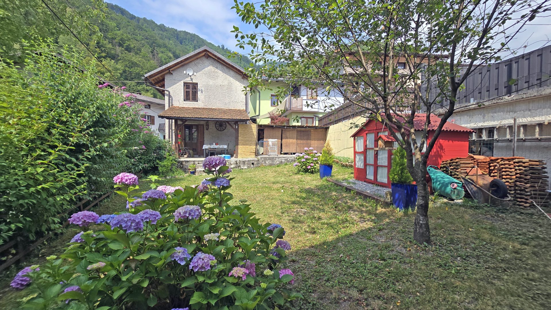 Nestled in a quaint village near the Soča River, this beautifully renovated property features a charming house with stunning mountain and garden views.