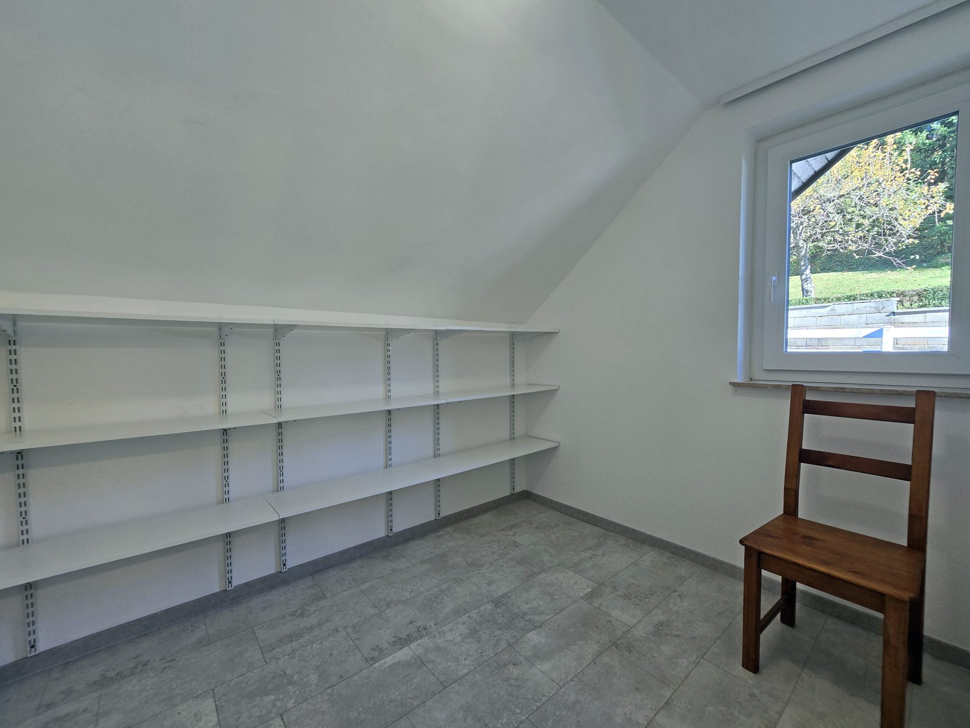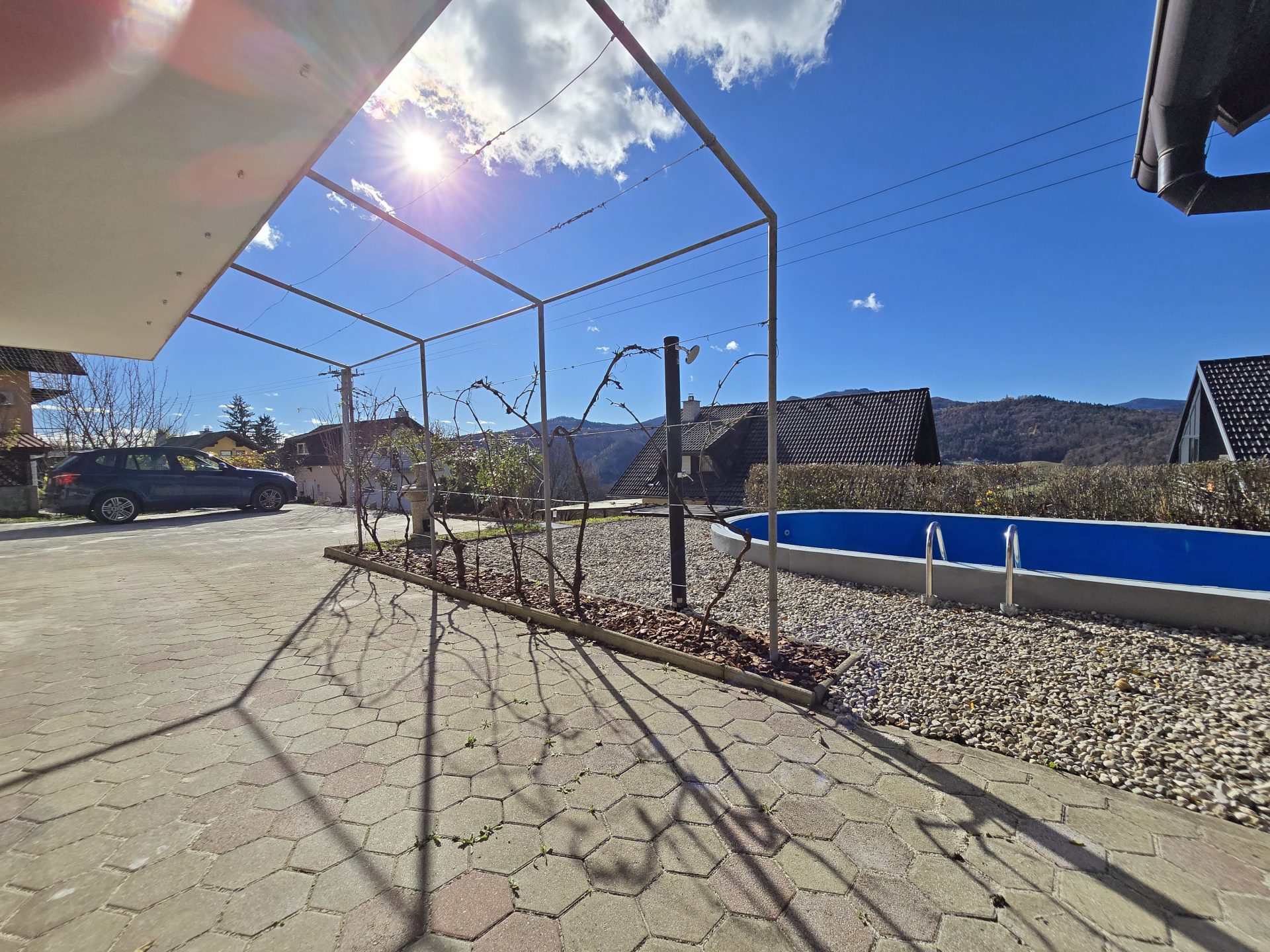 Outdoors, the property boasts a swimming pool with its own technical room for maintenance, as well as a large wooden storage area attached to the house and an additional smaller storage space for tools or equipment. In front of the house, there is parking for up to five cars, complementing the internal garage.