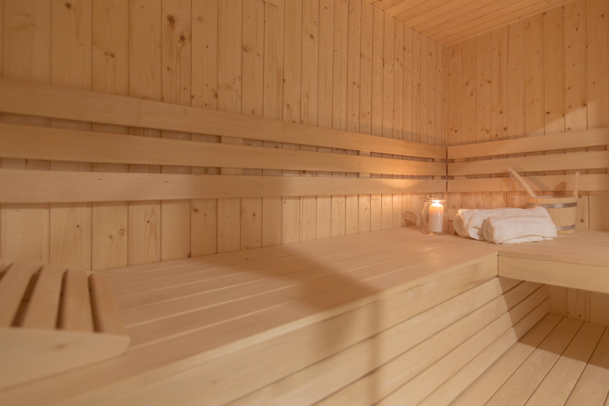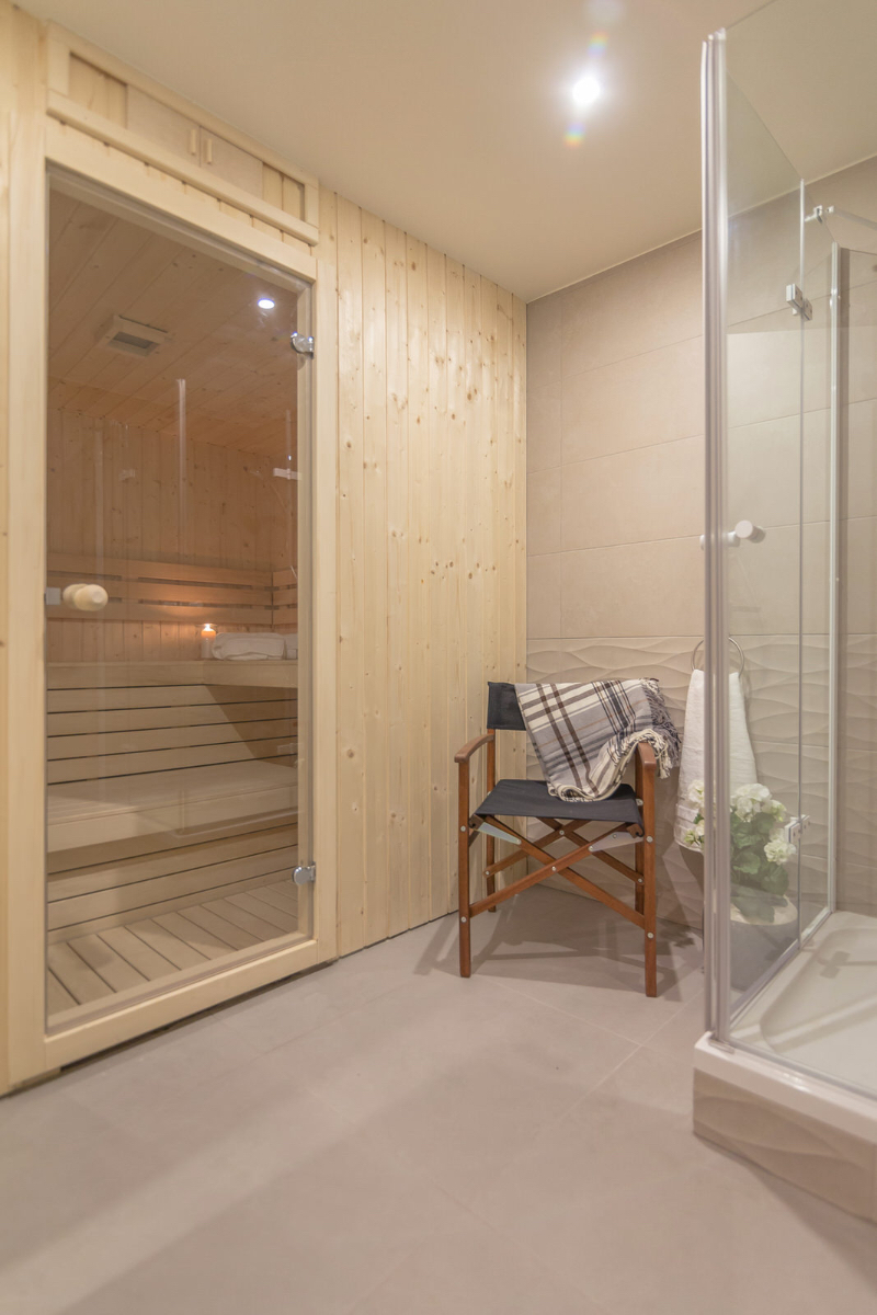 There is a lower level that is set up as a TV area with flatscreen TV and relaxing sofa. There is also a good size sauna and shower area.