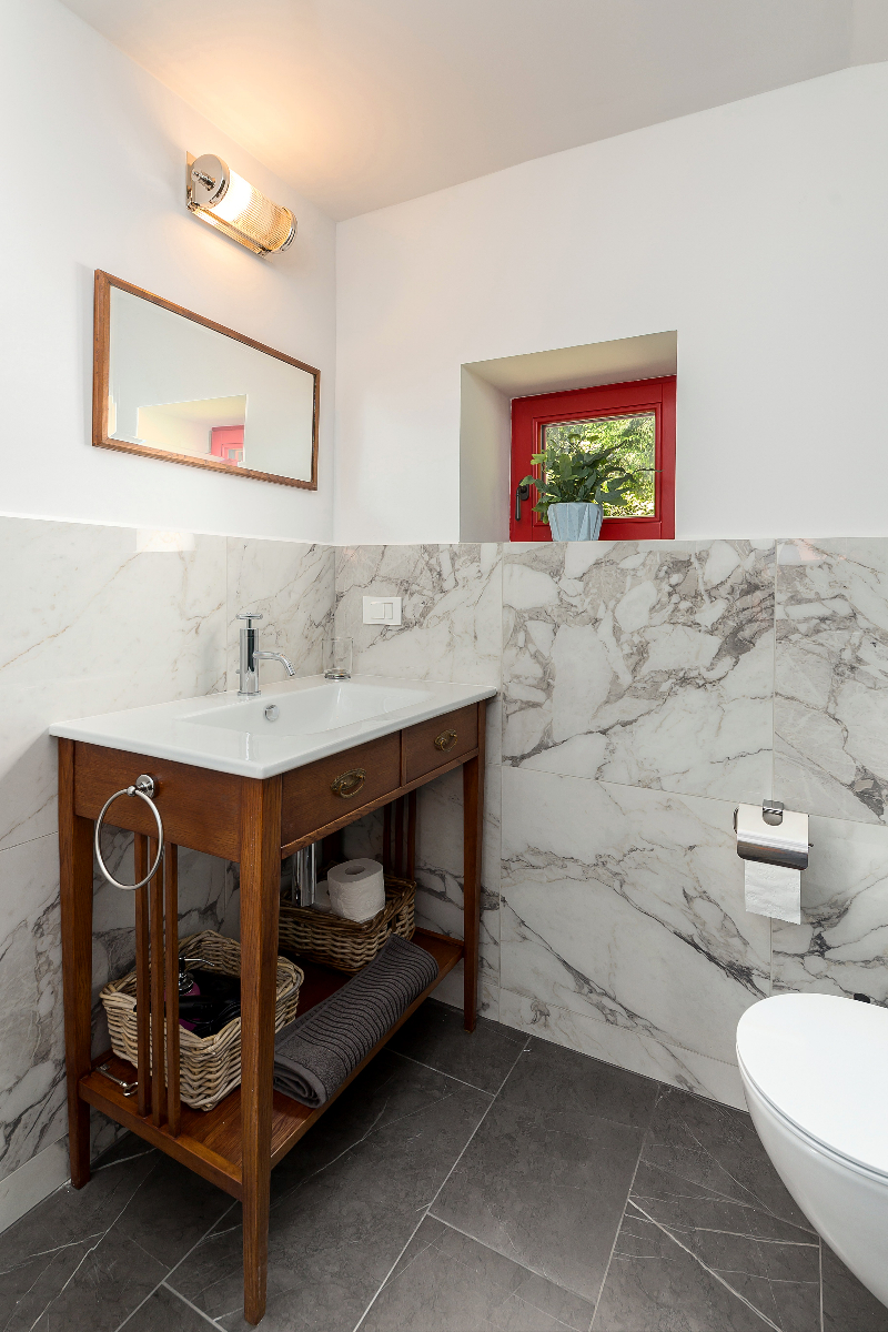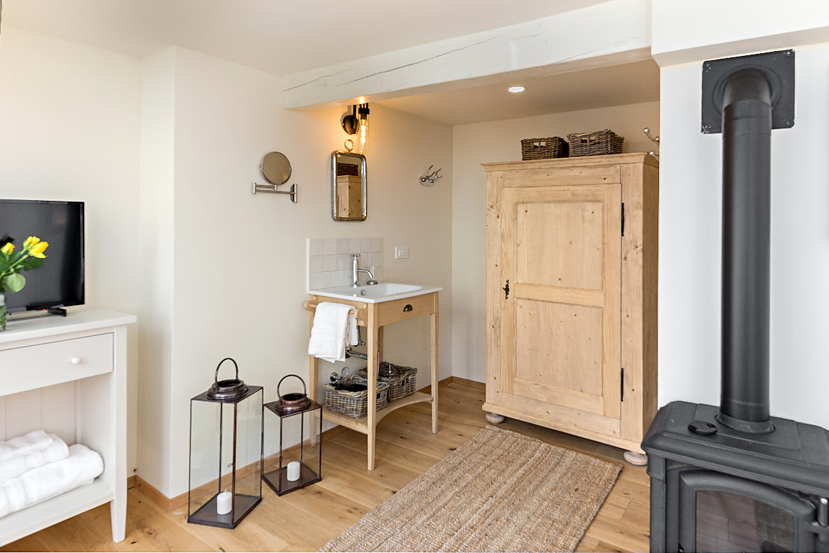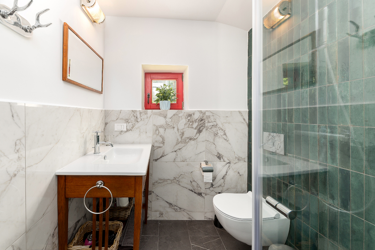 Two beautiful bedrooms, the one on the top floor has air conditioning. The Ground floor bedroom has direct access to the garden and also has a fireplace for winter nights.