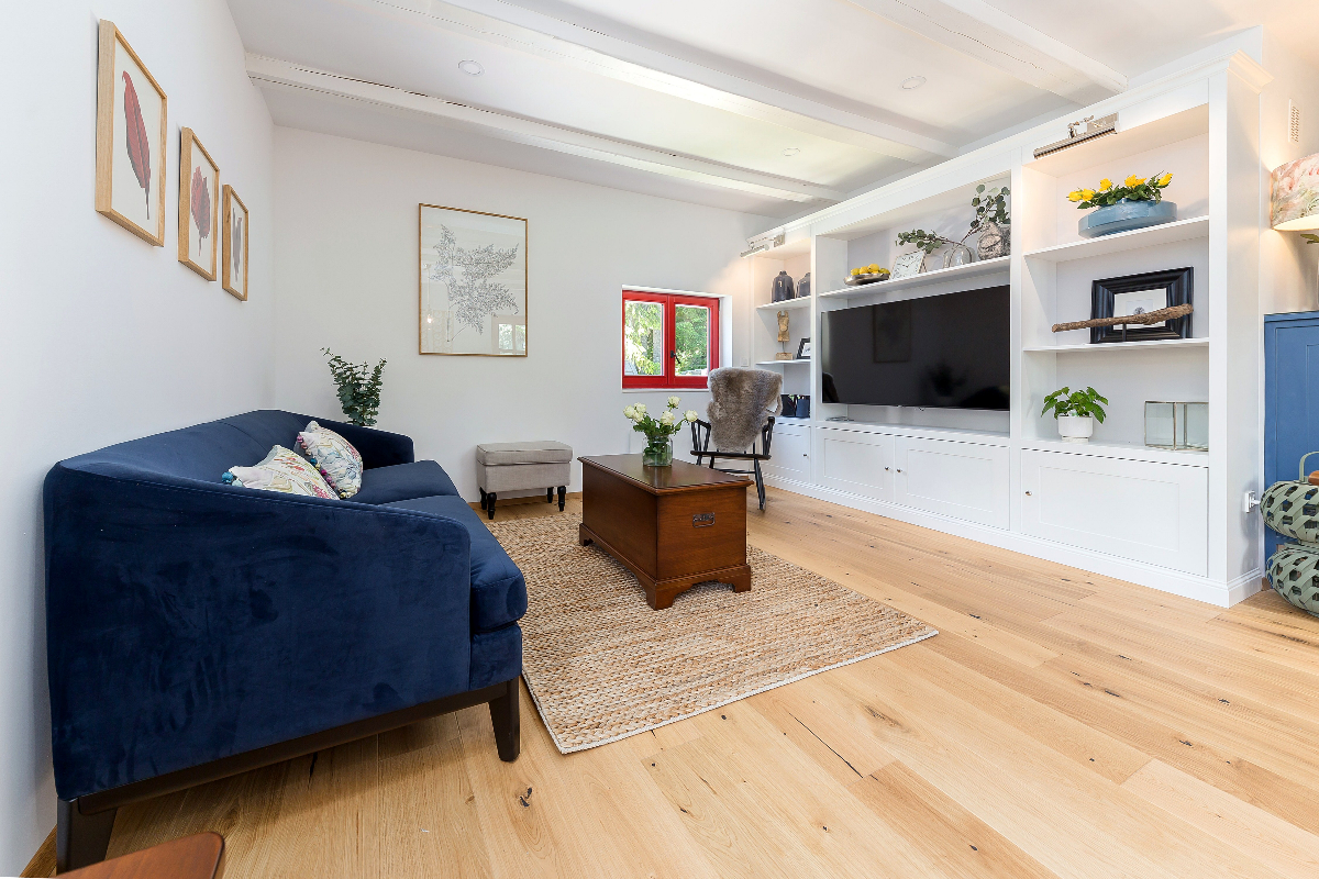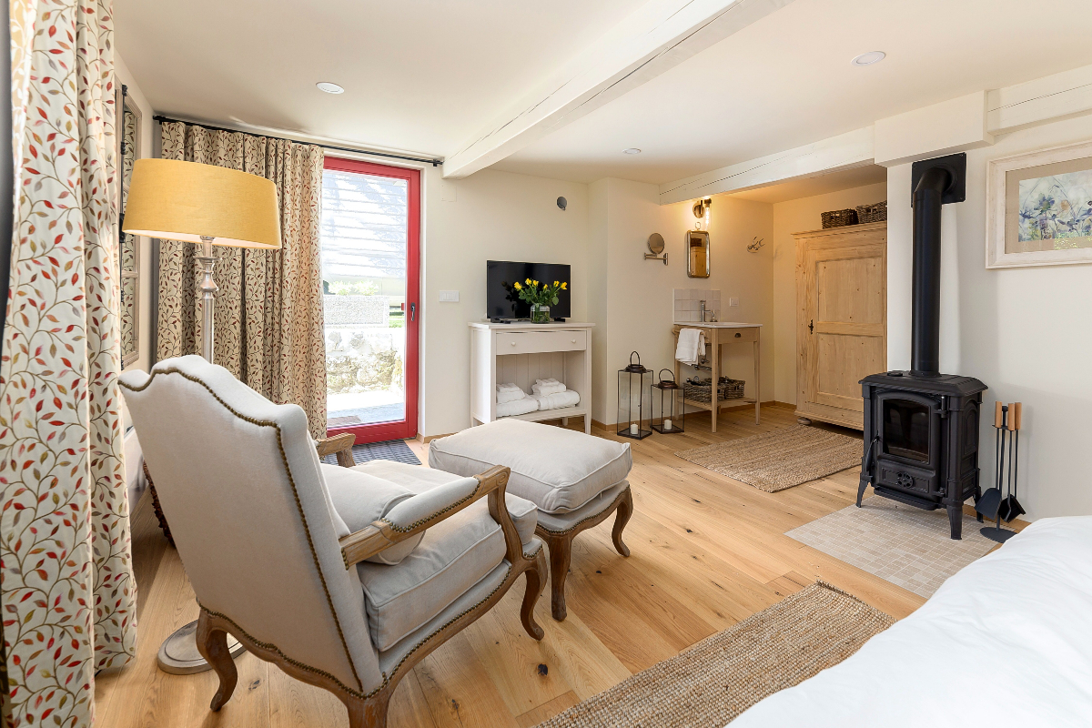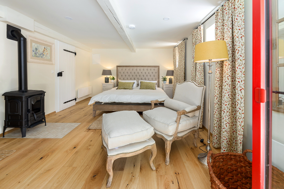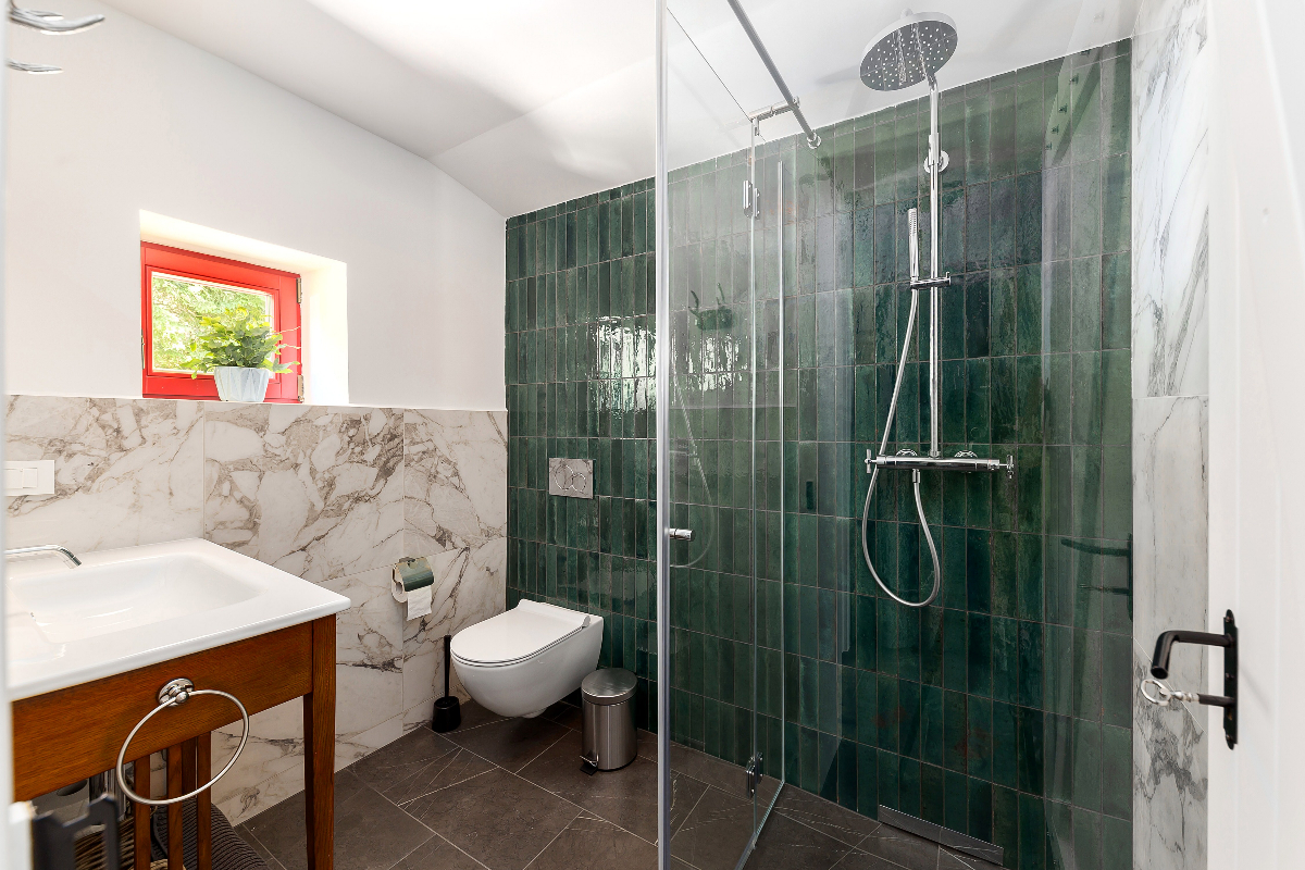 Two beautiful bedrooms, the one on the top floor has air conditioning. The Ground floor bedroom has direct access to the garden and also has a fireplace for winter nights.