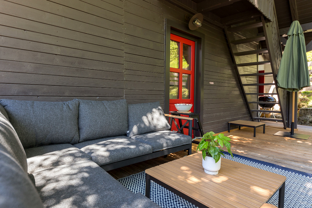 The views to the mountains are superb and and quiet is magical up here, the house has a stream running through the property and offers a great outdoor area sofa and dining table.