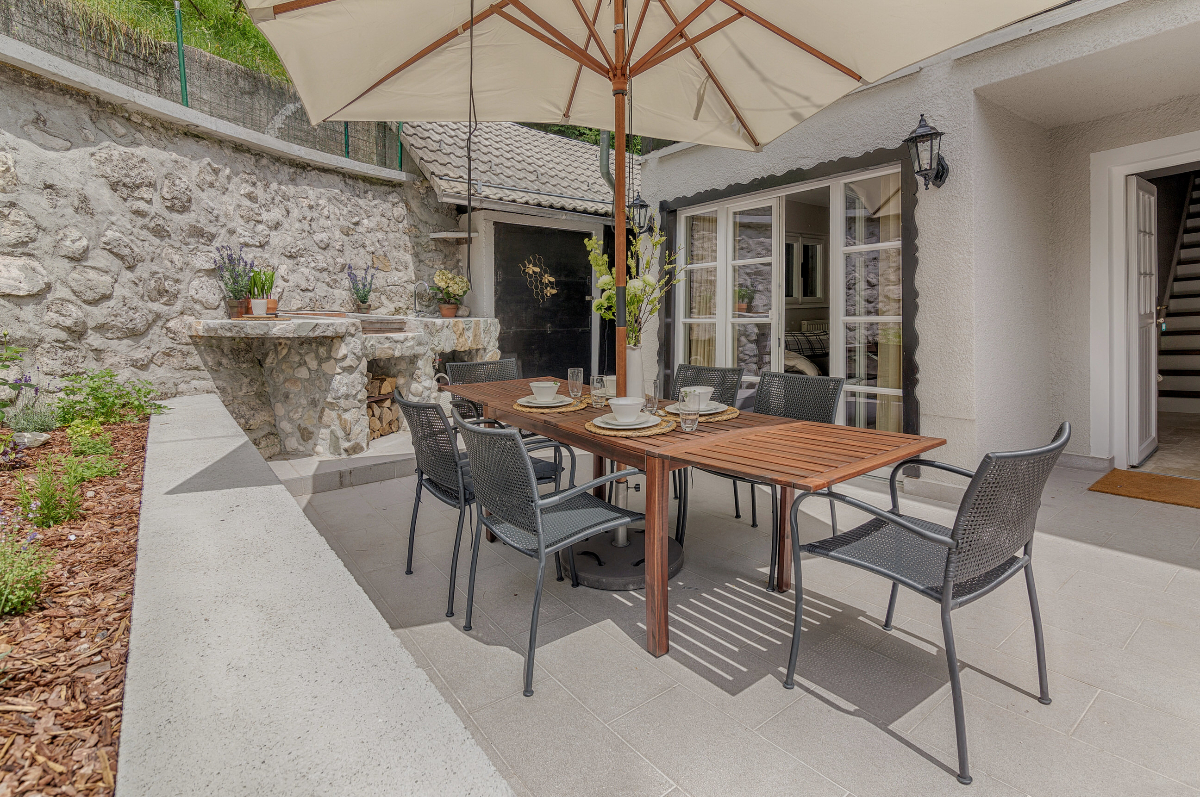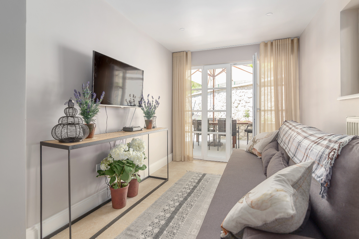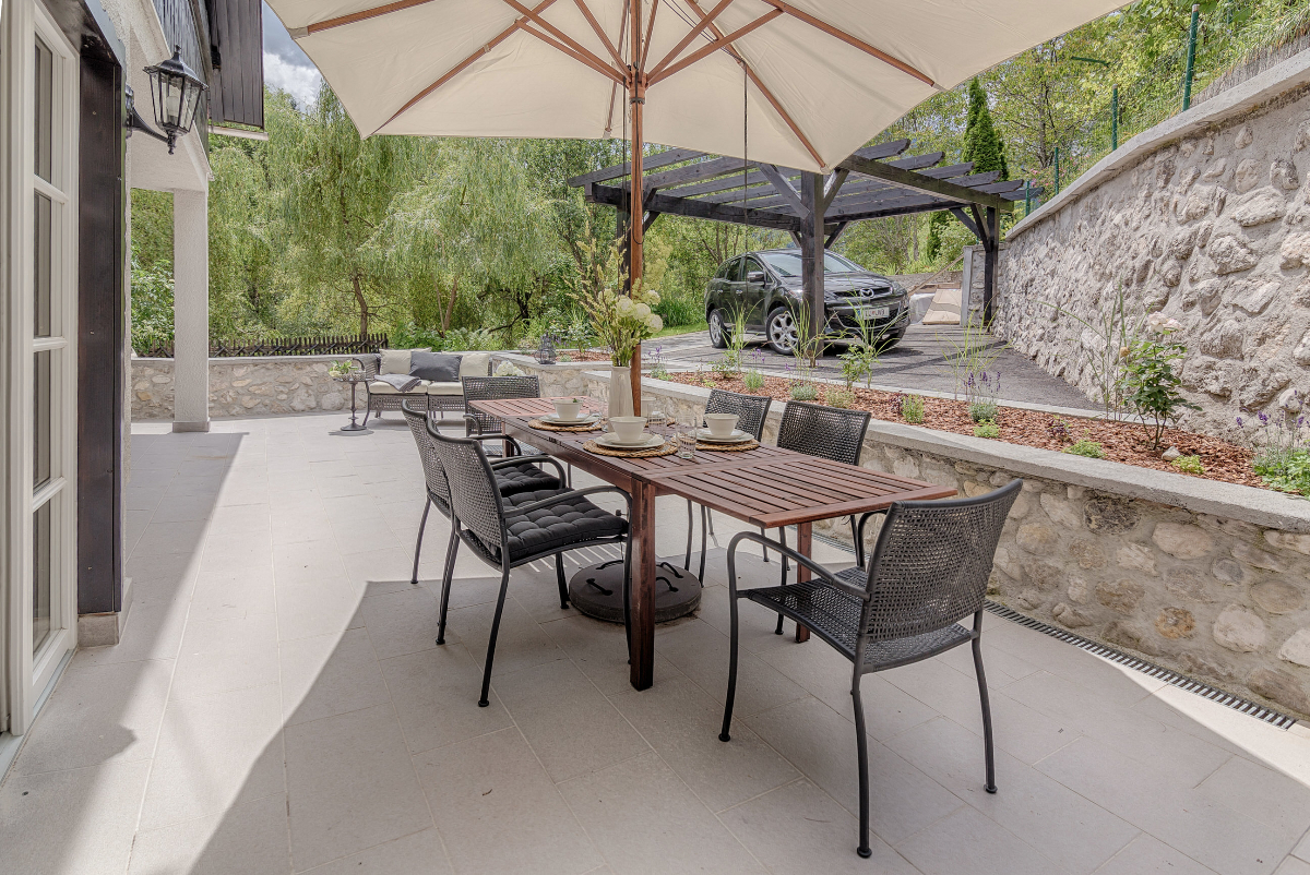 Lovely outside terrace with sofas, dining table and chairs. Built in BBQ and parking for 2 cars.