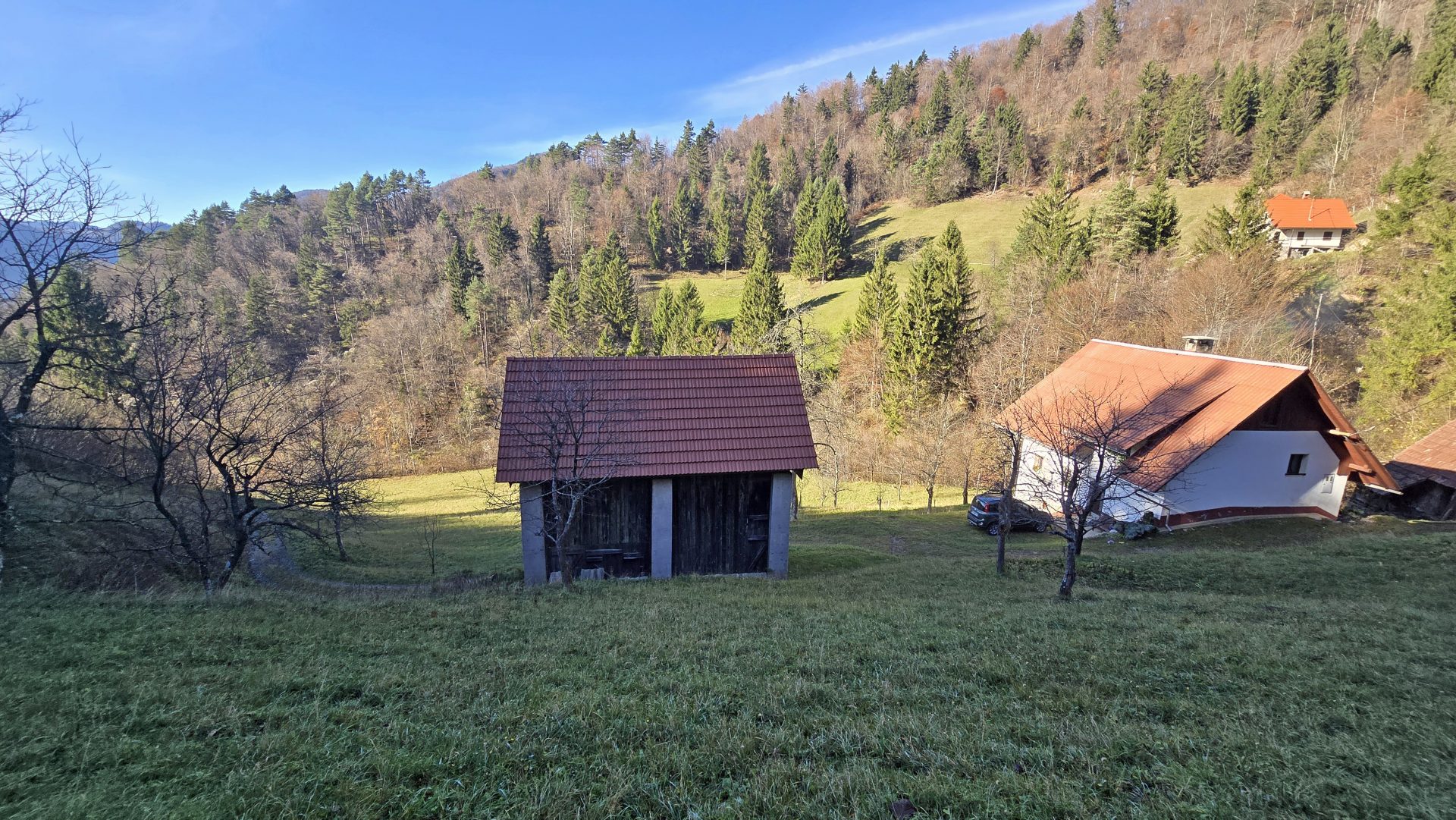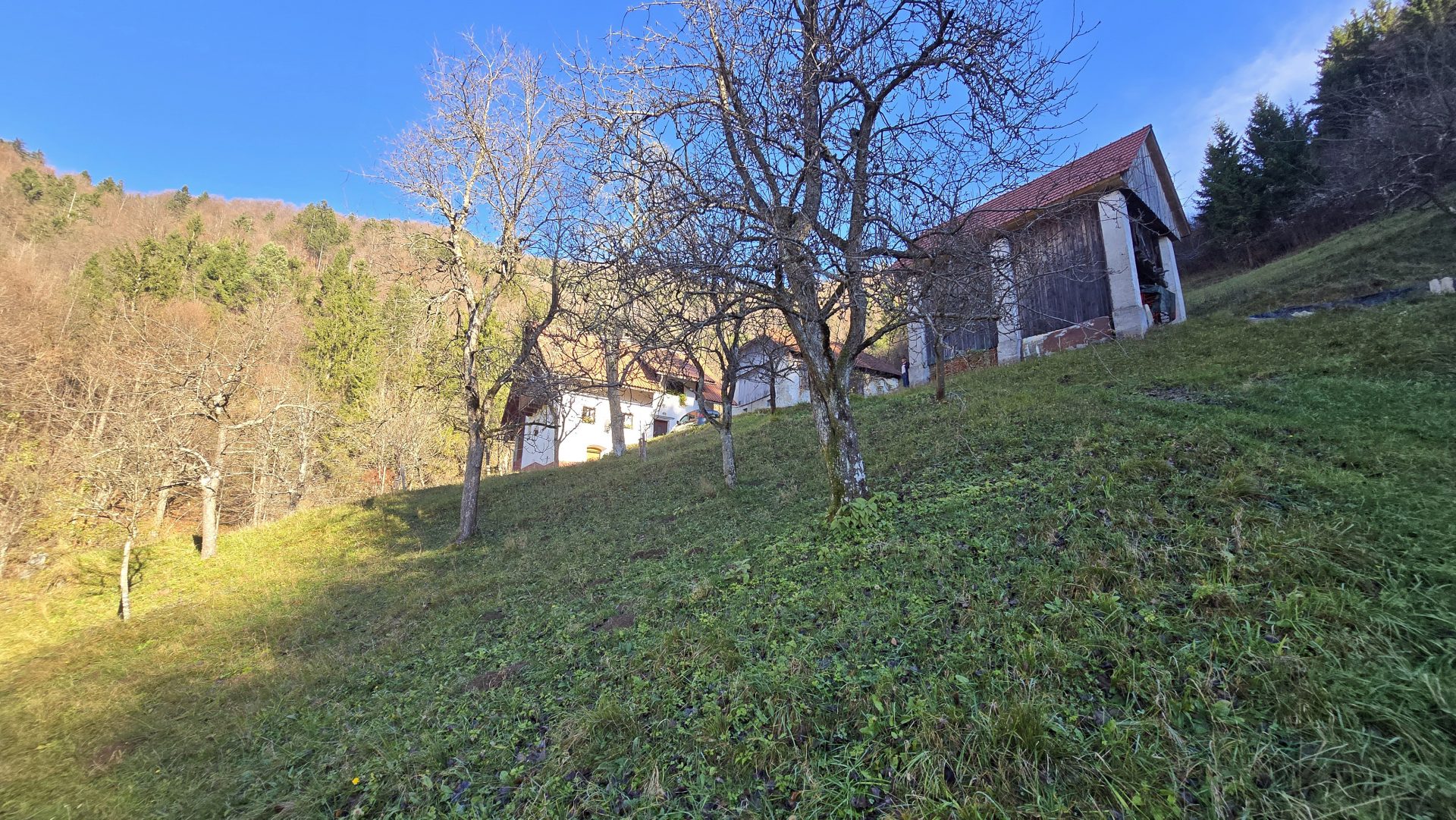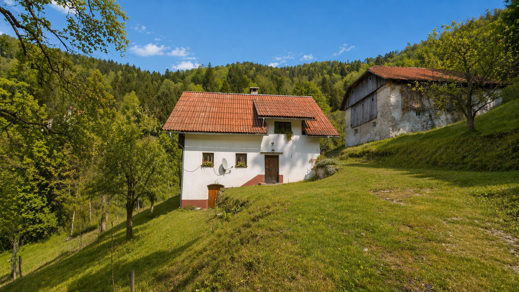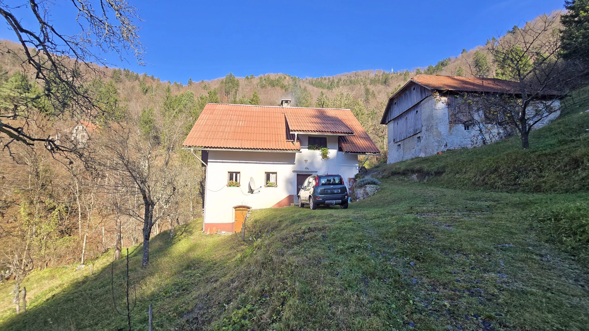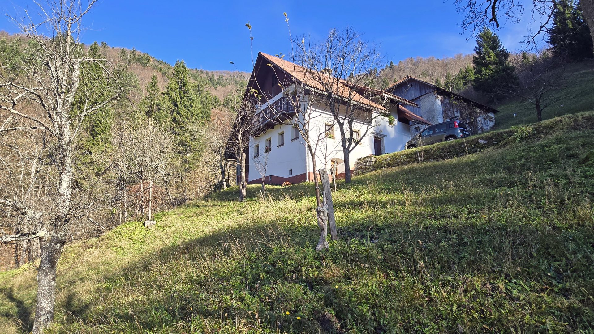 In an idyllic natural setting above Spodnja Idrija, a unique and peaceful estate is for sale, covering a total area of 13.8 hectares (137,933 sqm) of meadows and forest.