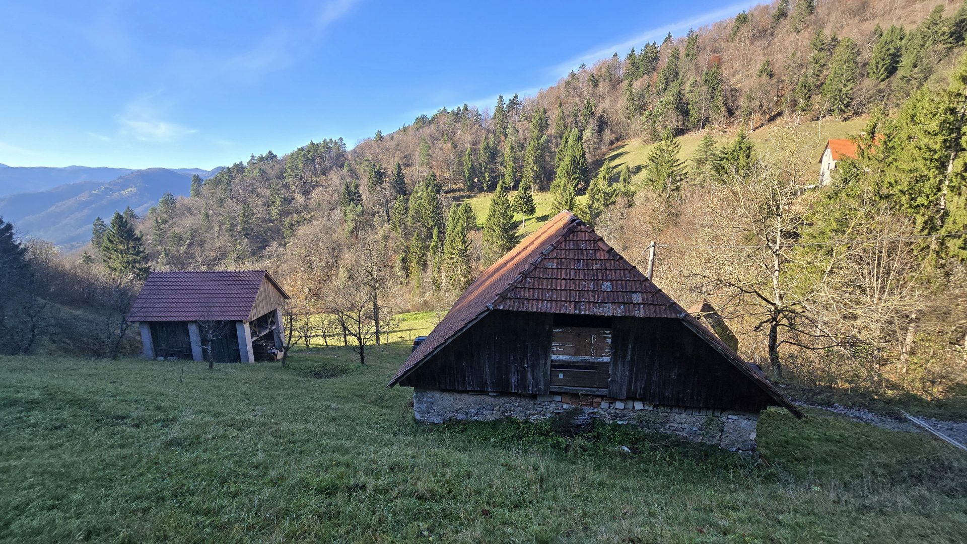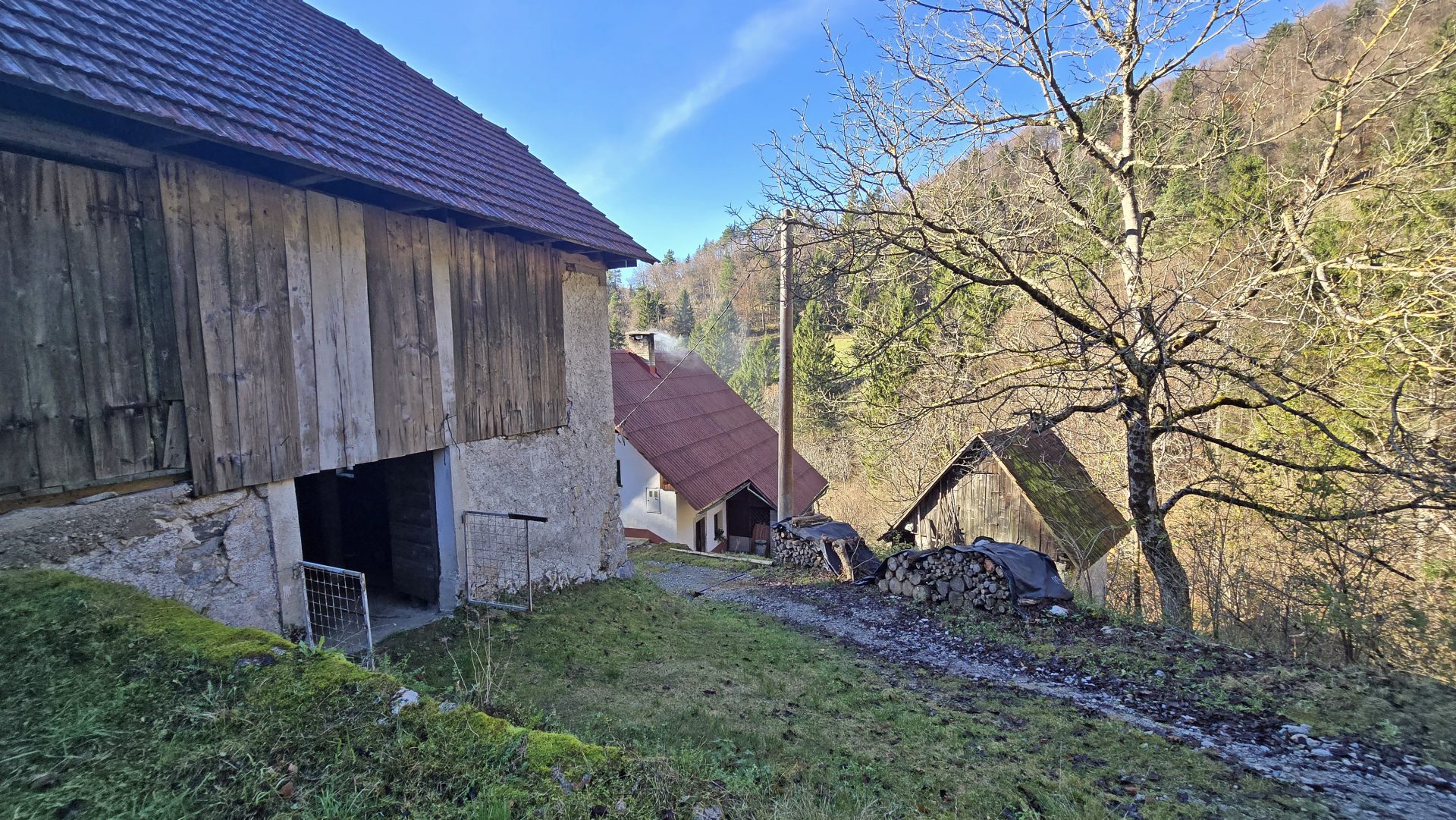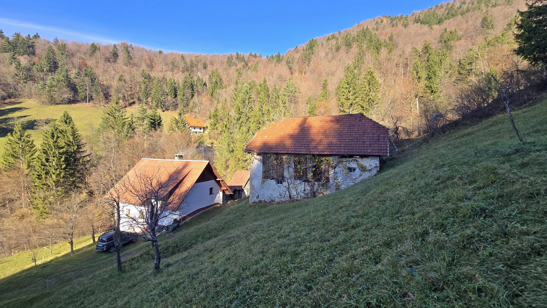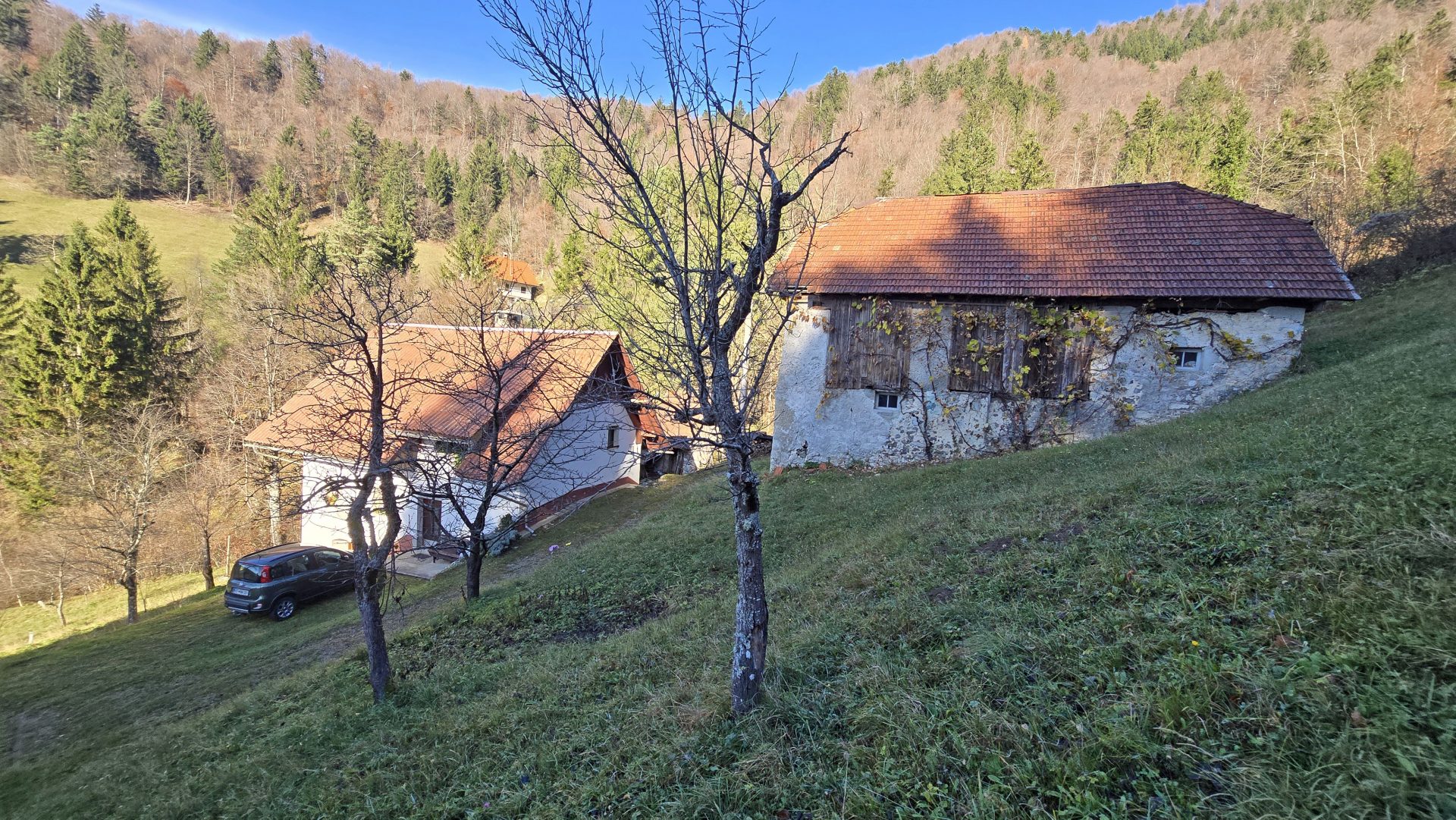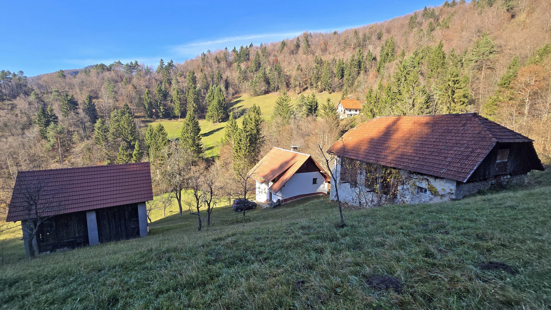 In an idyllic natural setting above Spodnja Idrija, a unique and peaceful estate is for sale, covering a total area of 13.8 hectares (137,933 sqm) of meadows and forest.