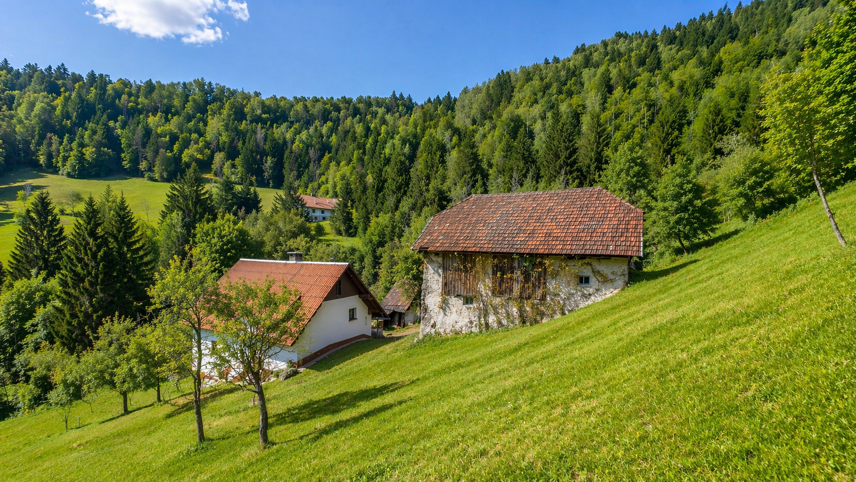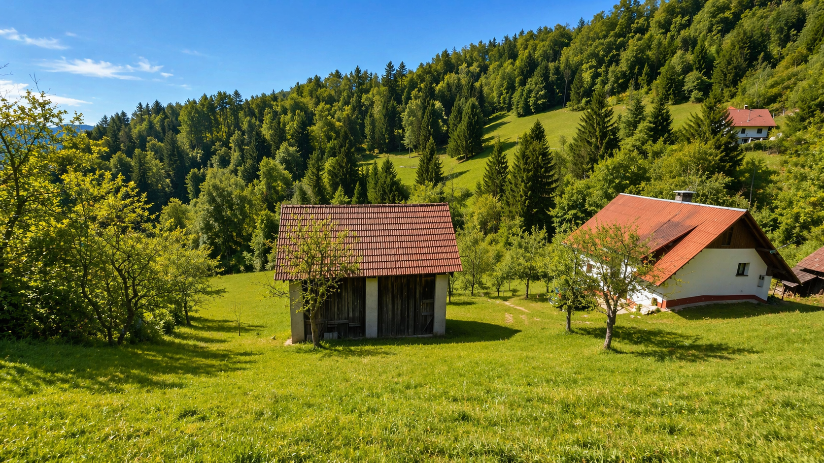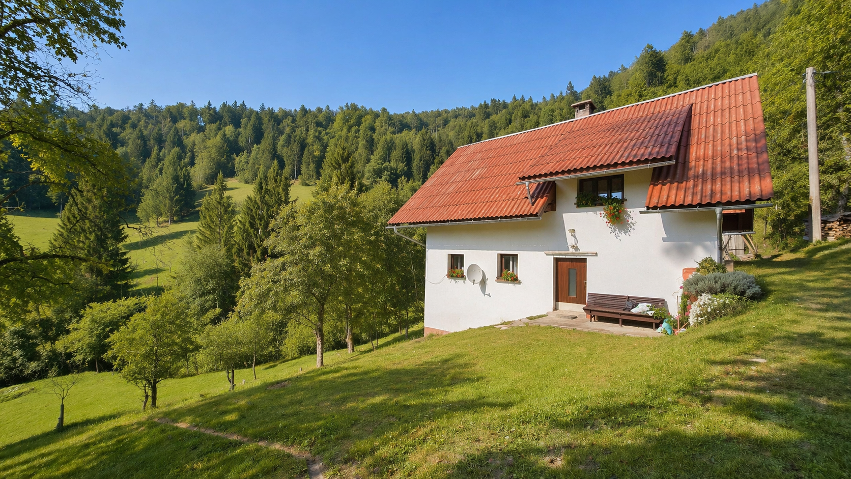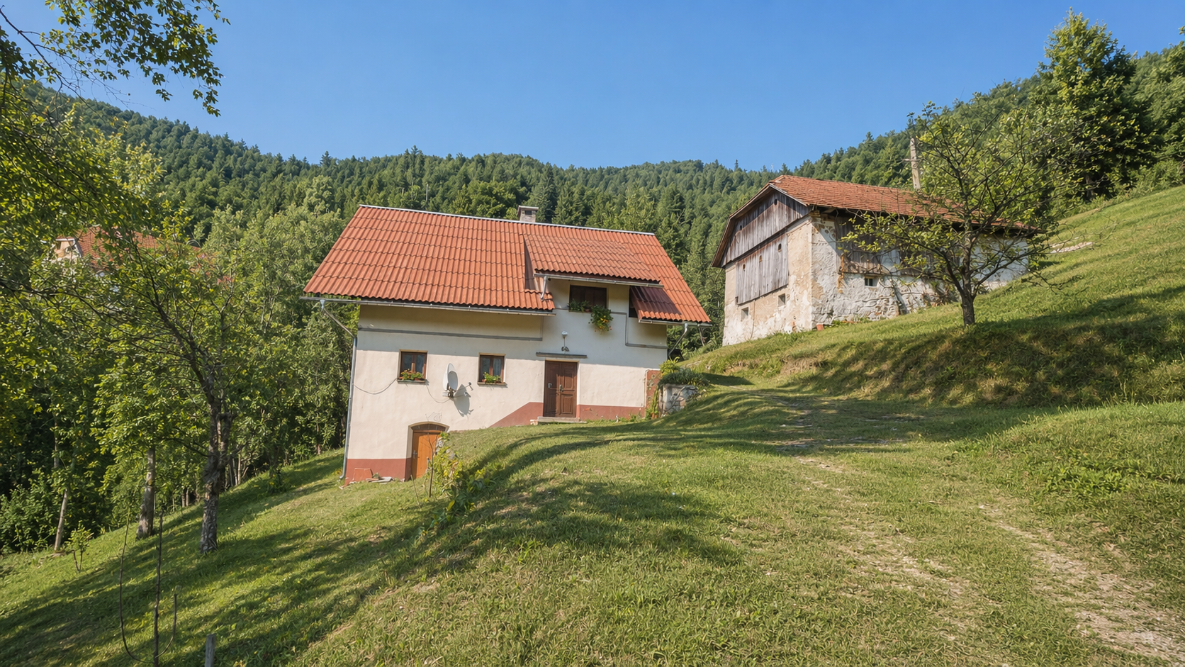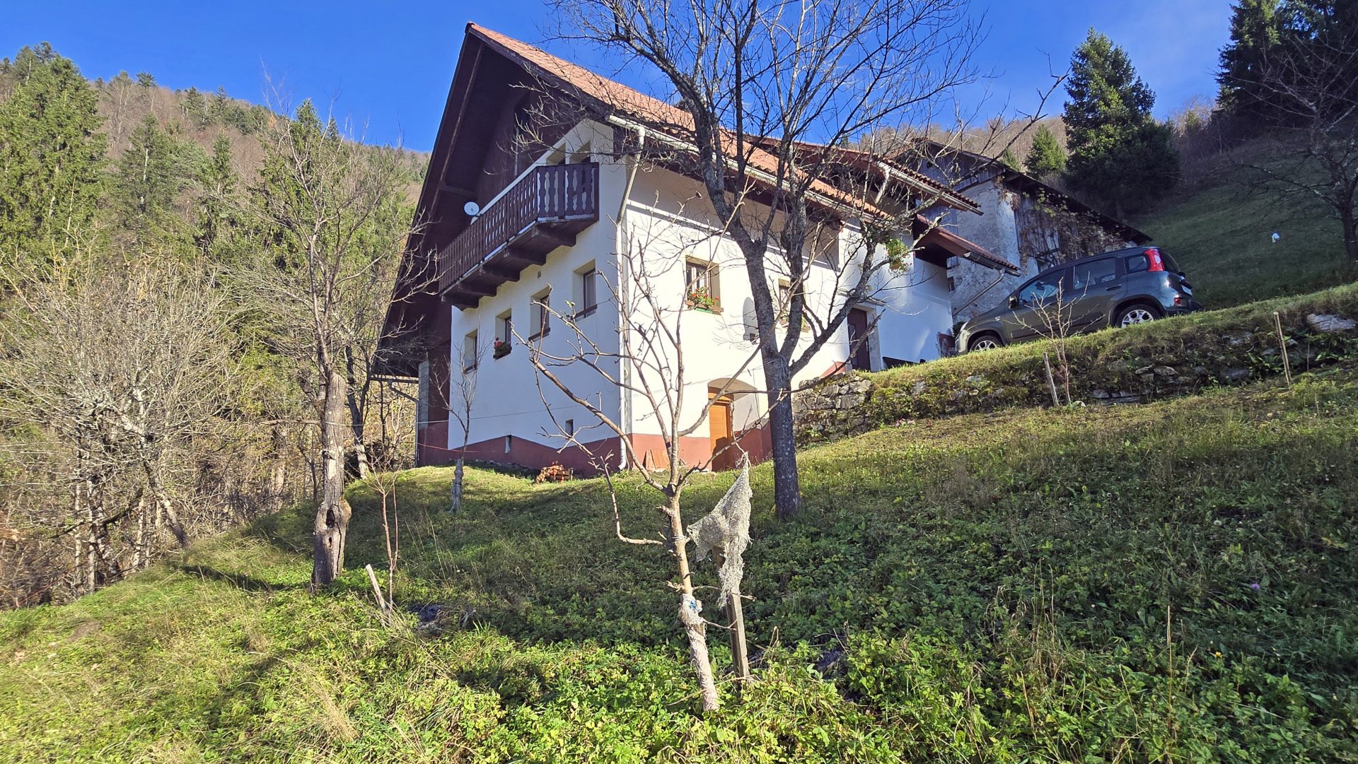 In an idyllic natural setting above Spodnja Idrija, a unique and peaceful estate is for sale, covering a total area of 13.8 hectares (137,933 sqm) of meadows and forest.