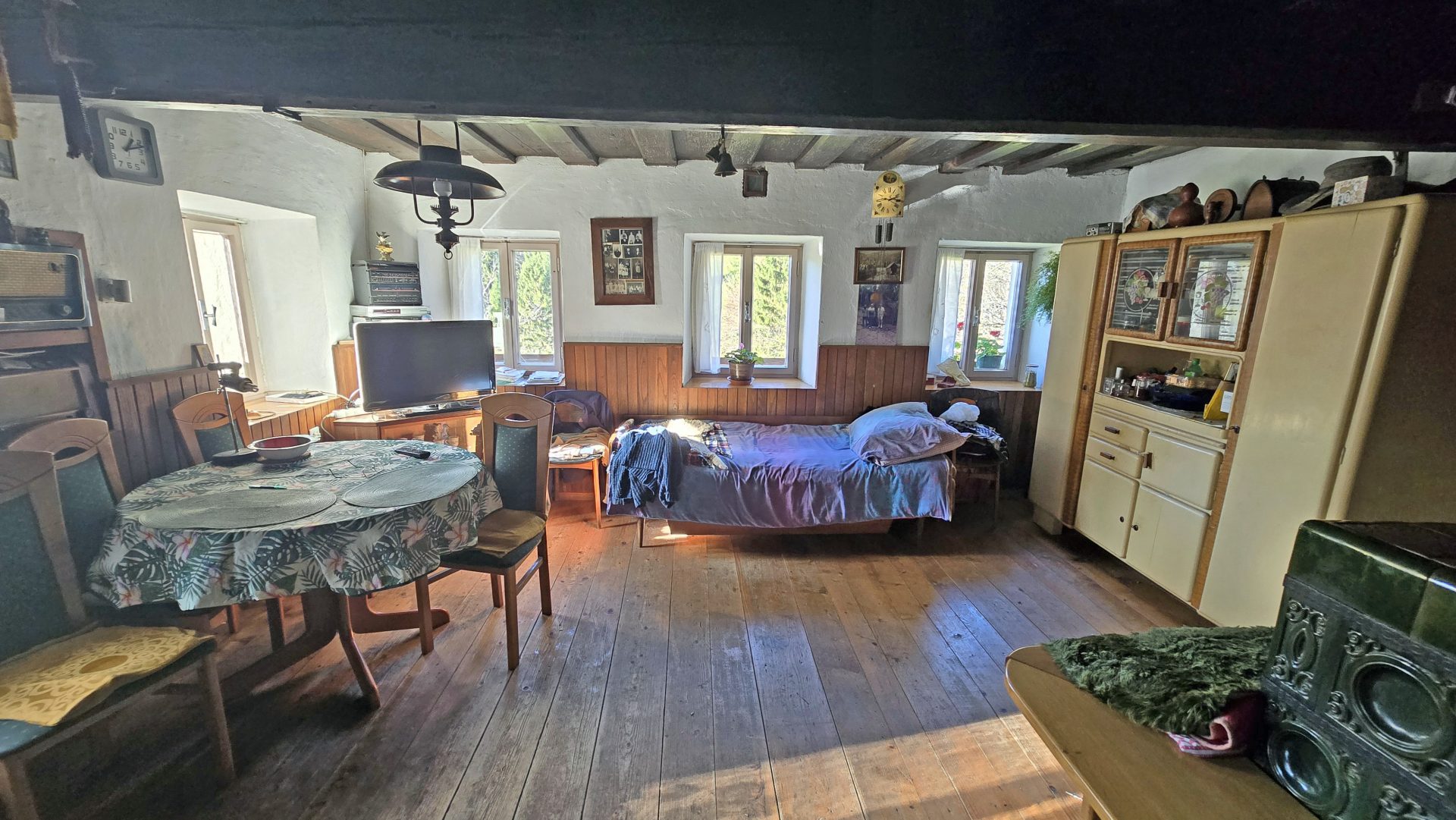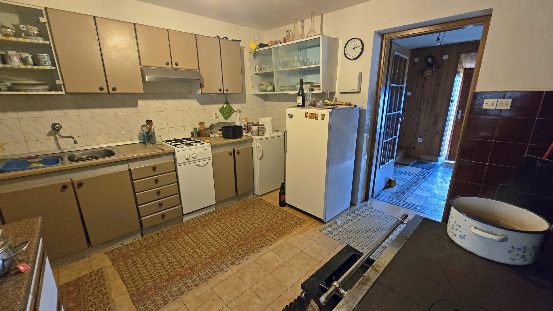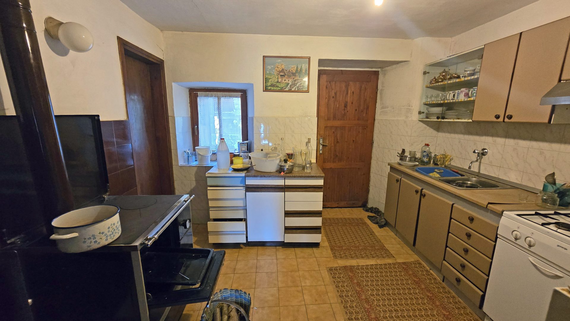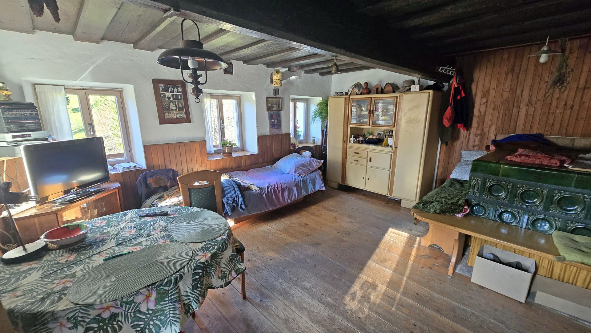 The property features a residential house built in 1850, with a total living area of 120 sqm, arranged over three floors.The ground floor comprises an entrance hall, a kitchen with dining area, a bathroom, and a spacious living room with a traditional ceramic stove, creating a warm and cozy atmosphere.