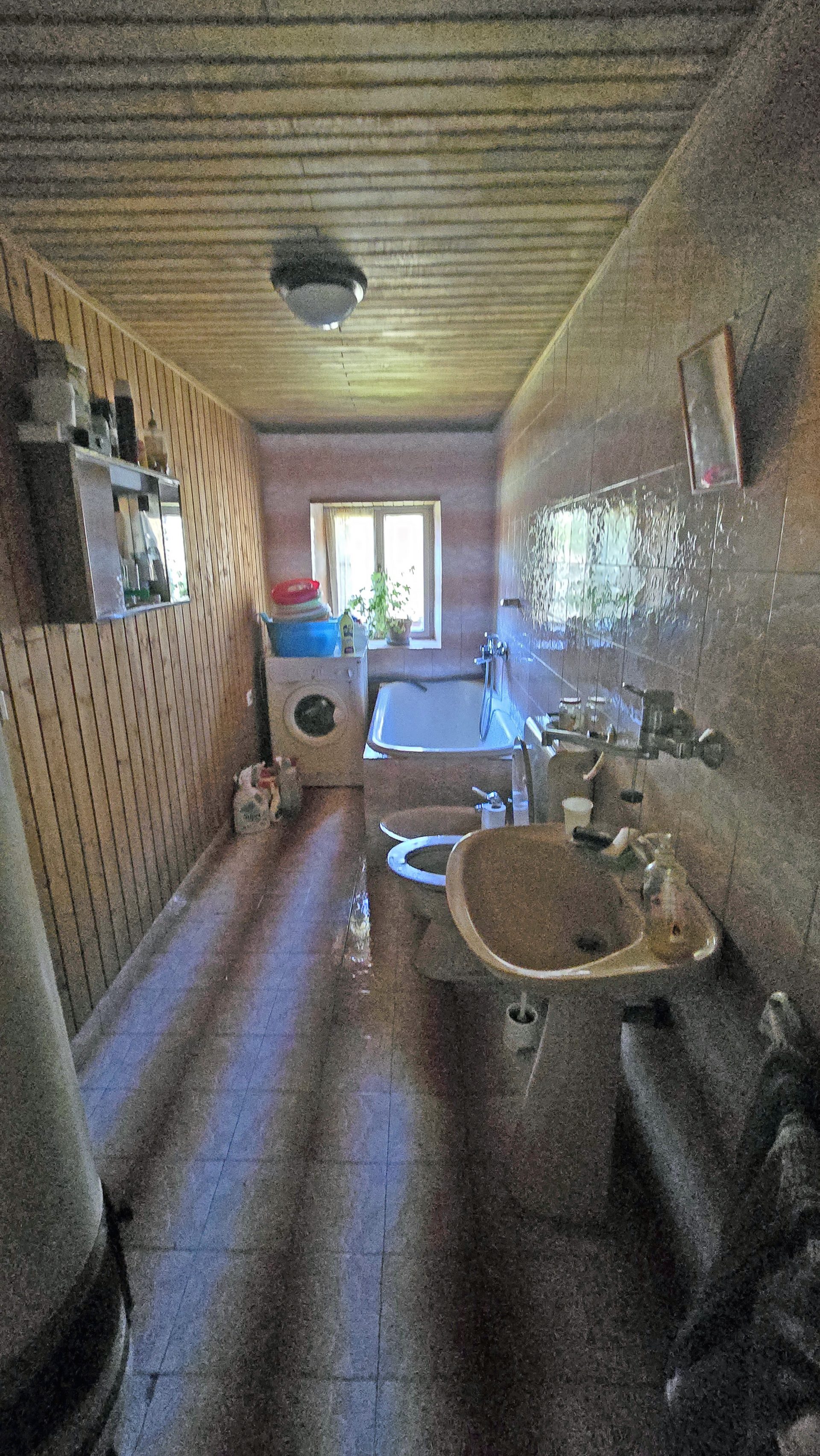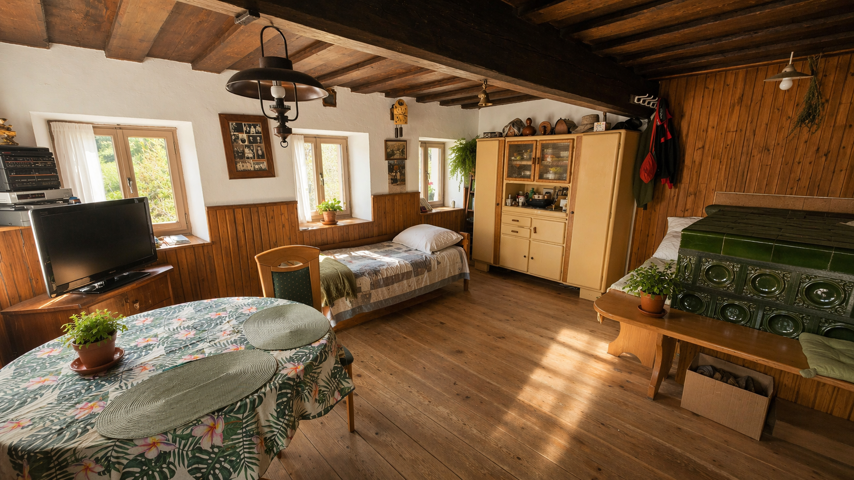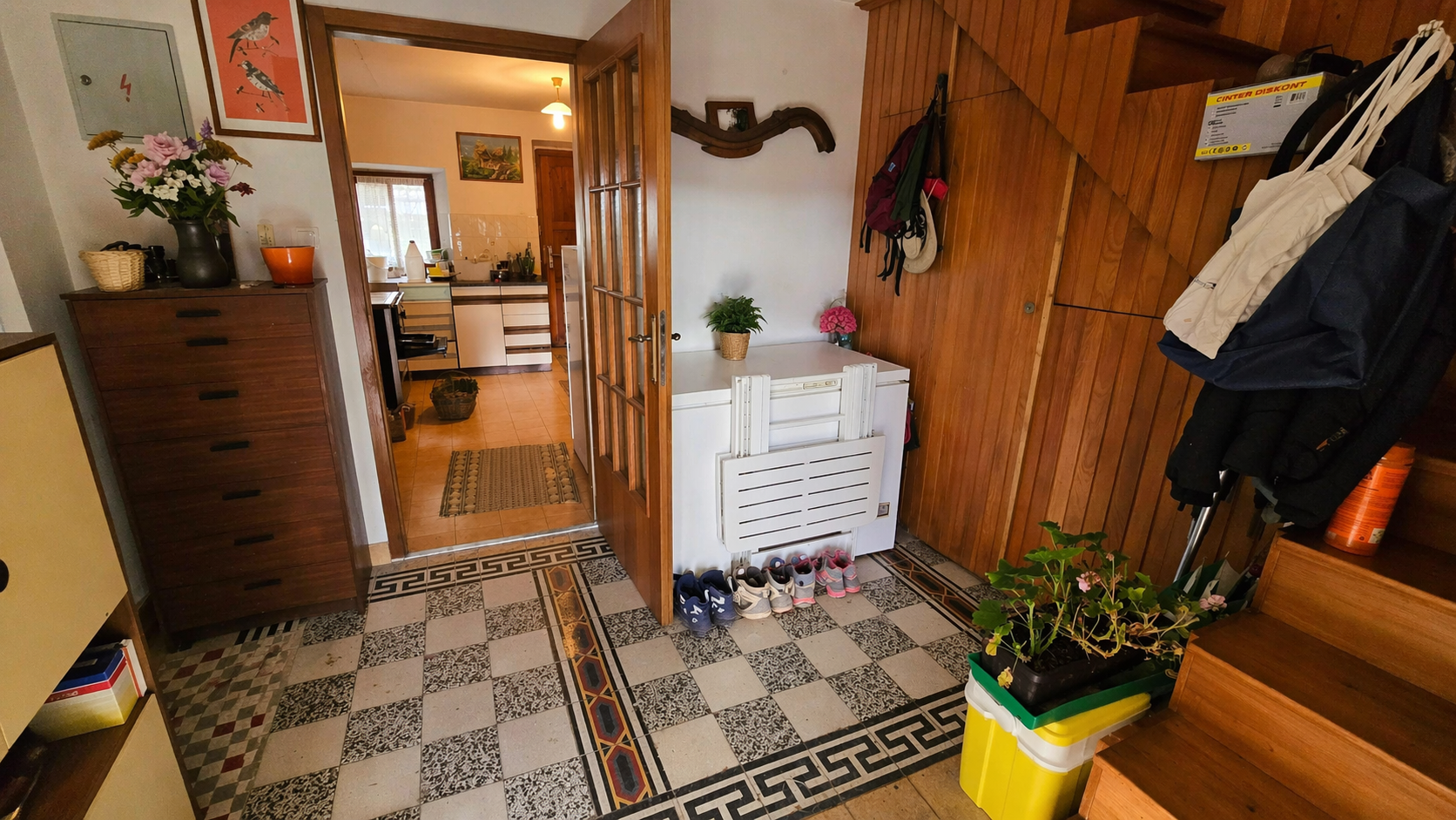The property features a residential house built in 1850, with a total living area of 120 sqm, arranged over three floors.The ground floor comprises an entrance hall, a kitchen with dining area, a bathroom, and a spacious living room with a traditional ceramic stove, creating a warm and cozy atmosphere.