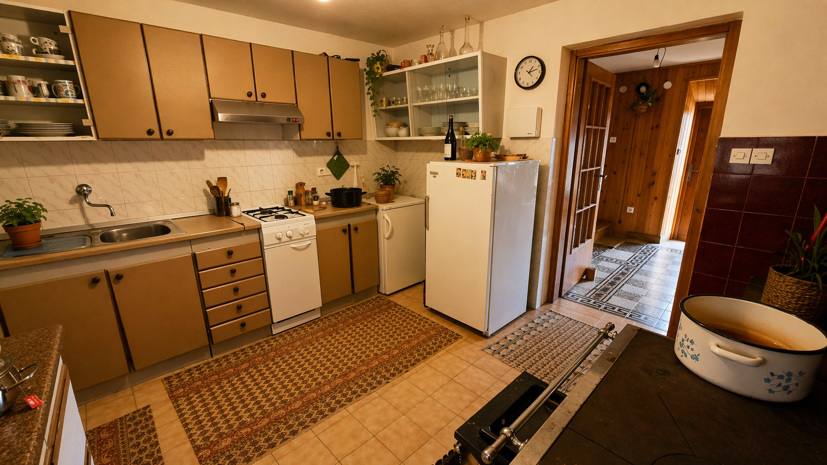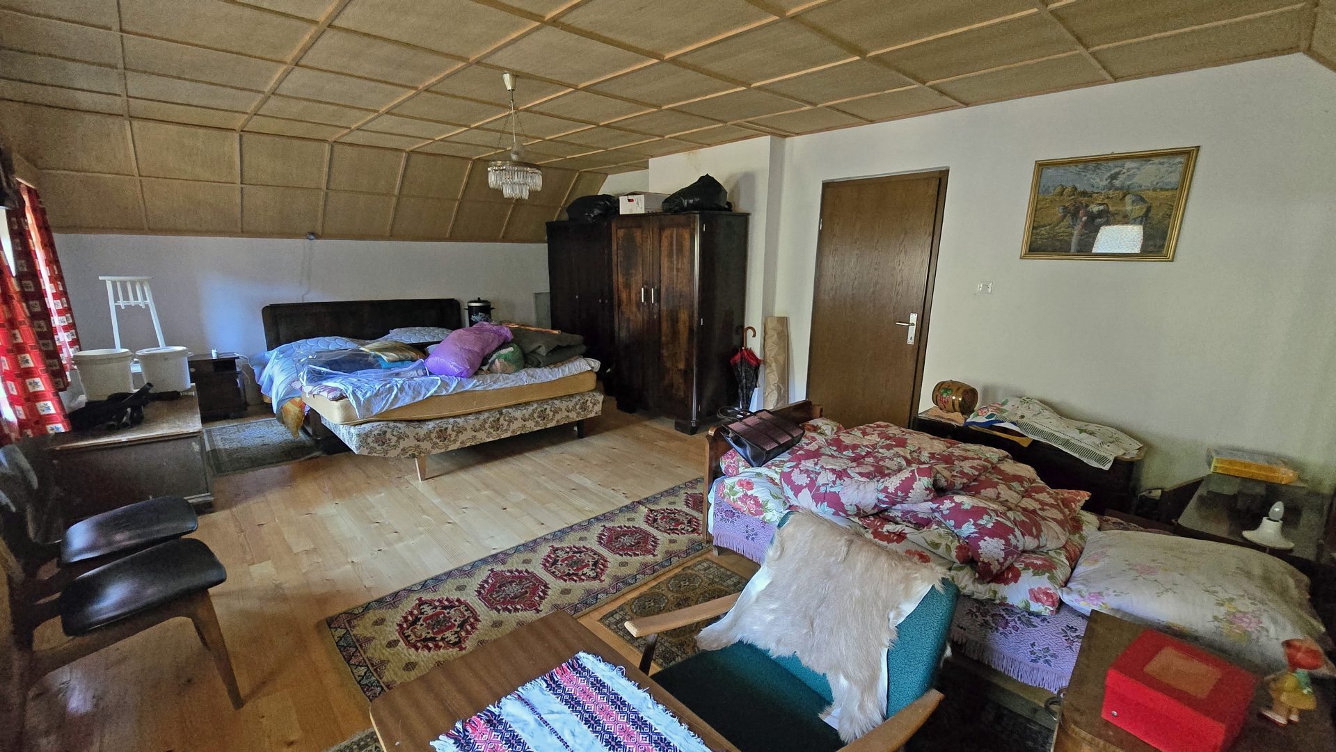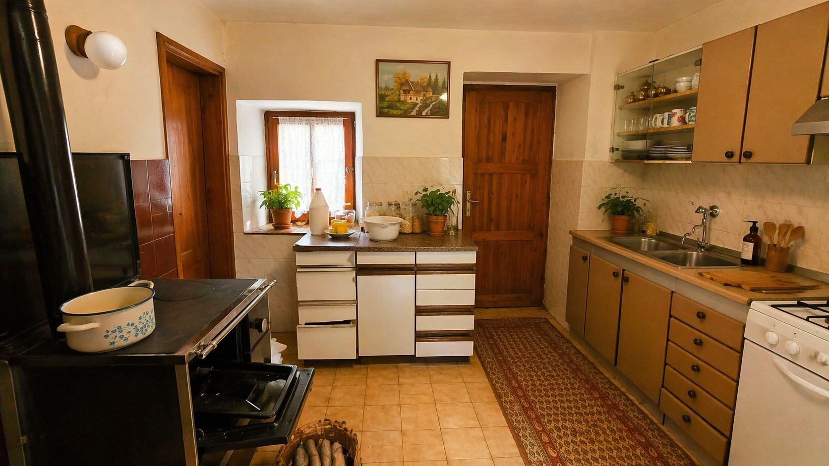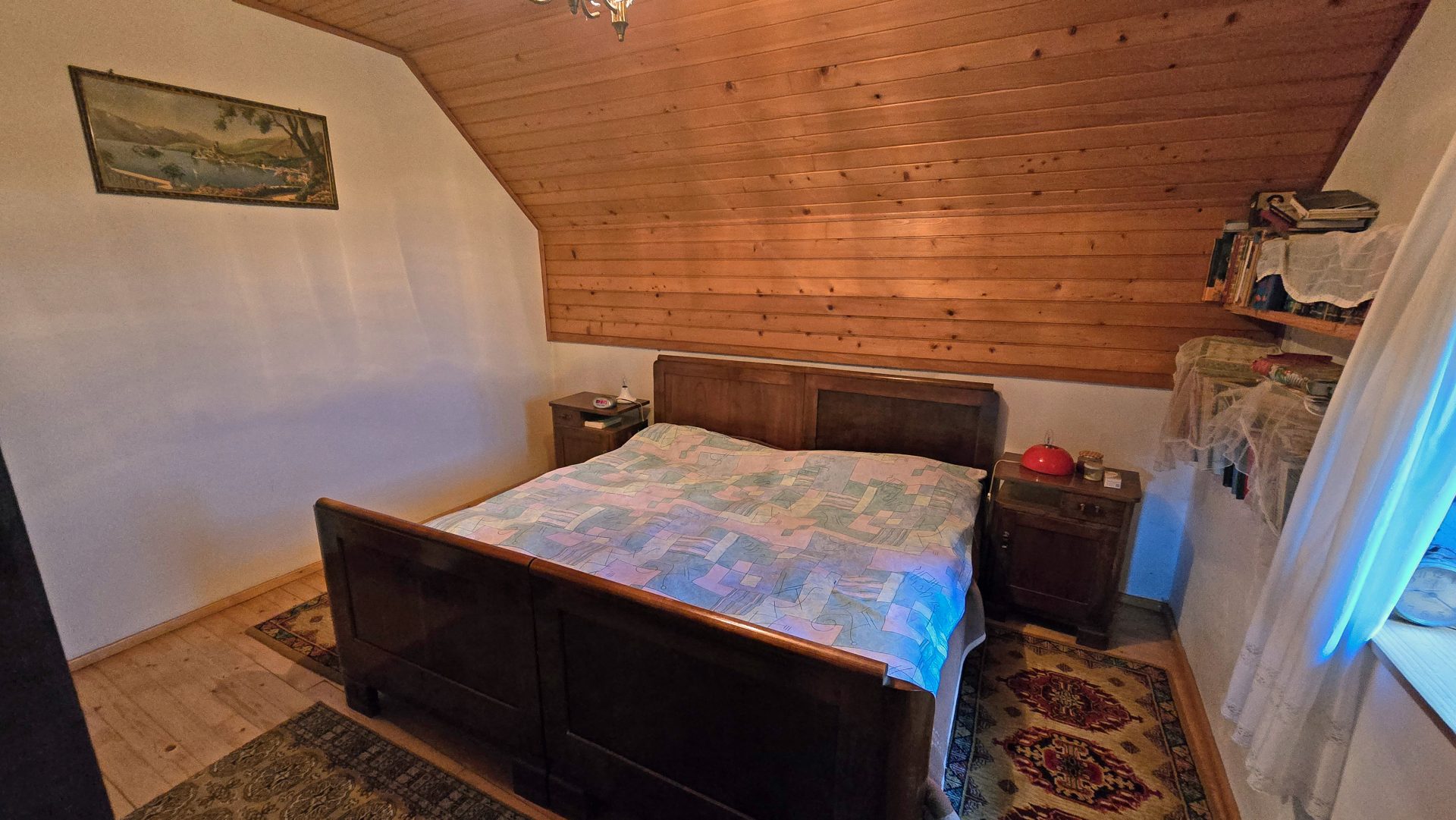 The property features a residential house built in 1850, with a total living area of 120 sqm, arranged over three floors.The ground floor comprises an entrance hall, a kitchen with dining area, a bathroom, and a spacious living room with a traditional ceramic stove, creating a warm and cozy atmosphere.