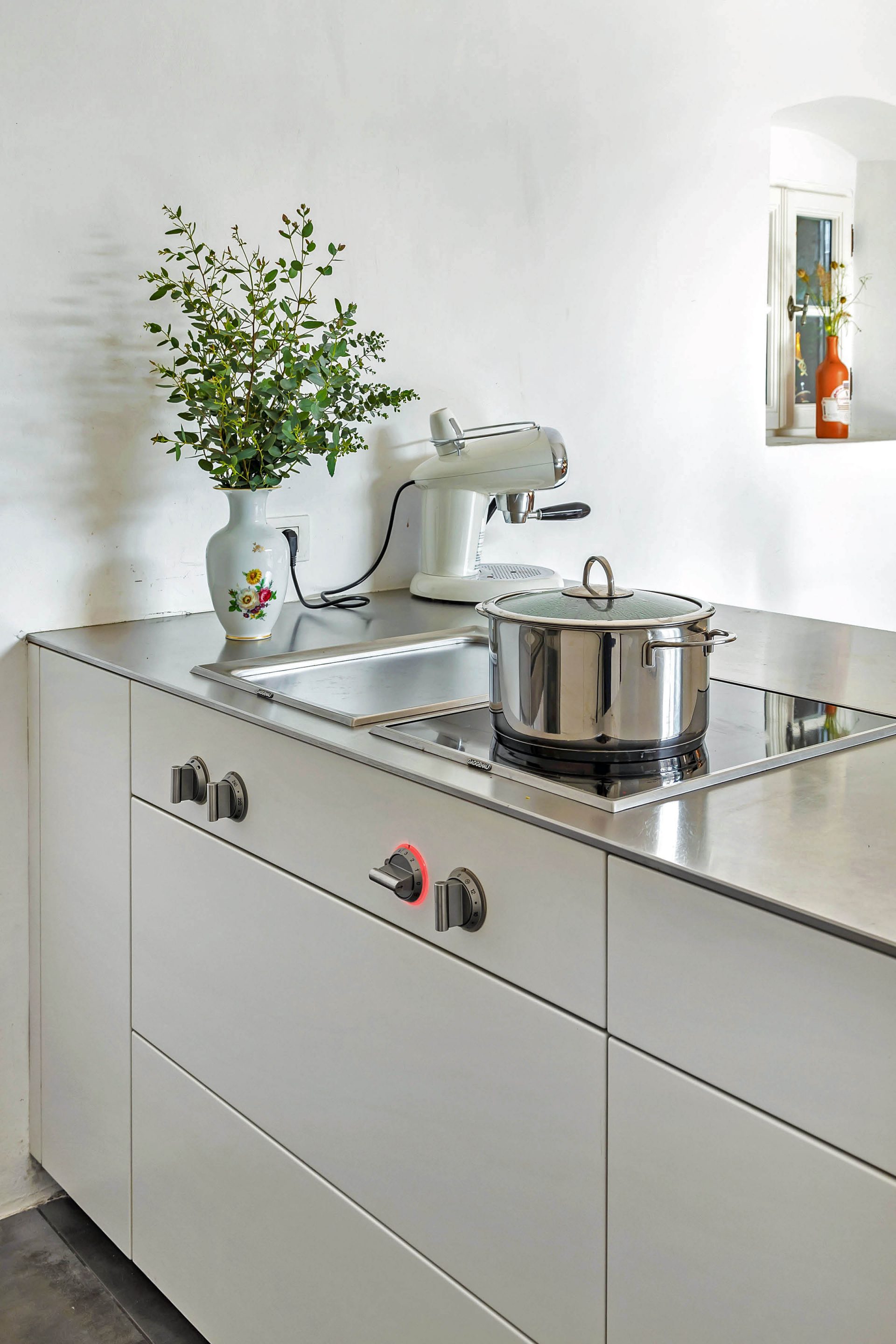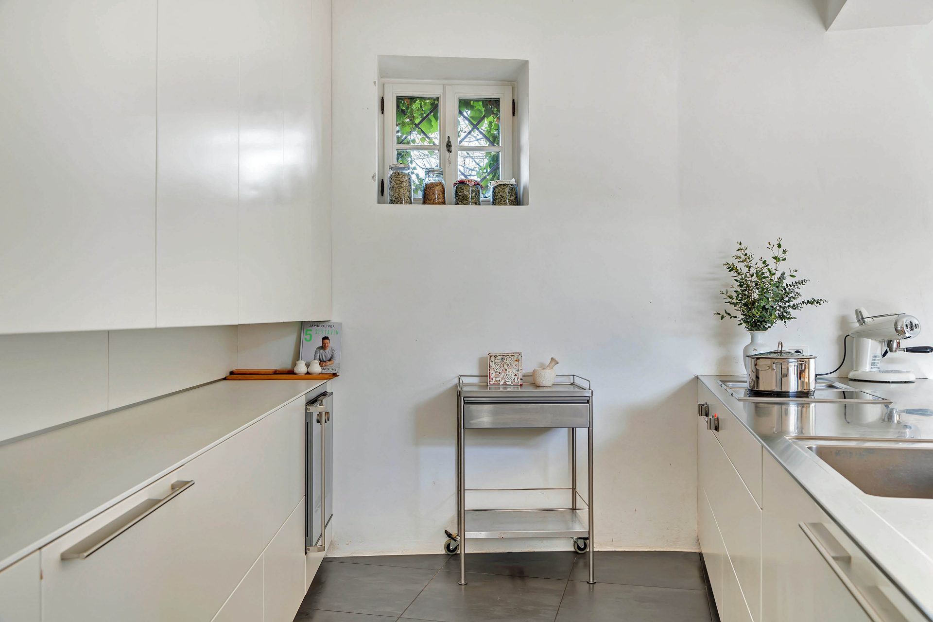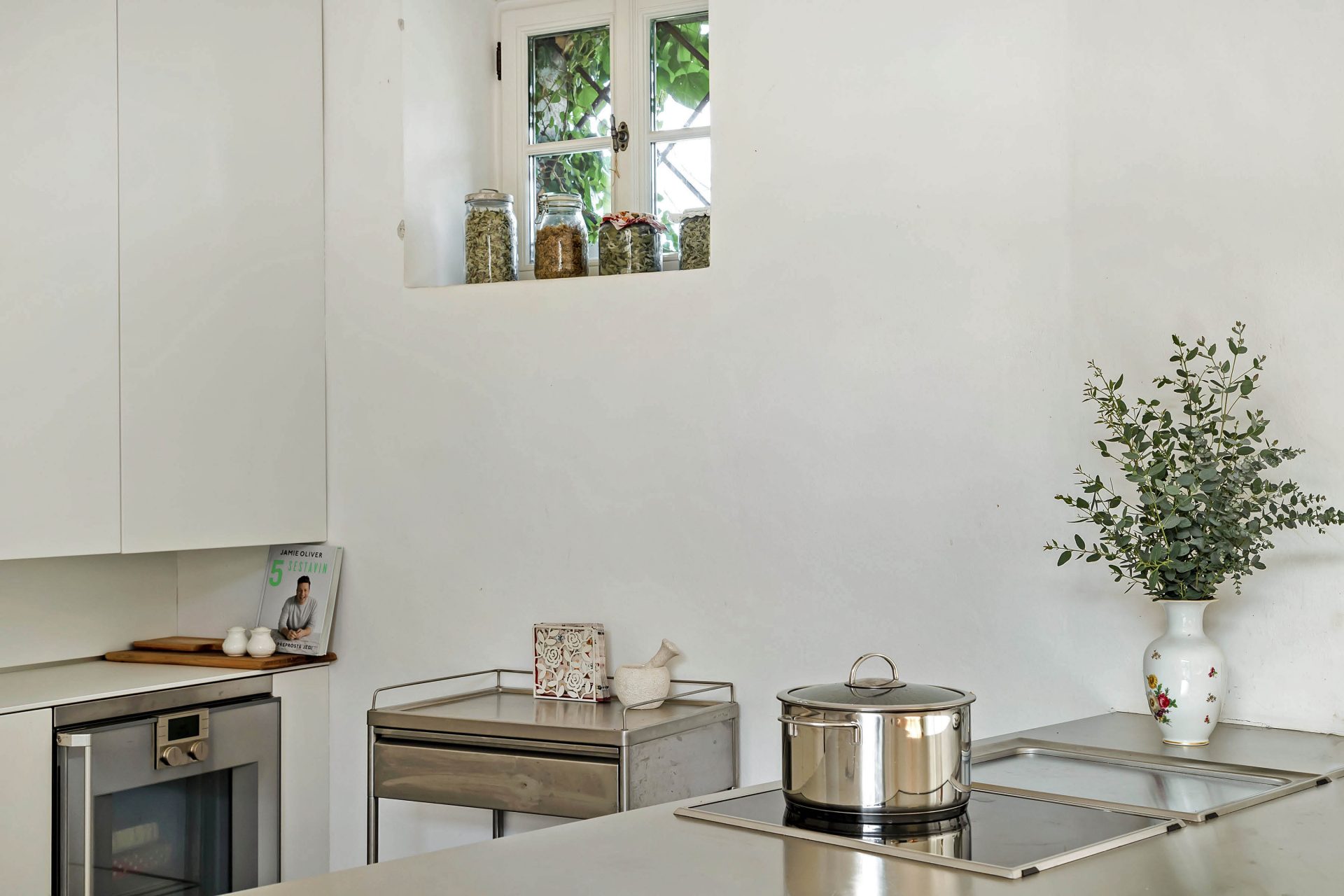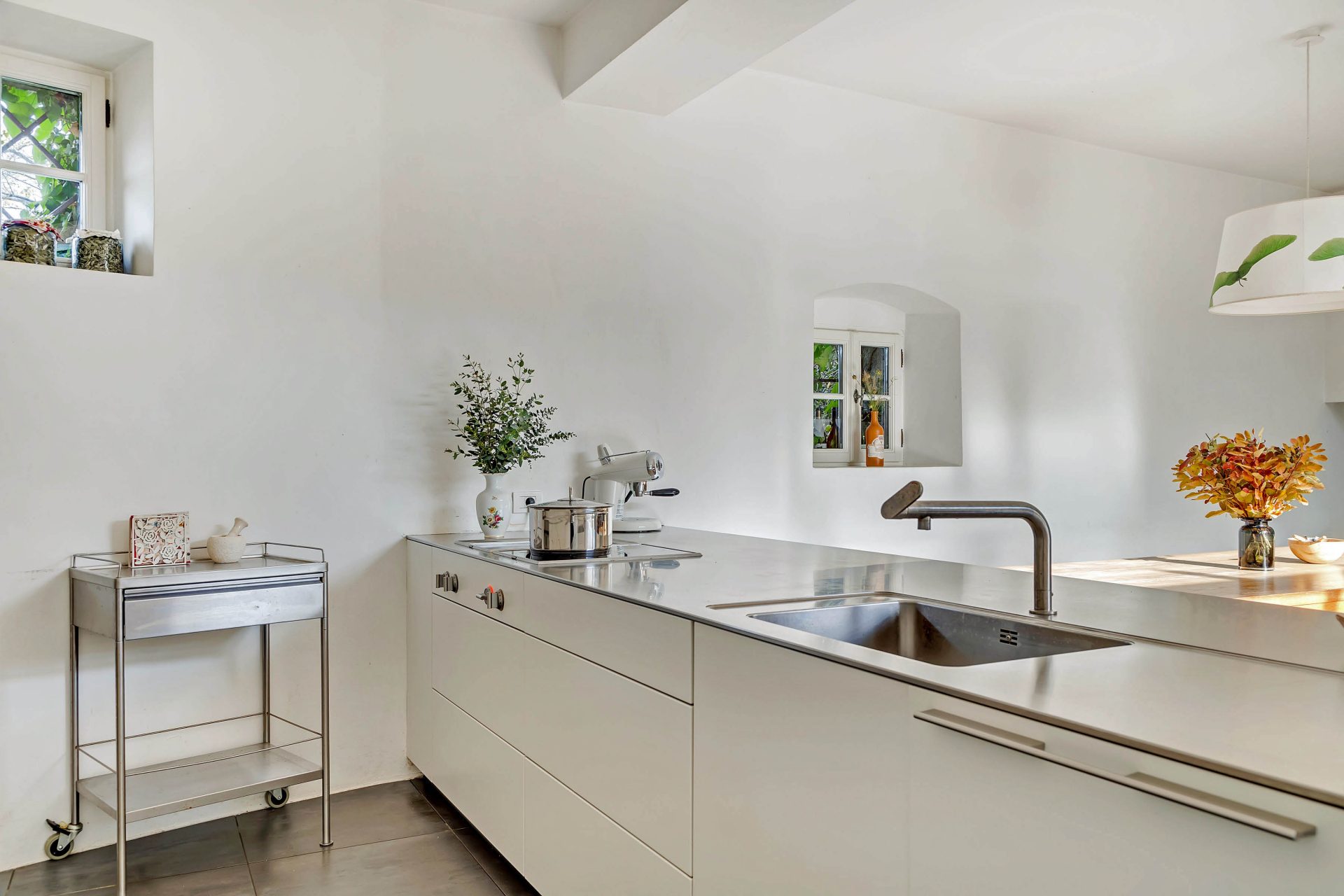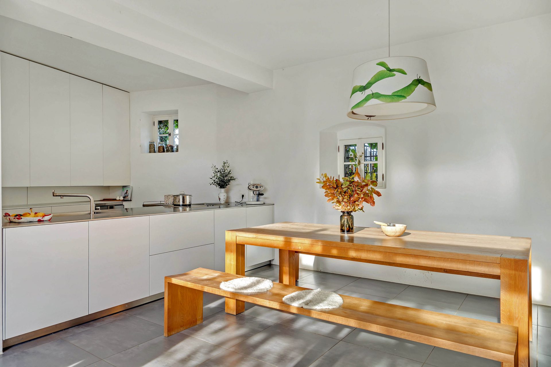 Ground floor comprises of a kitchen with dining room with access to the garden, entrance, hallway with built-in wardrobe and staircase leading to the upper floor, utility area with access to the garden, toilet and storage. The kitchen is custom made (brand BULTHAUP), dining room with an open fireplace.