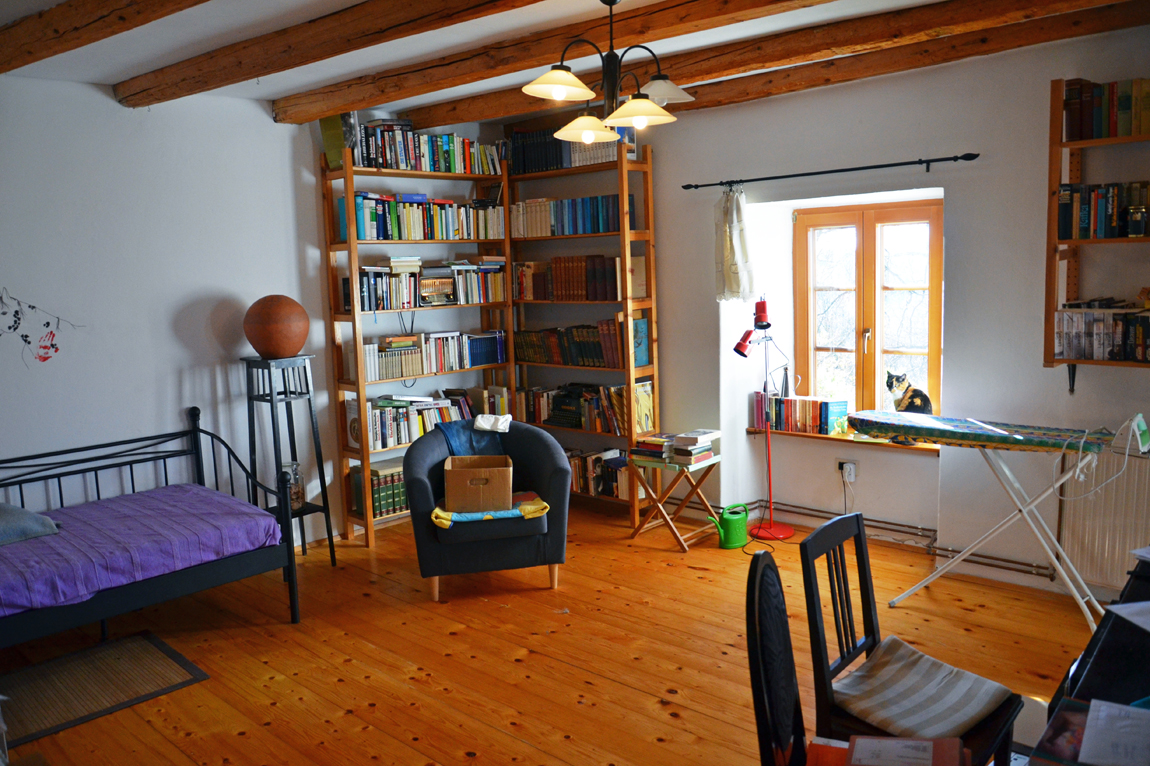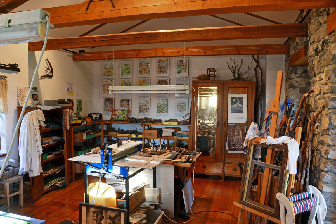 The third set represents the gallery part. The building was built in 1900 and completely renovated in 2003. The gallery comprises a ground floor exhibition space, a staircase to the upper exhibition space or studio and a balcony.