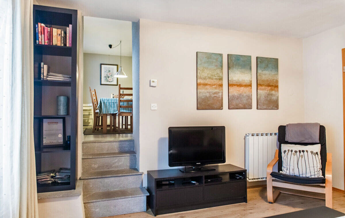 The first two bedrooms are equipped with a double bed, and the third has a bunk bed. The apartment has a large comfortable living room with a TV and a sofa. It is connected to the dining area and a fully equipped kitchen with all necessary appliances. There is also a washing machine in the bathroom with a shower. It has its own balcony and terrace and a shared garden and barbecue.