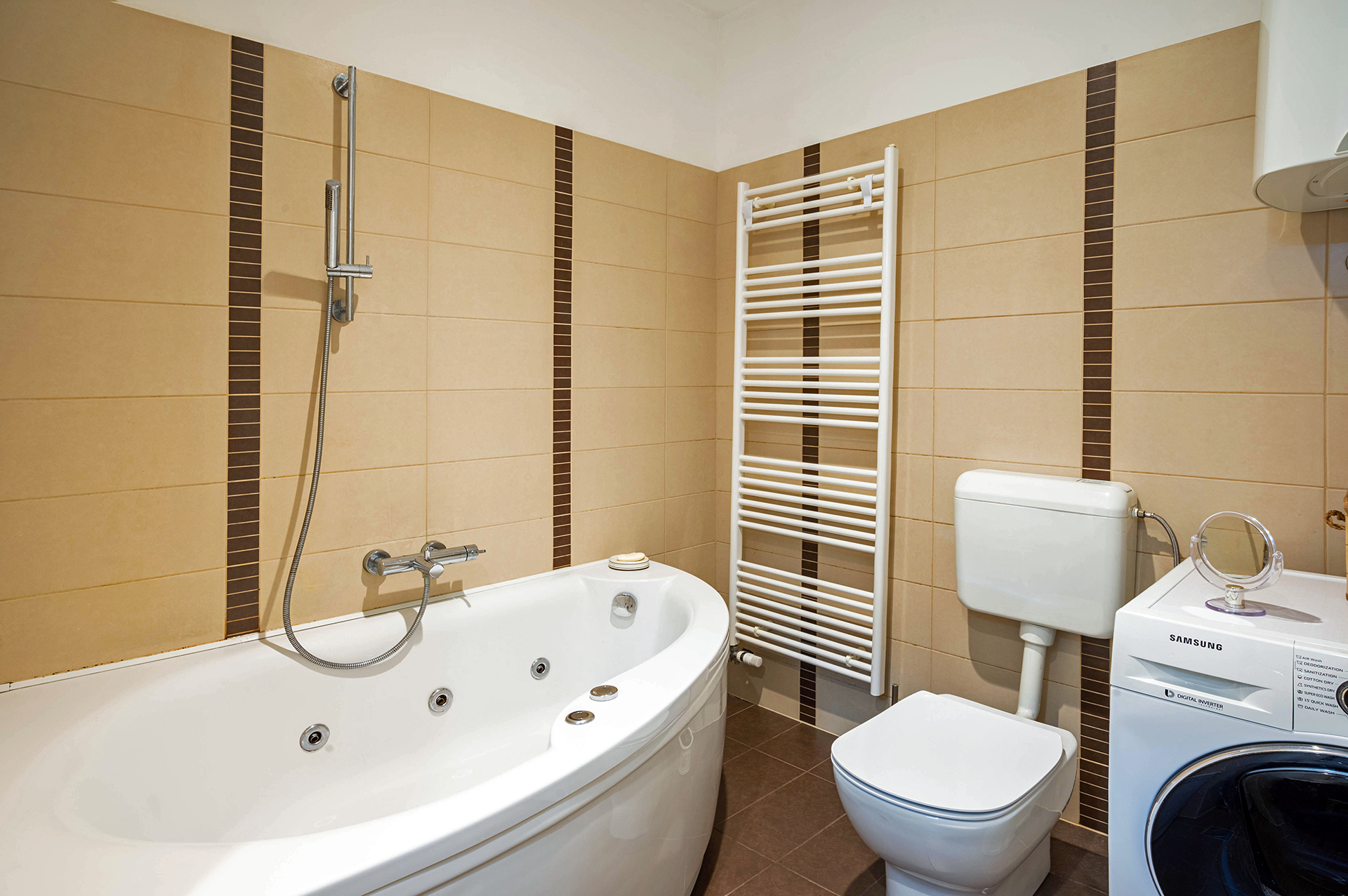 Large entrance hallway with built in storage. Bathroom with large bath tub.