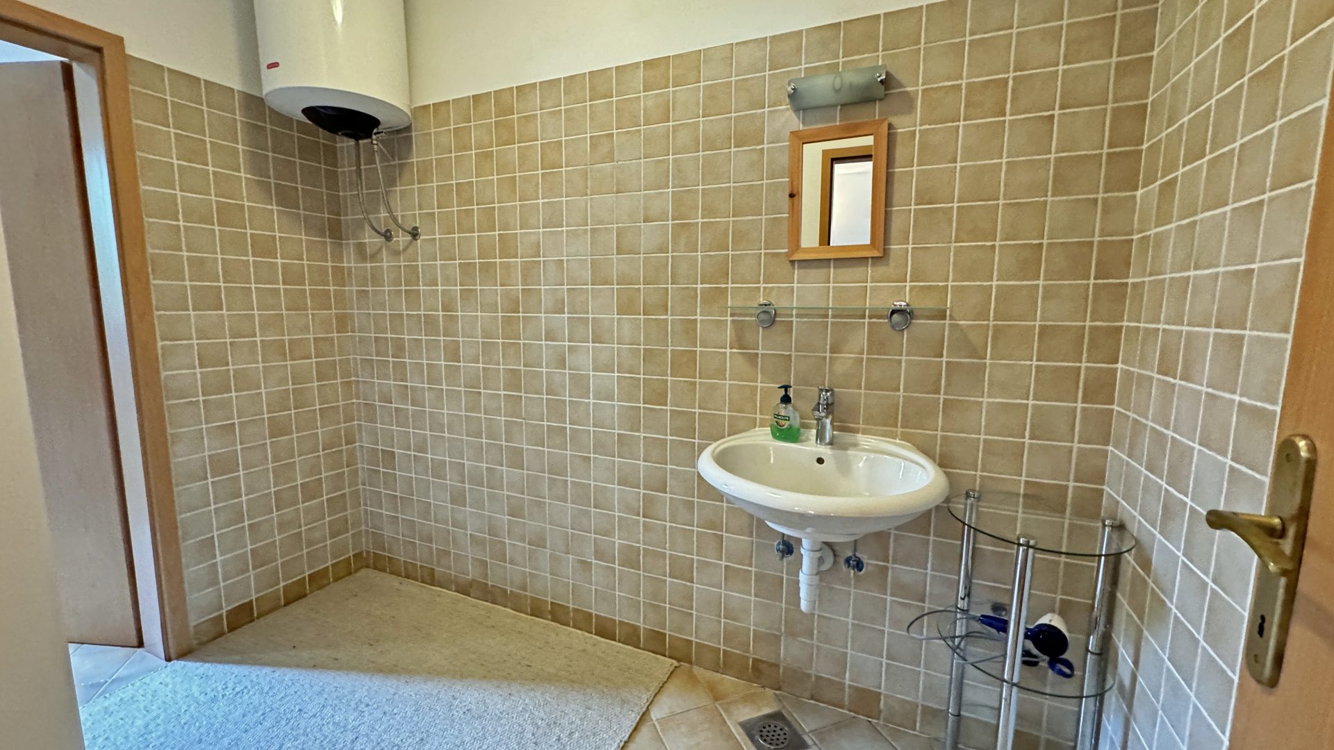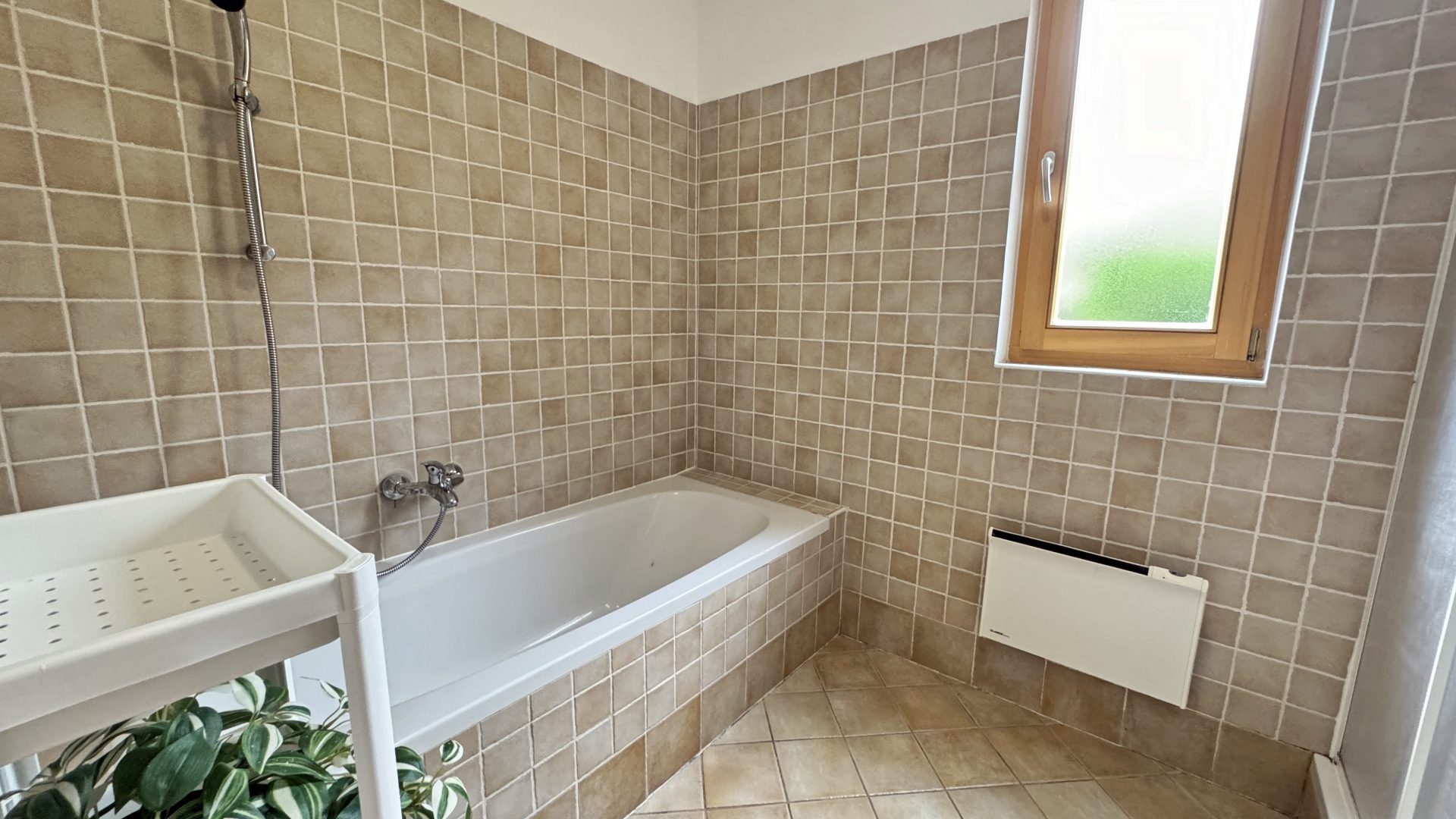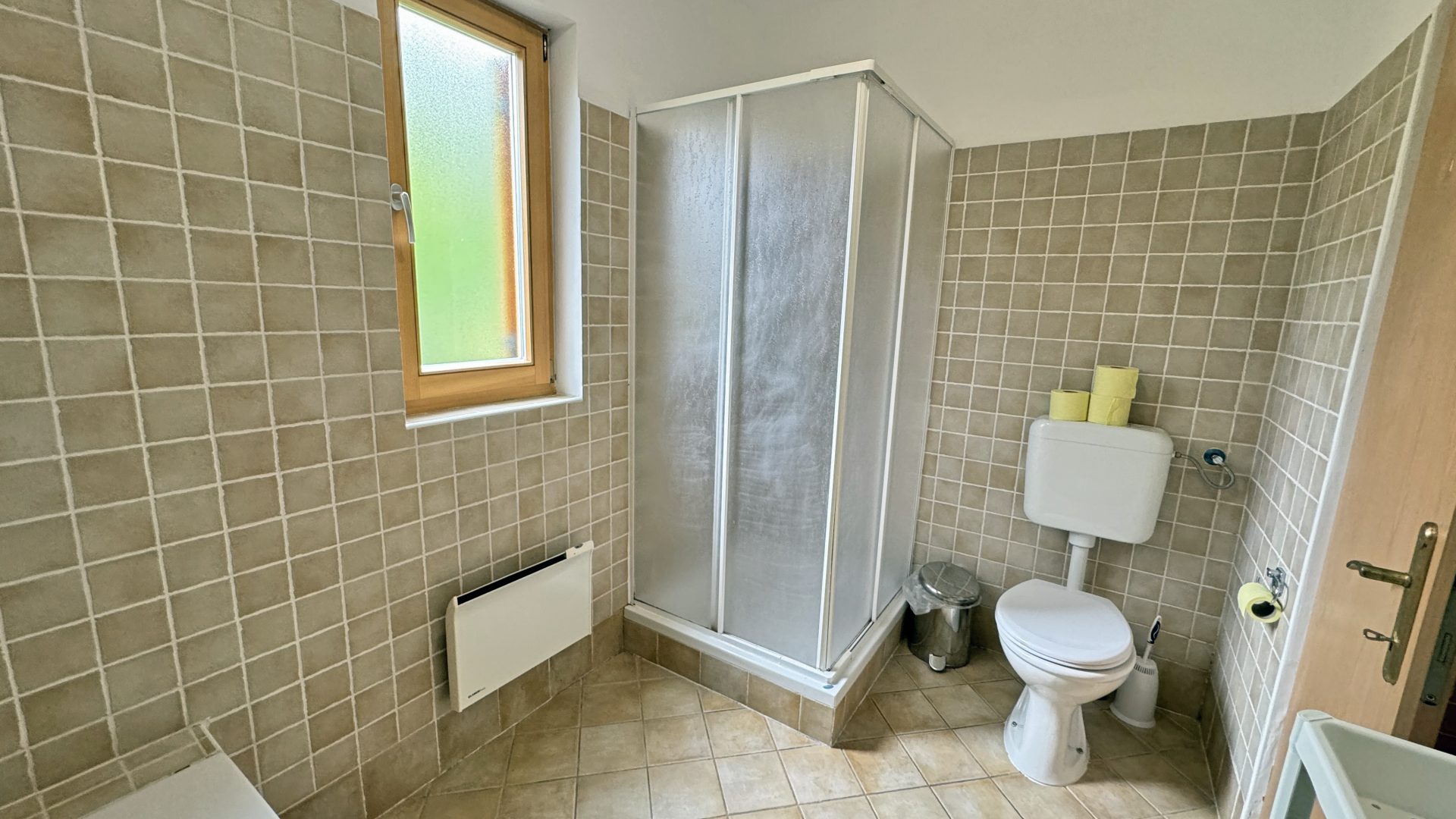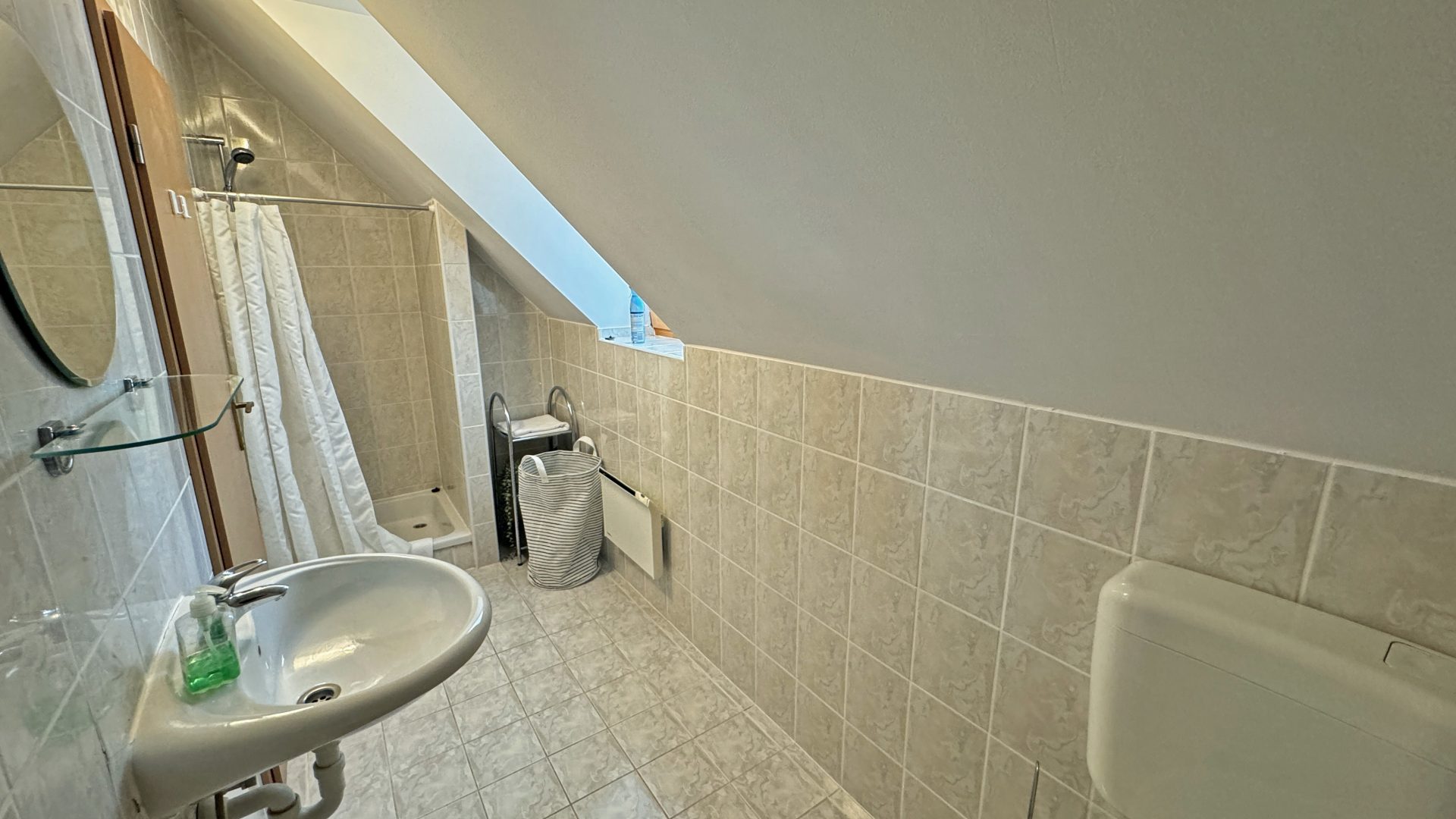 There is a bathroom both on the ground floor and the first floor. The bathroom on the ground floor has a shower and a bathtub.