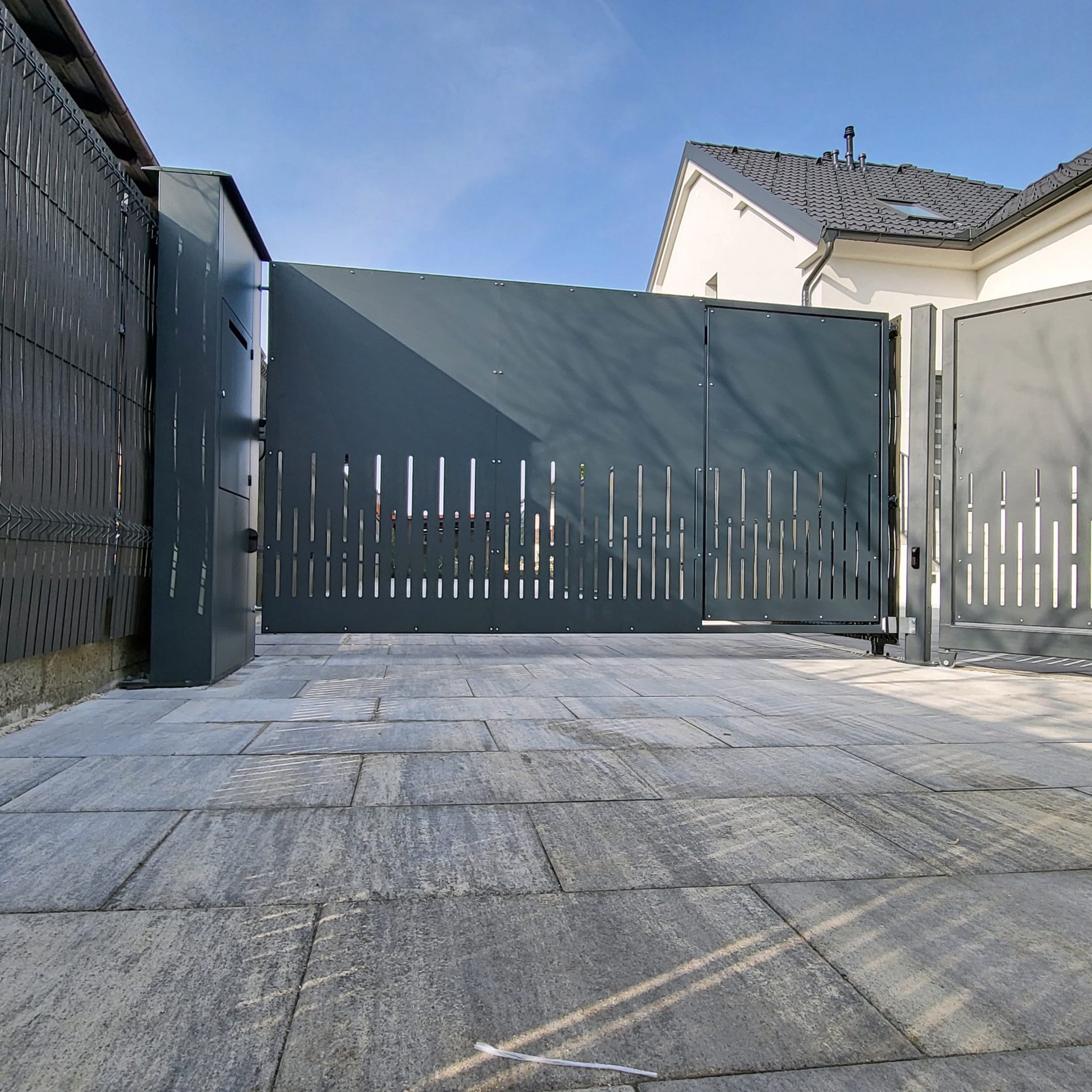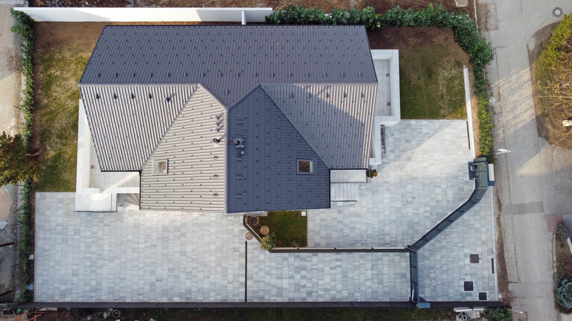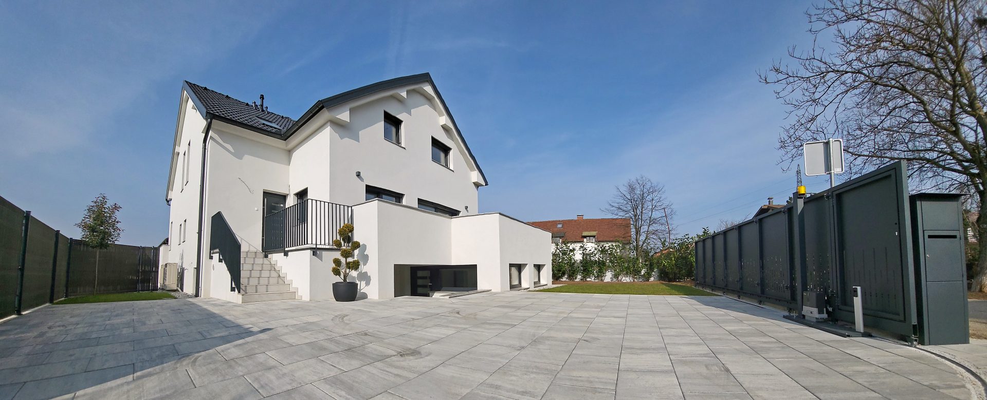 The driving surfaces are arranged with paving stones of a modern grey shade. Possibility of parking at least three vehicles.