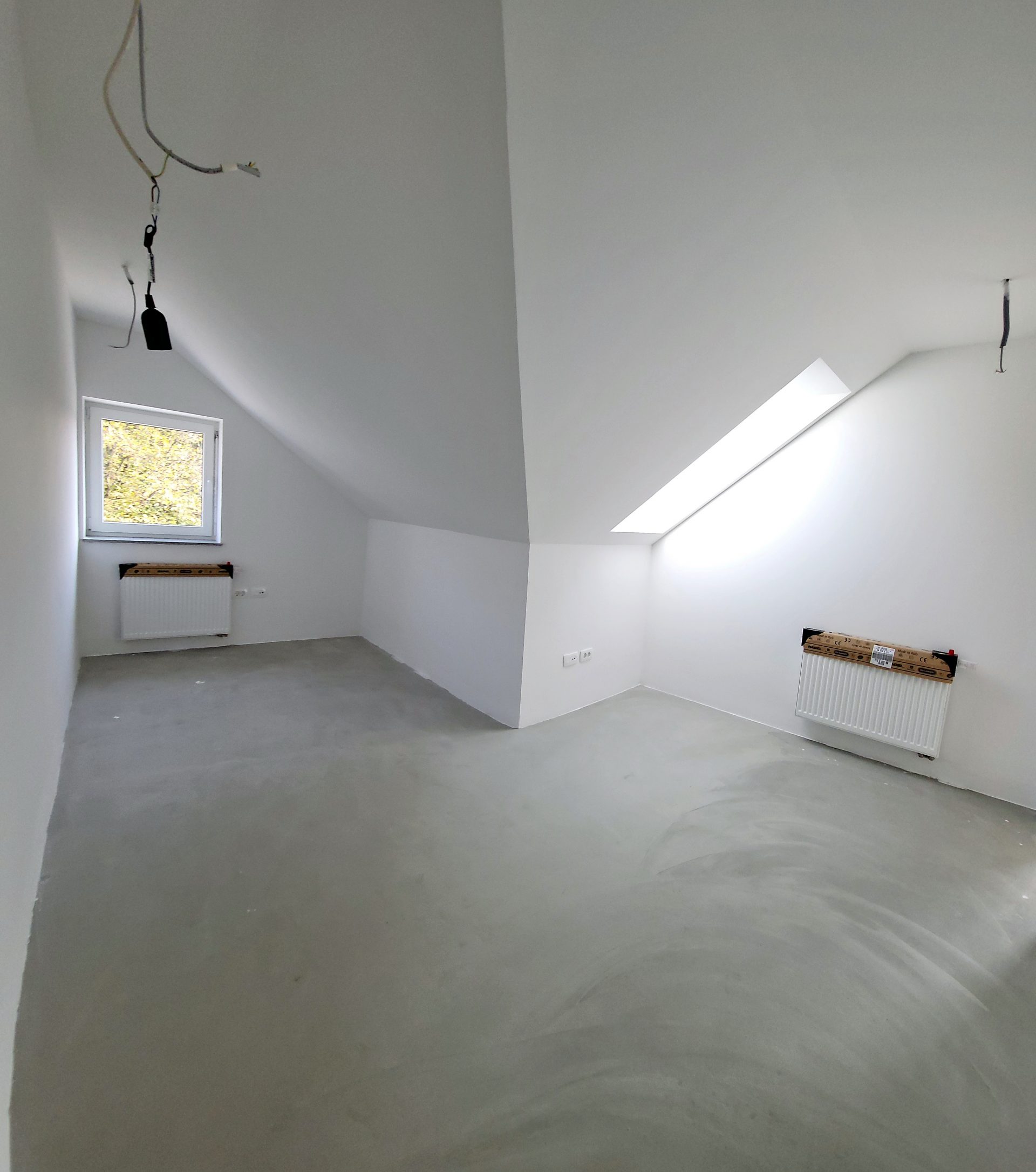 On the third floor there is a bedroom and a larger room, which can be partitioned into two separate smaller children’s rooms if desired (and the electrical and mechanical installations have already been adapted to this). Bathroom with bathtub and toilet and hallway.