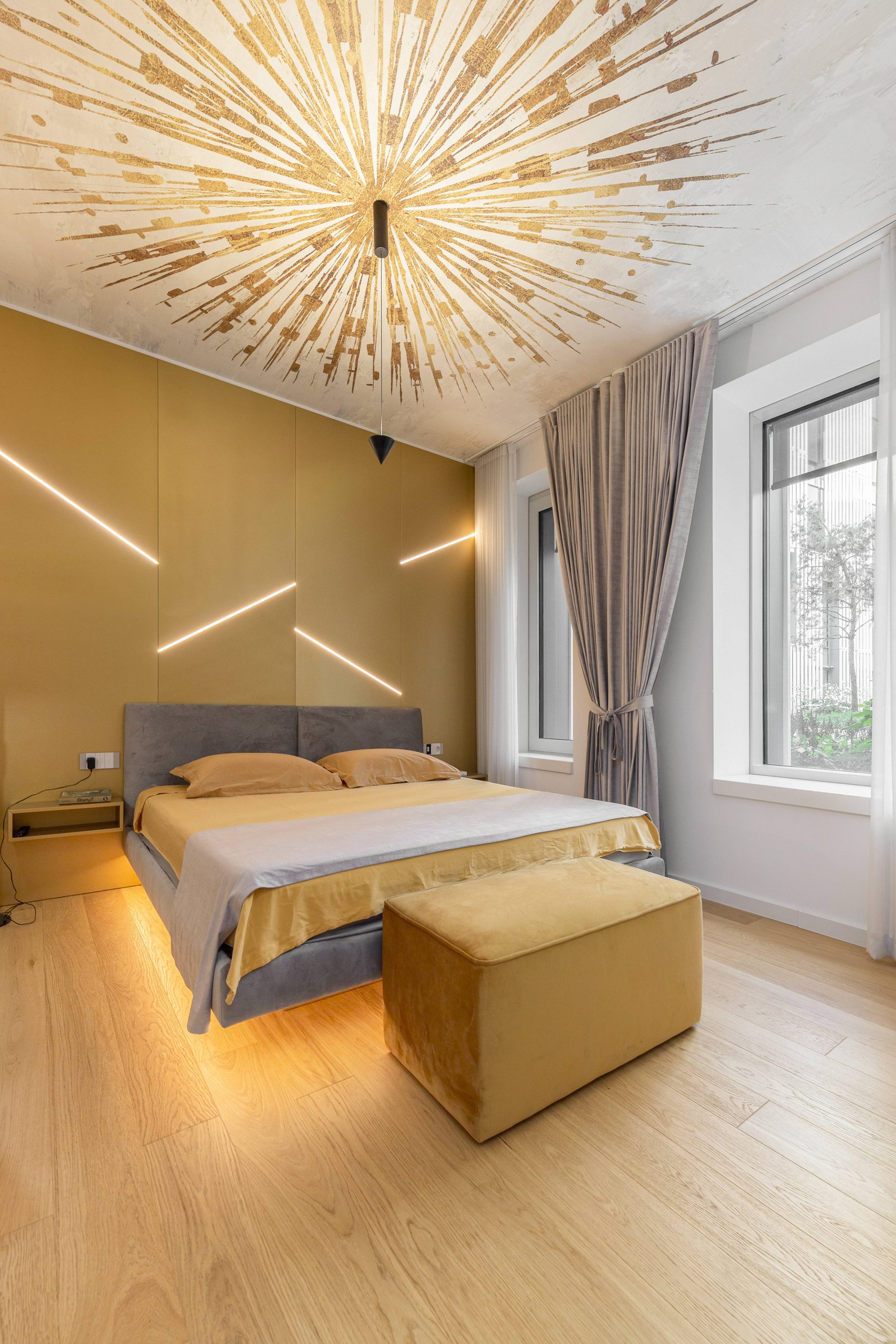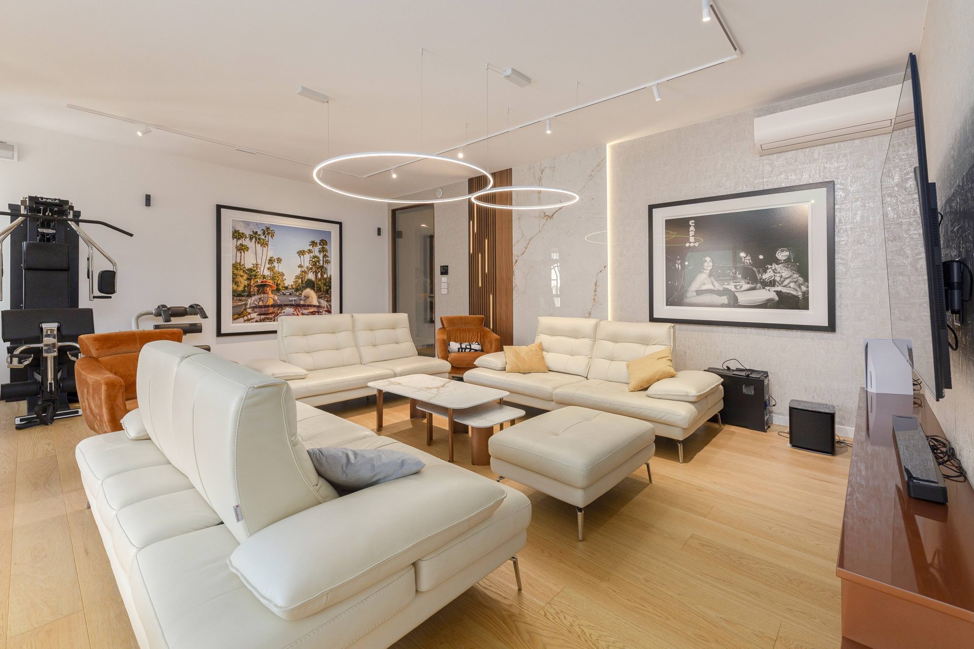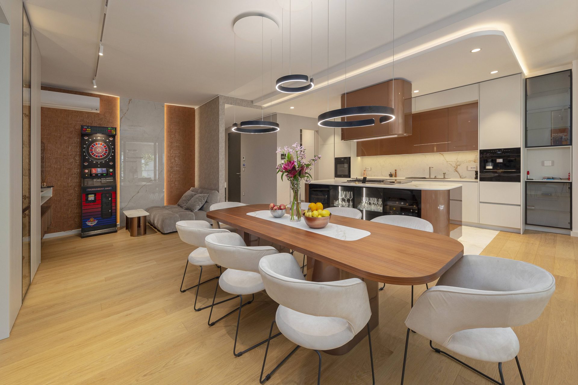 A separate lounge area, divided by elegant double-leaf glass doors, includes elegant sofas, ambient lighting, TV, gym equipment, and a foosball table. This area also offers access to a second spacious balcony.