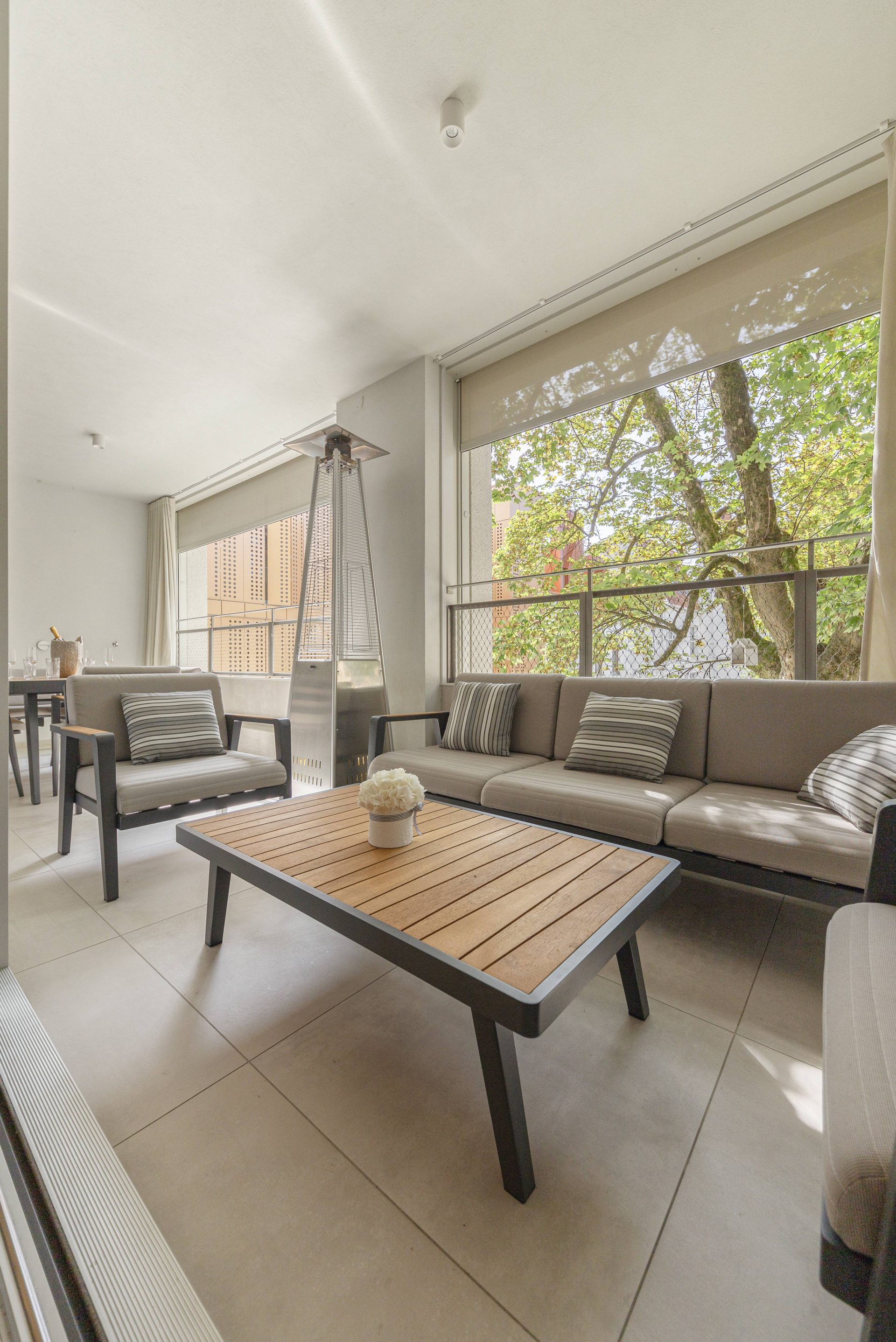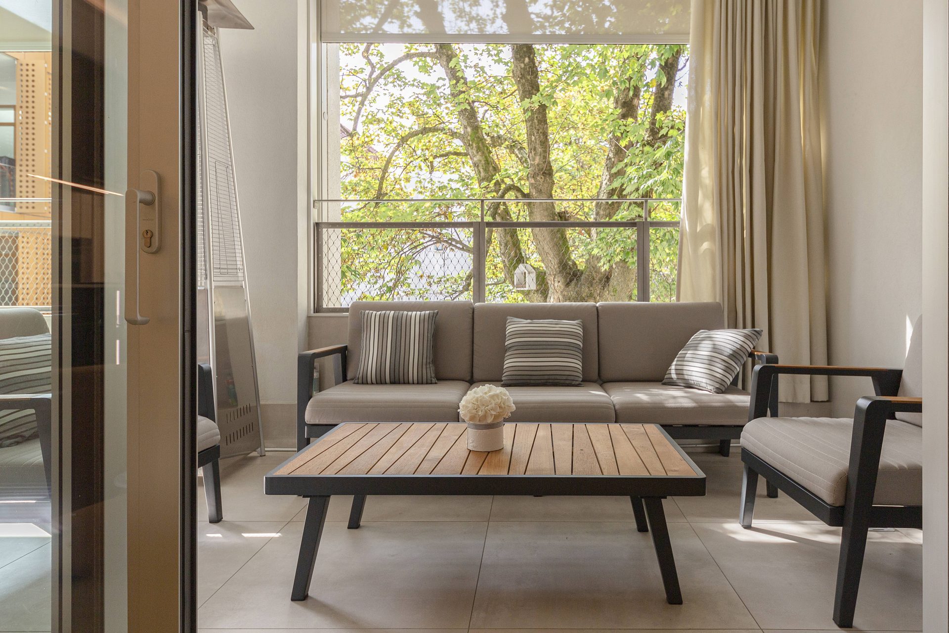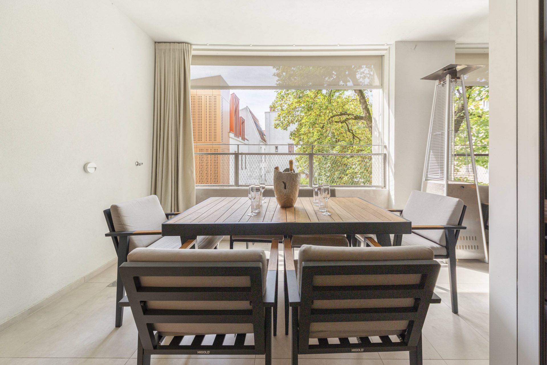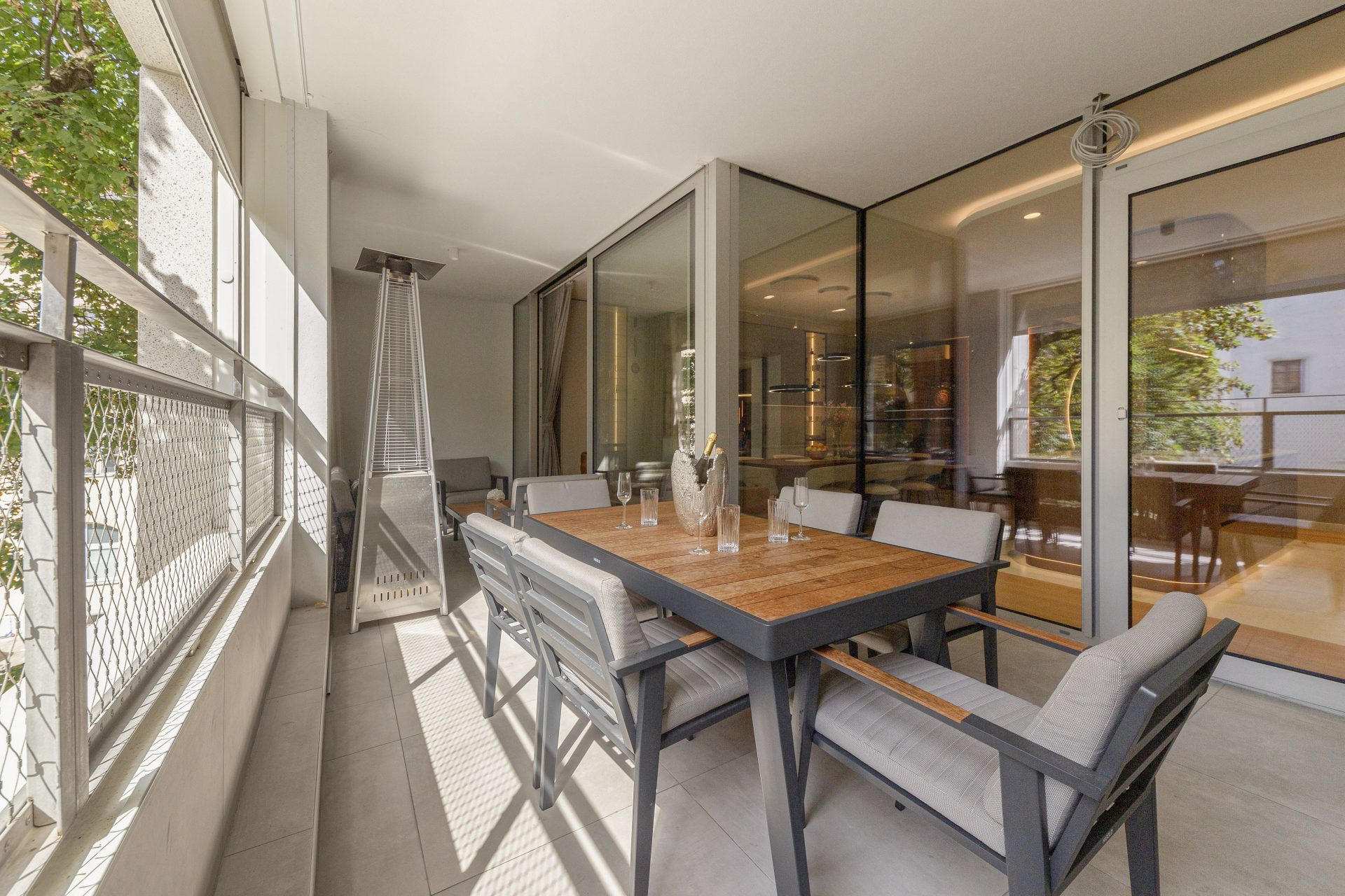 The hallway opens into a bright and expansive open-plan living area with floor-to-ceiling windows. The living and dining areas are stylishly furnished, including a custom-built, fully equipped kitchen with high-end appliances. Off the kitchen is a walk-in pantry/storage room with cupboards. This space has direct access to a spacious balcony furnished with both a table with six chairs as well as a comfortable seating area and equipped with electric sunshades, making if perfect for realxing or entertaining outdoors.