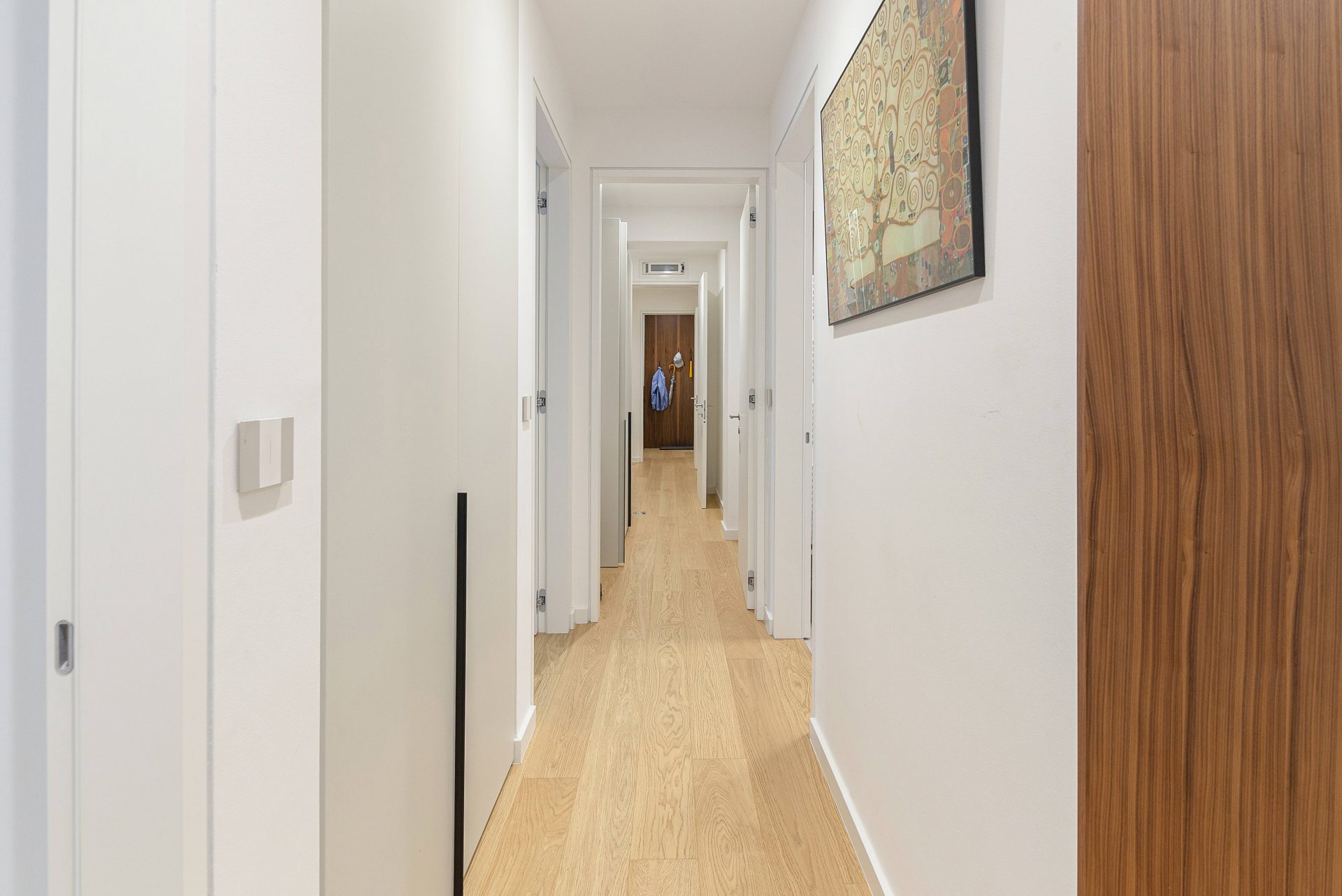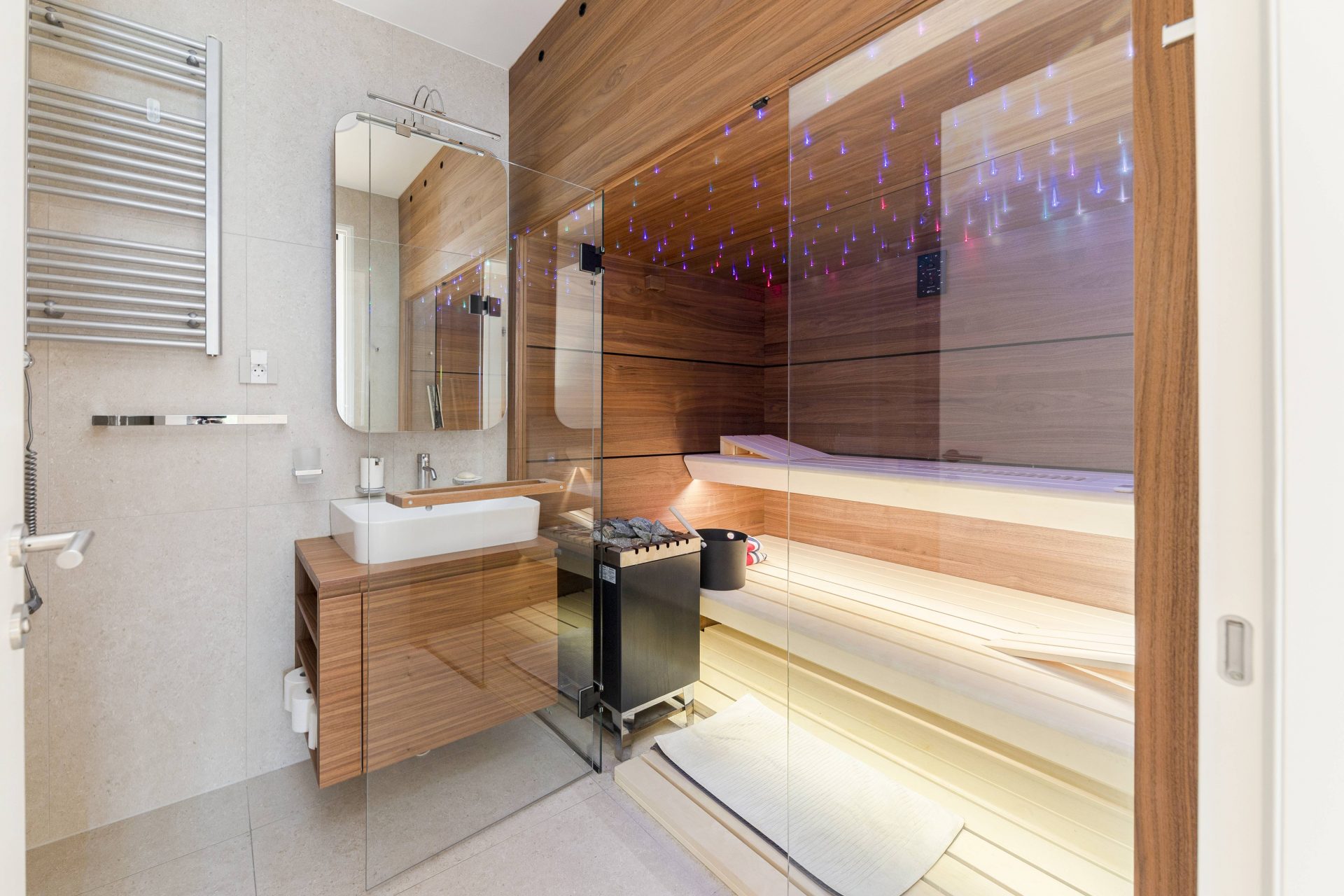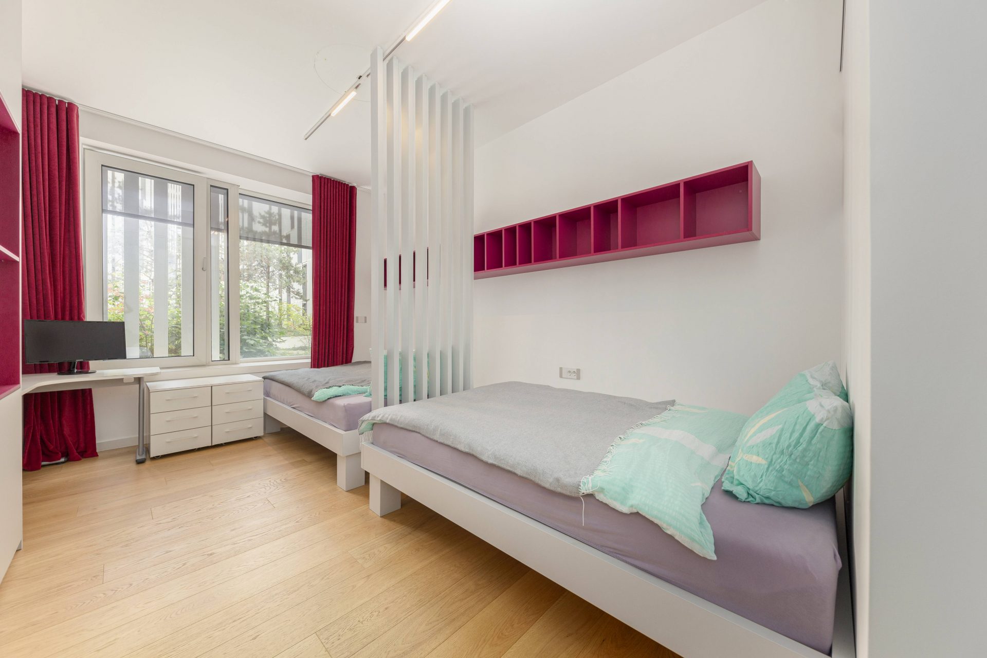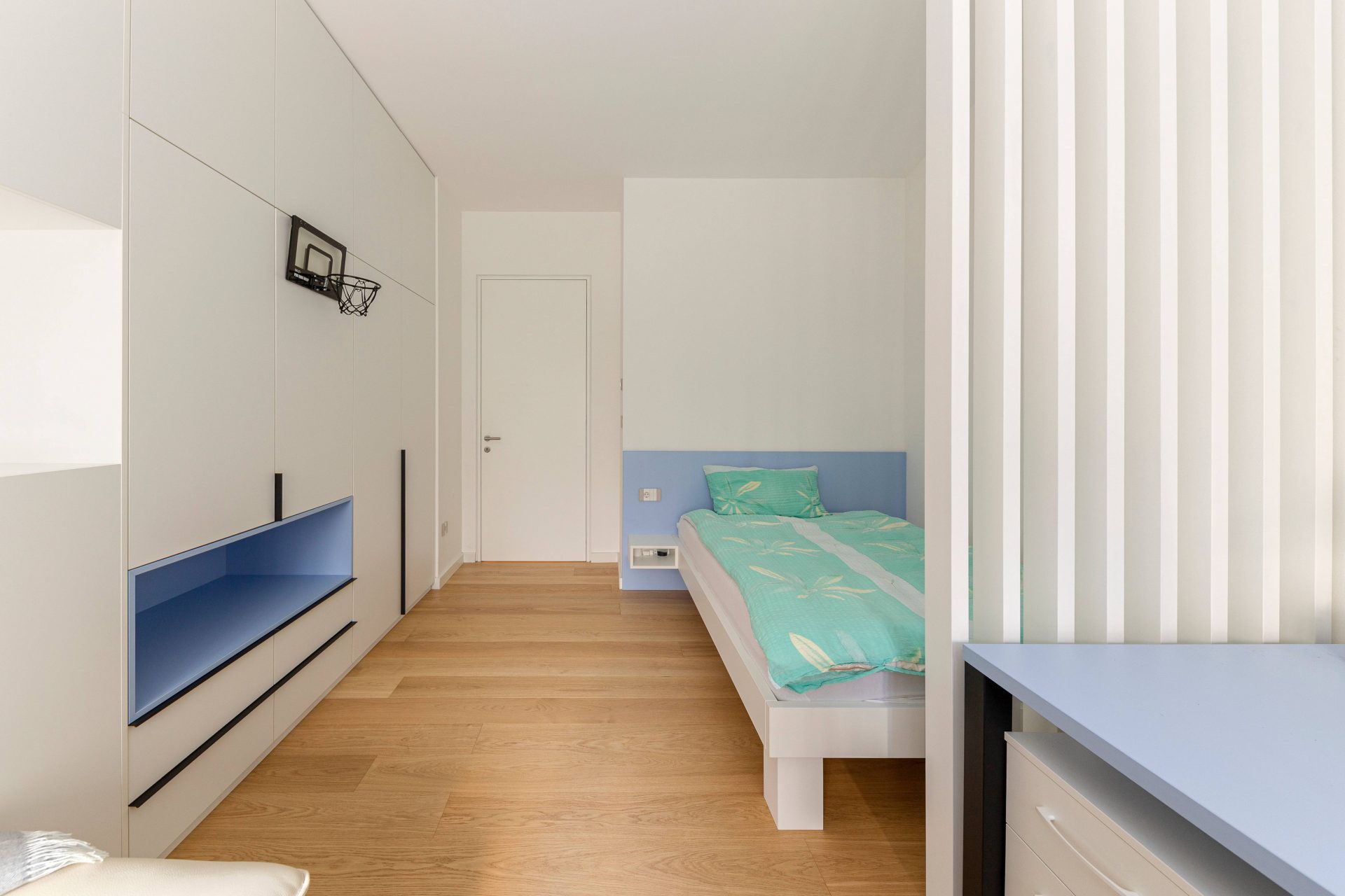 The sleeping area features a spacious main bedroom with a large walk-in closet. Opposite to it is the main bathroom featuring a sauna and a shower. Two well-proportioned kid’s bedrooms – one double and one single with a sofa – both overlooking the quiet inner atrium. Another bathroom, equipped with a bathtub, a shower and a double sink. On the other side of the hallway is another bedroom with a double bed. Two guest’s toilets, both conveniently located next to the entry halls. A utility area with cupboards and washing and dryer machine is in the hallway.