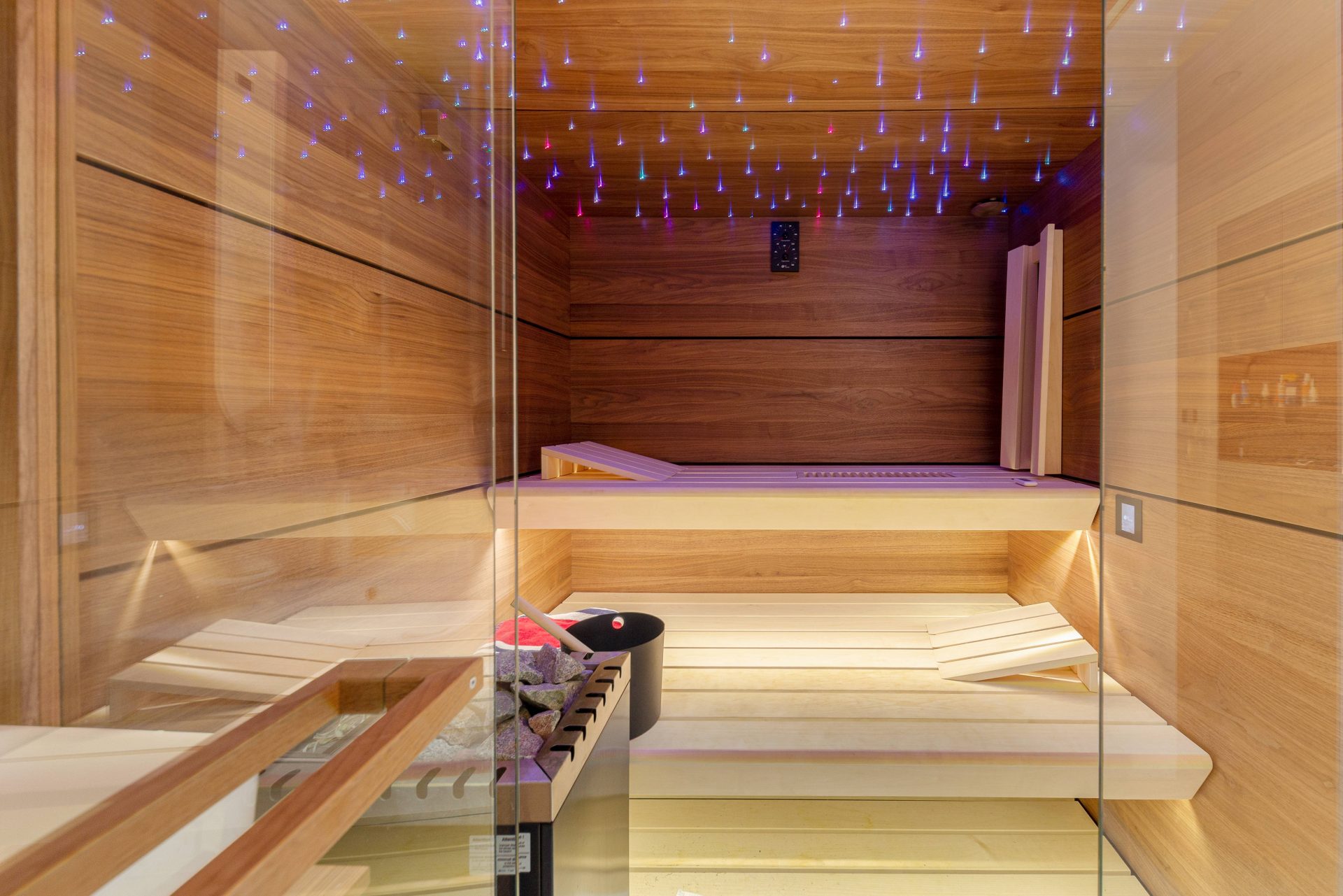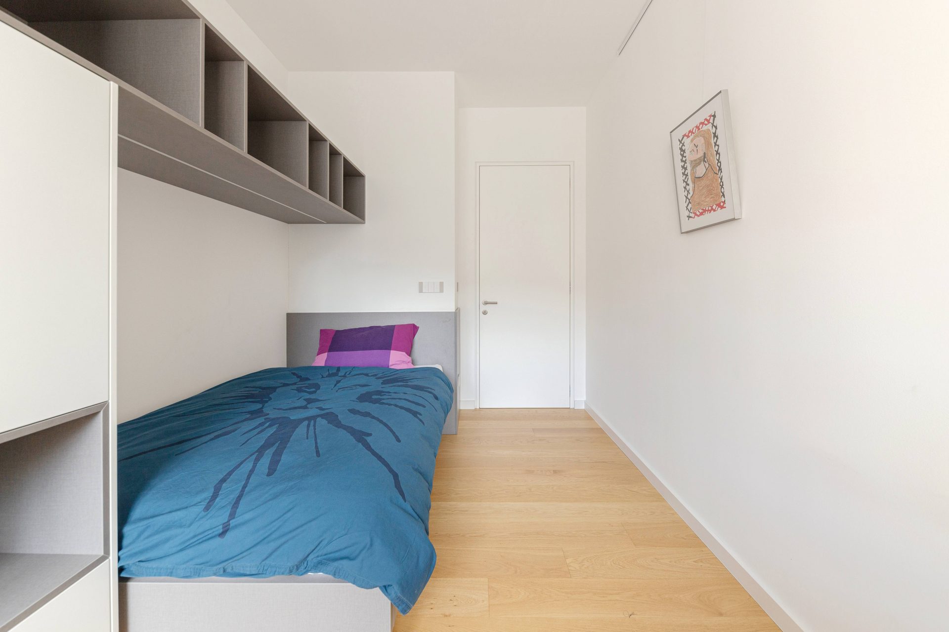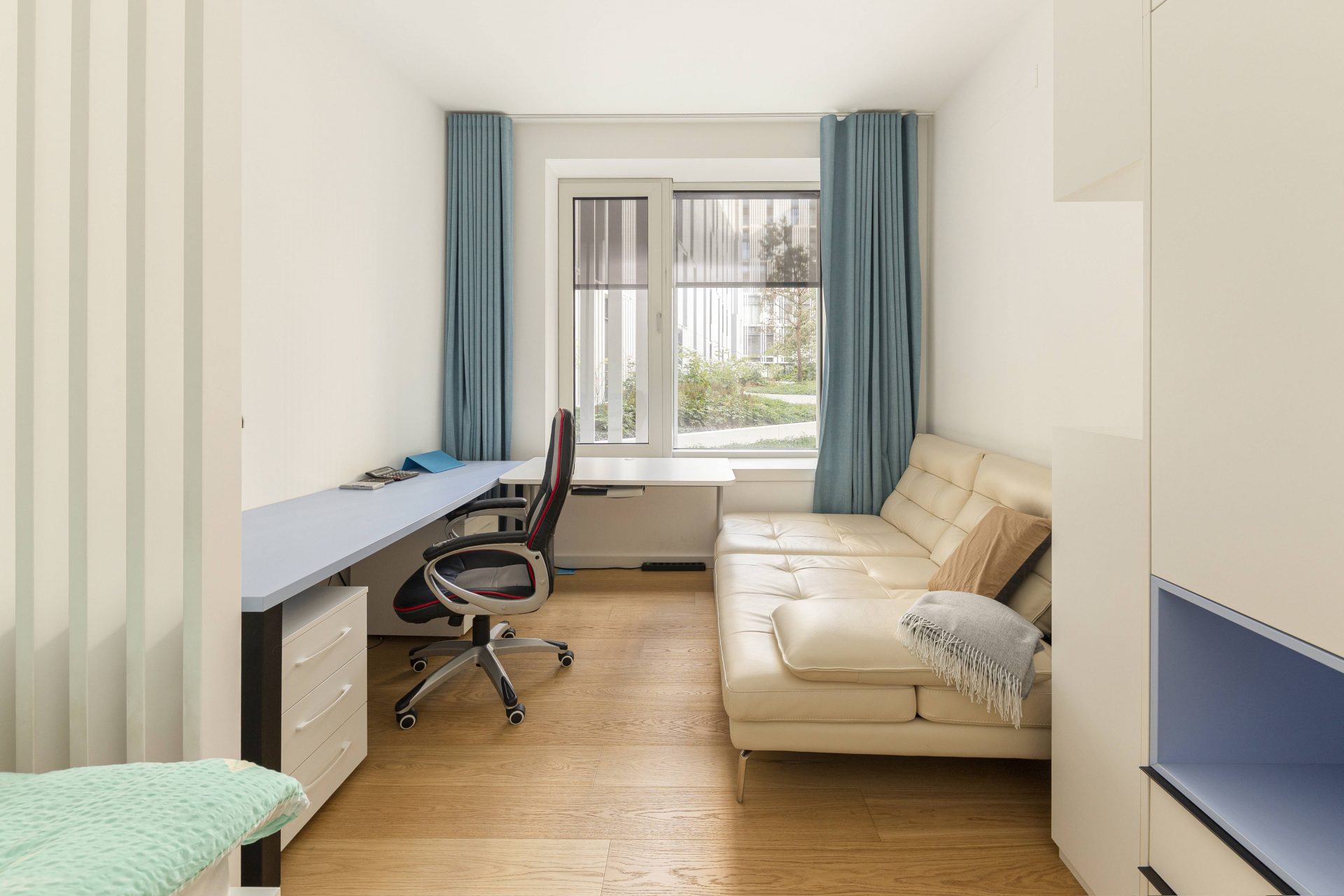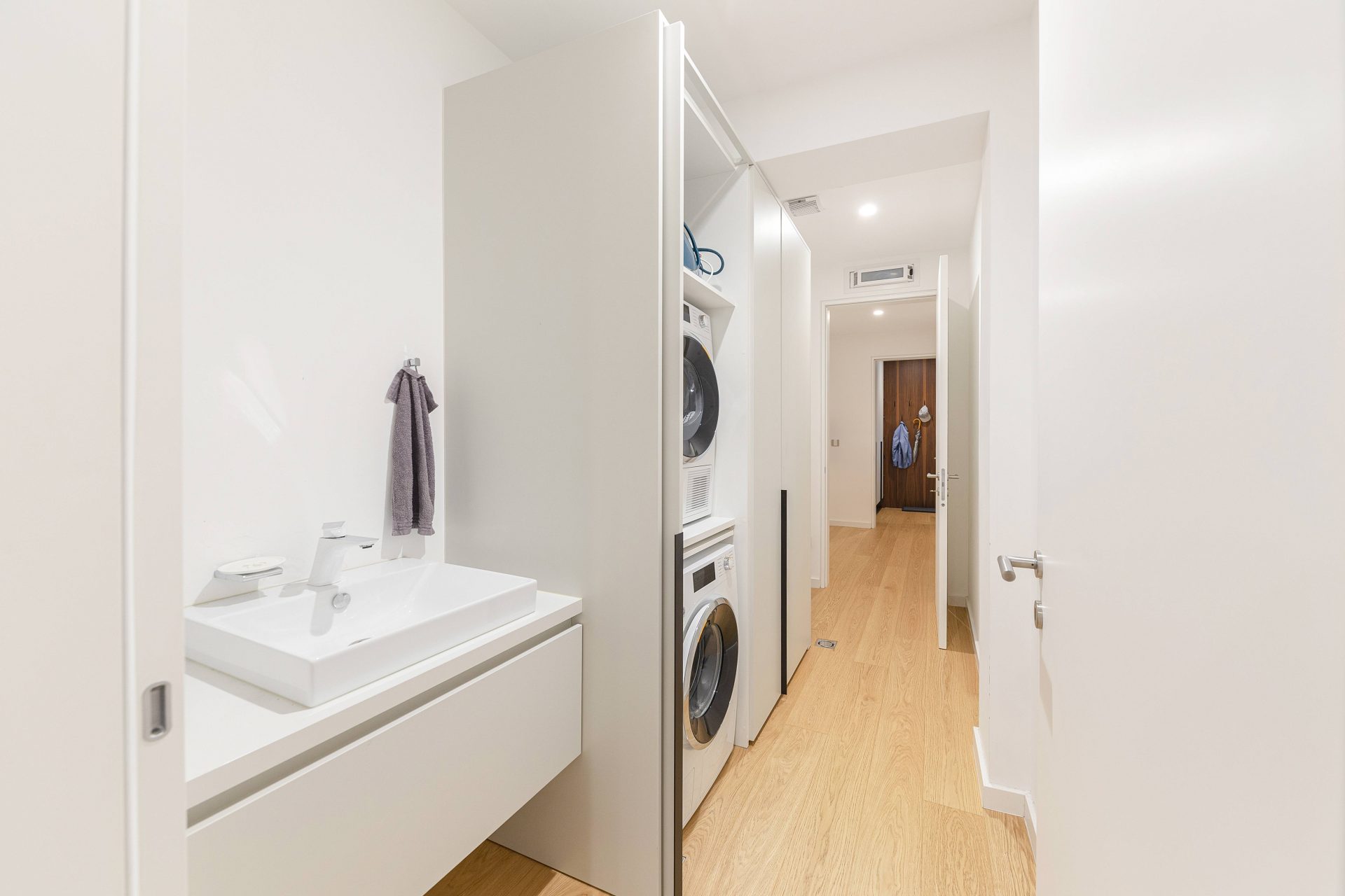 The sleeping area features a spacious main bedroom with a large walk-in closet. Opposite to it is the main bathroom featuring a sauna and a shower. Two well-proportioned kid’s bedrooms – one double and one single with a sofa – both overlooking the quiet inner atrium. Another bathroom, equipped with a bathtub, a shower and a double sink. On the other side of the hallway is another bedroom with a double bed. Two guest’s toilets, both conveniently located next to the entry halls. A utility area with cupboards and washing and dryer machine is in the hallway.