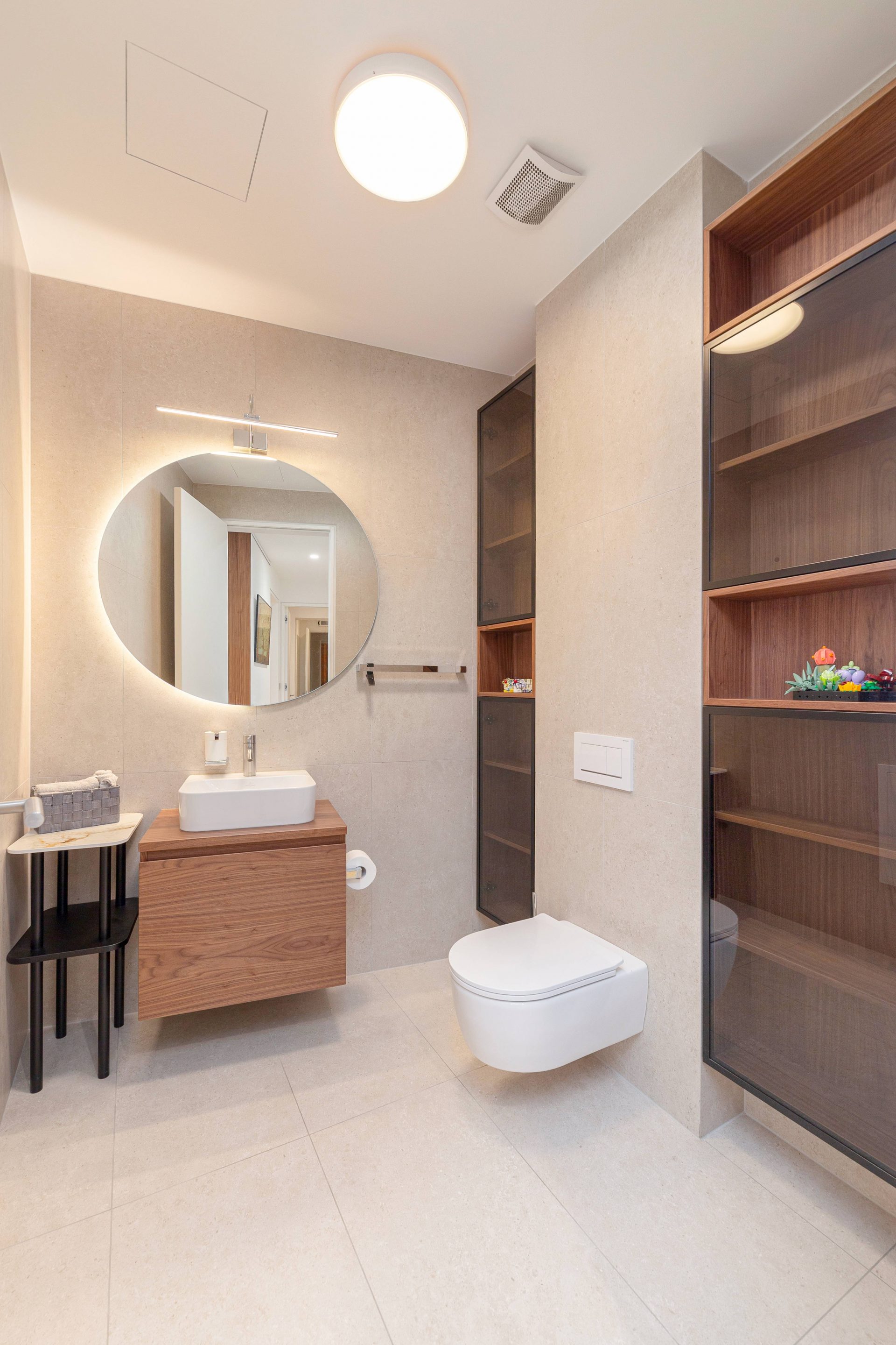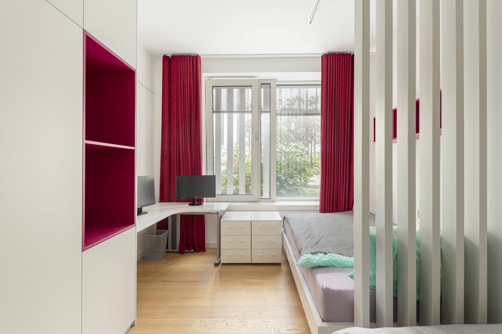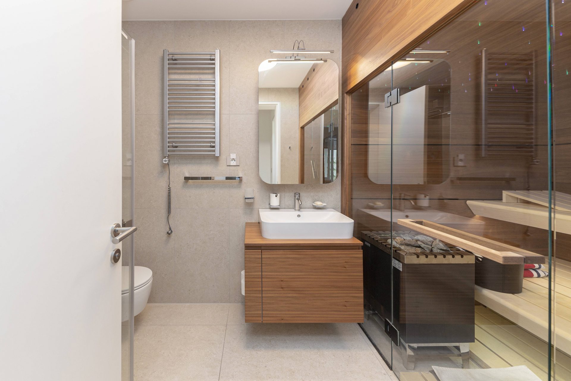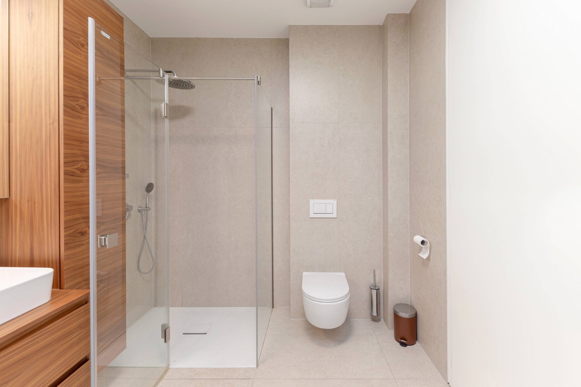 The sleeping area features a spacious main bedroom with a large walk-in closet. Opposite to it is the main bathroom featuring a sauna and a shower. Two well-proportioned kid’s bedrooms – one double and one single with a sofa – both overlooking the quiet inner atrium. Another bathroom, equipped with a bathtub, a shower and a double sink. On the other side of the hallway is another bedroom with a double bed. Two guest’s toilets, both conveniently located next to the entry halls. A utility area with cupboards and washing and dryer machine is in the hallway.
