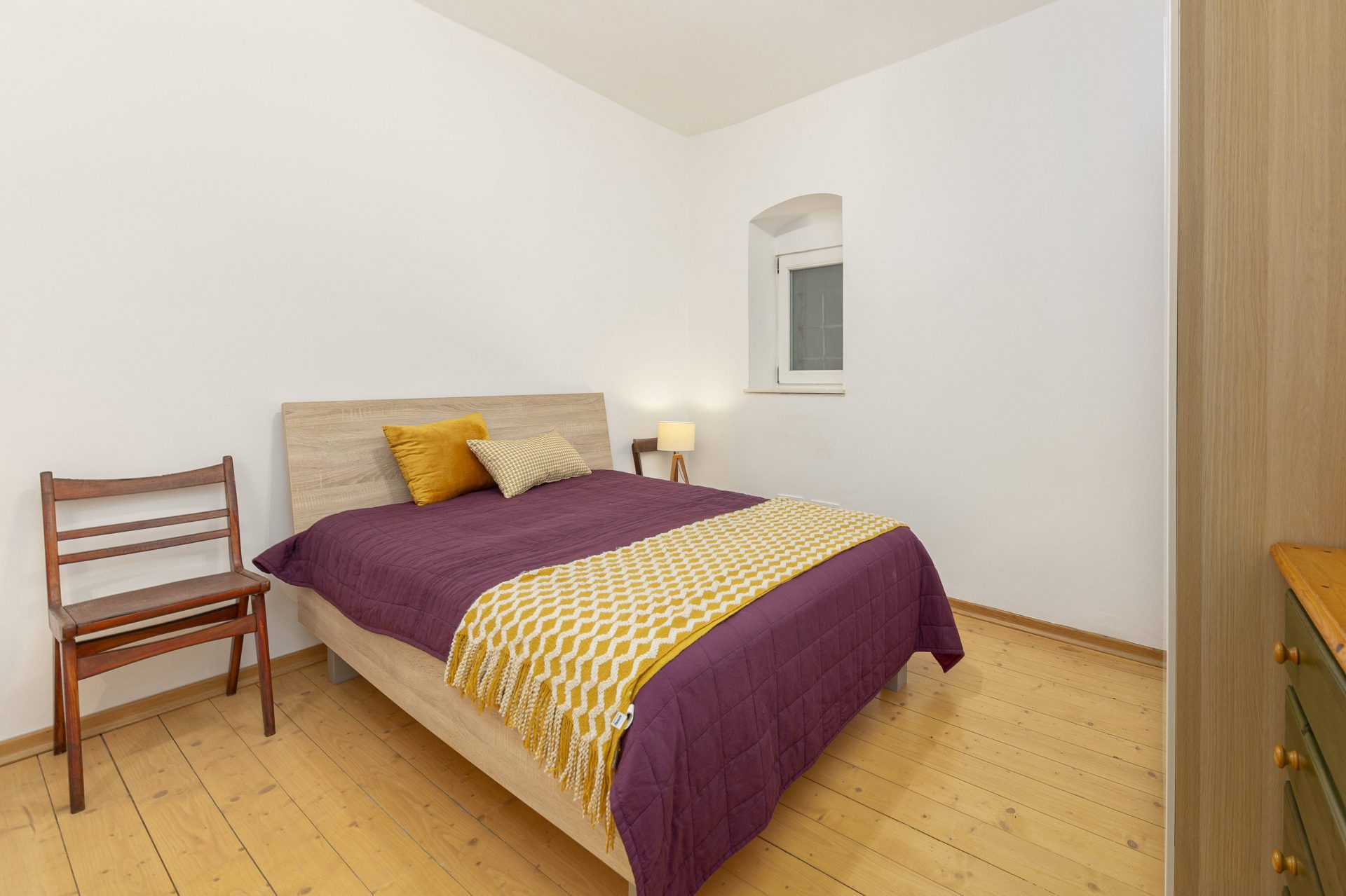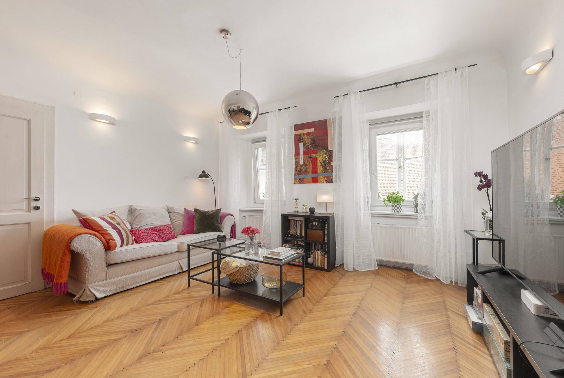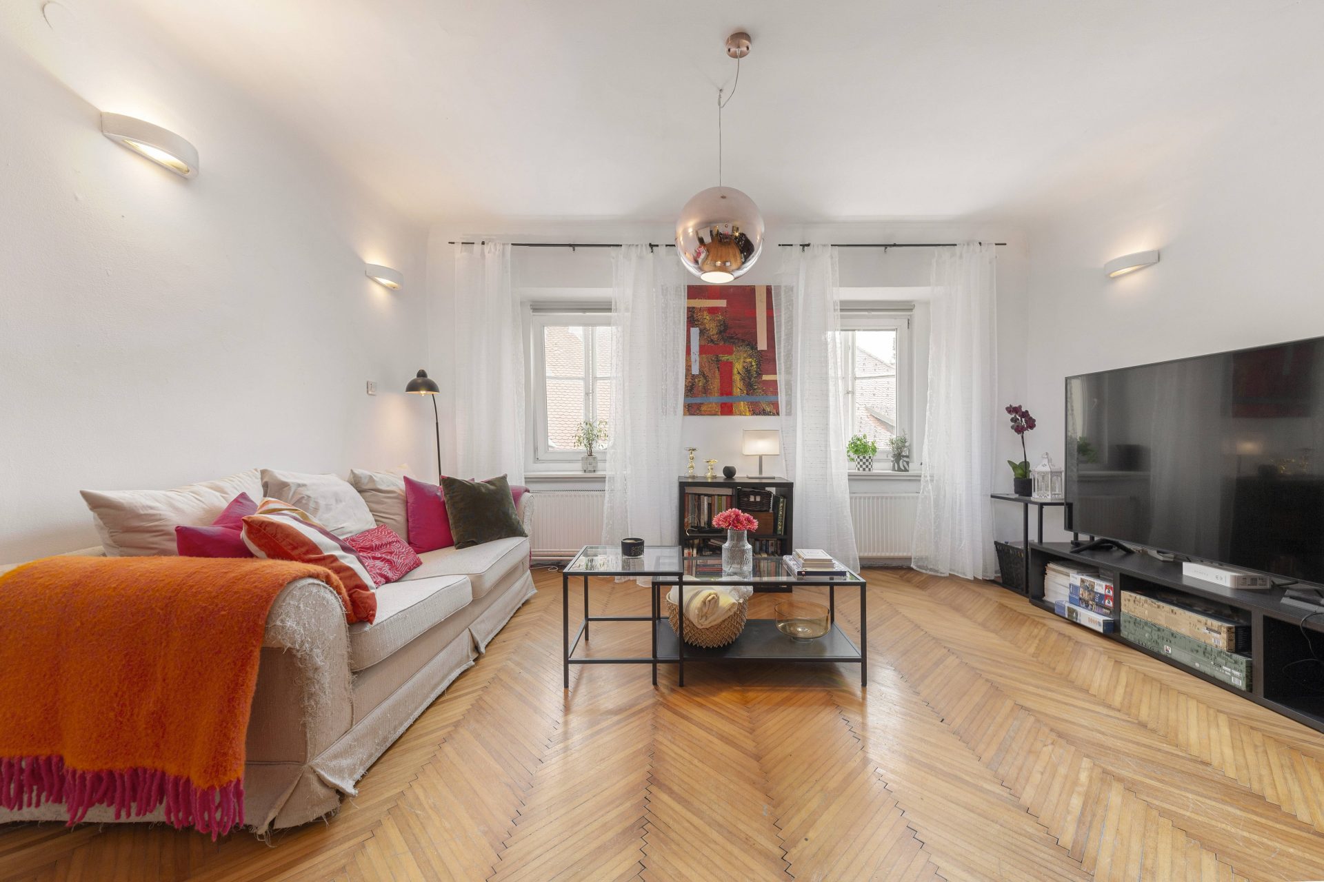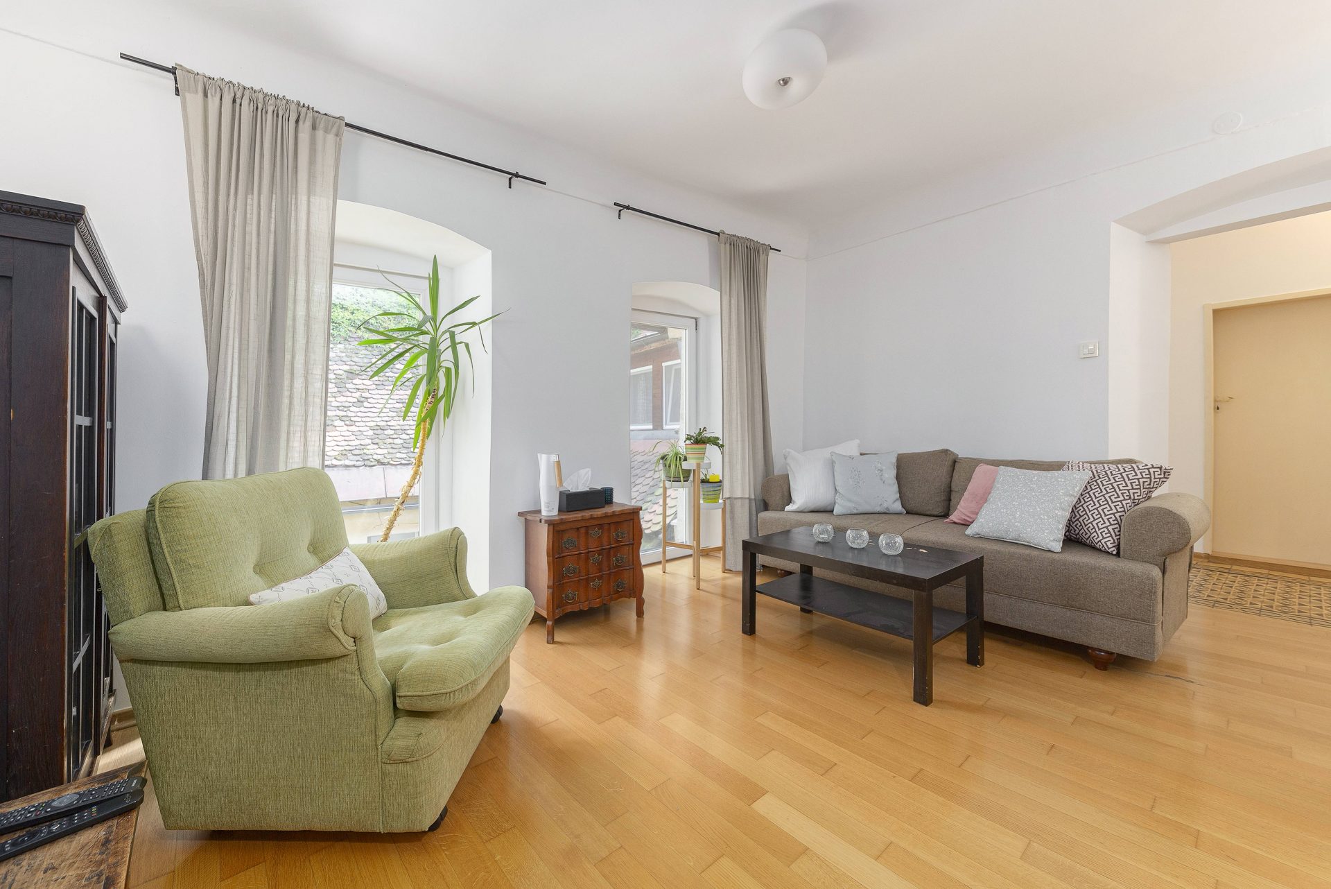 The smaller apartment is about 64m2 and comprises of a hallway, a well-sized kitchen, a large living & dining room. Off the living room is a lovely bedroom with direct access to a walk-in closet. Off the hallway are also a bathroom and a storage room. The living room and the bedroom overlook Gornji trg.
