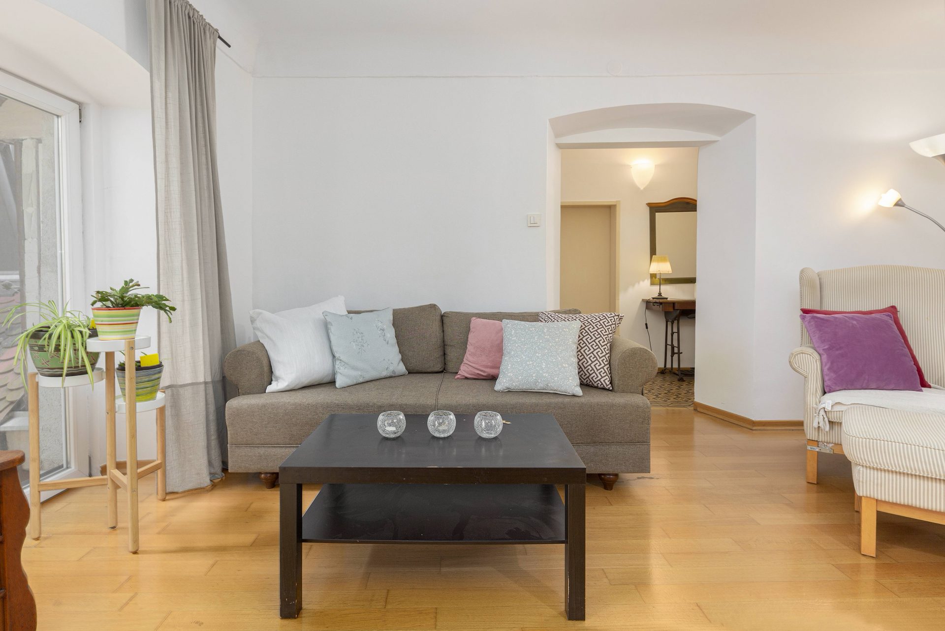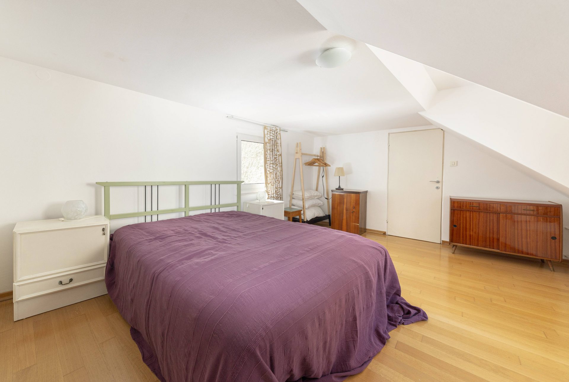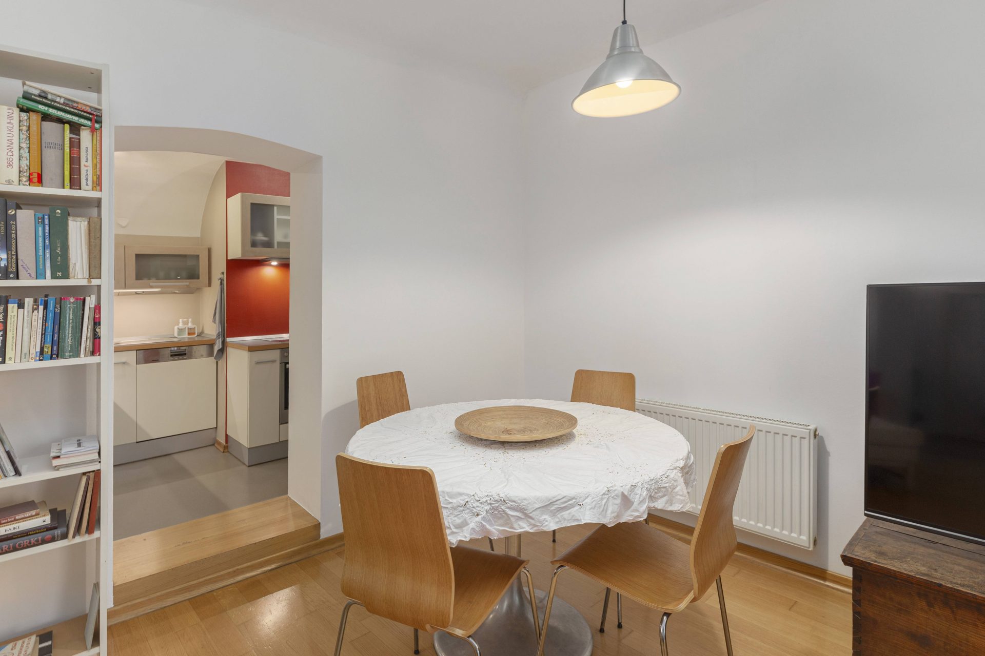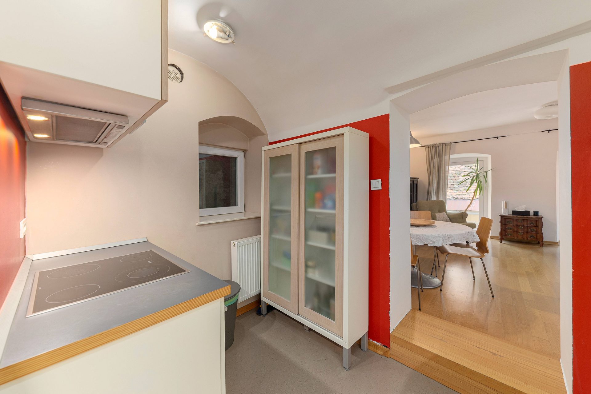 The smaller apartment is about 64m2 and comprises of a hallway, a well-sized kitchen, a large living & dining room. Off the living room is a lovely bedroom with direct access to a walk-in closet. Off the hallway are also a bathroom and a storage room. The living room and the bedroom overlook Gornji trg.
