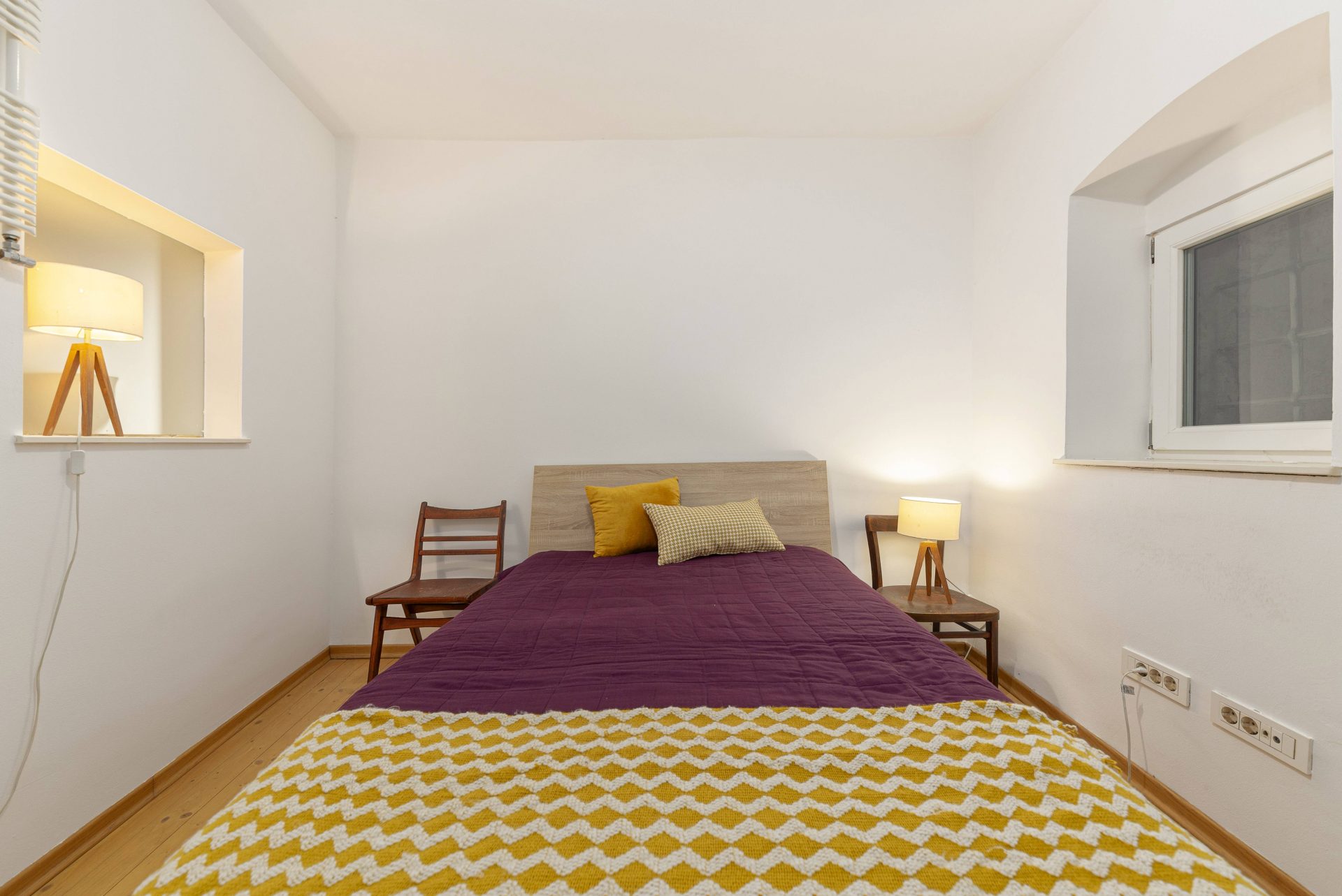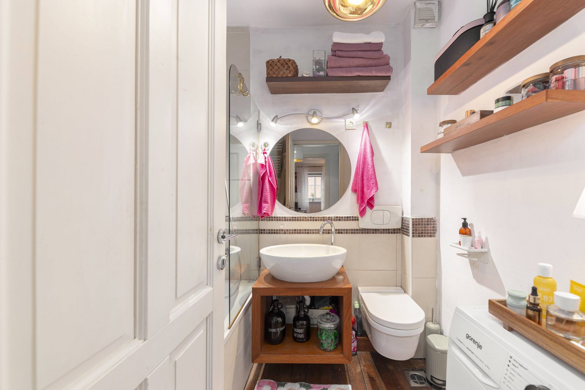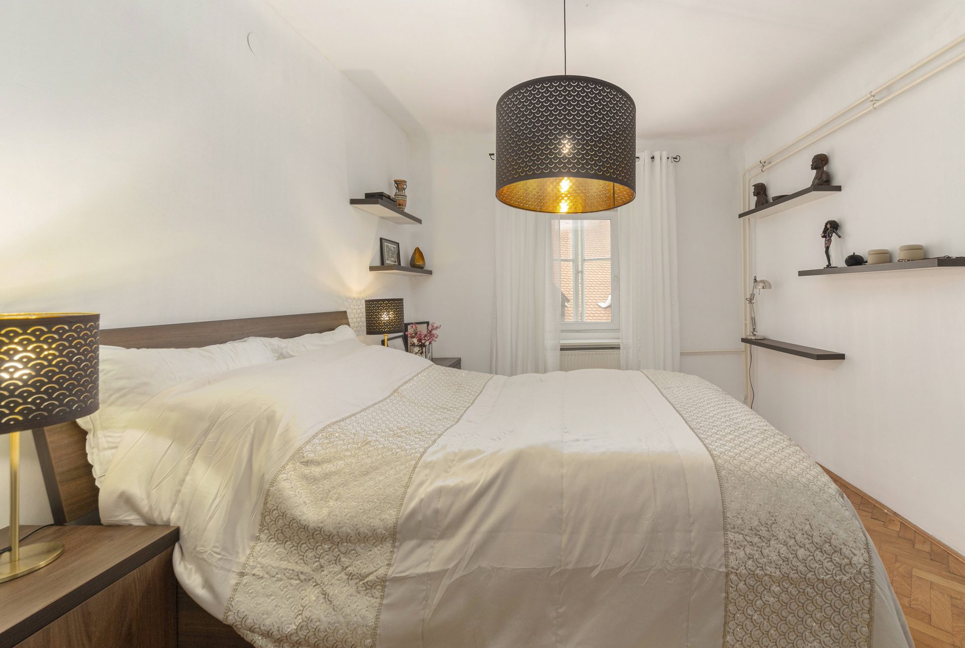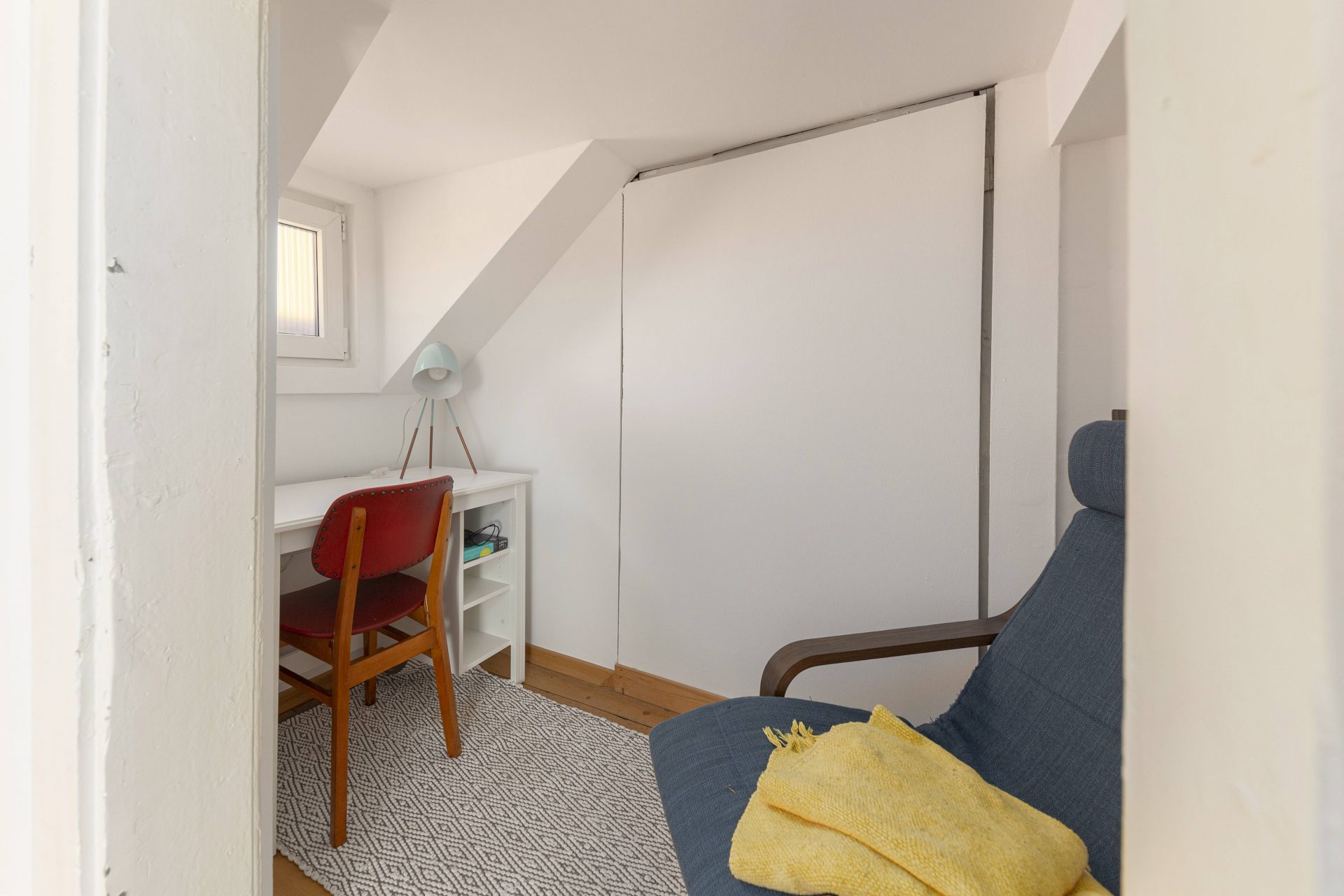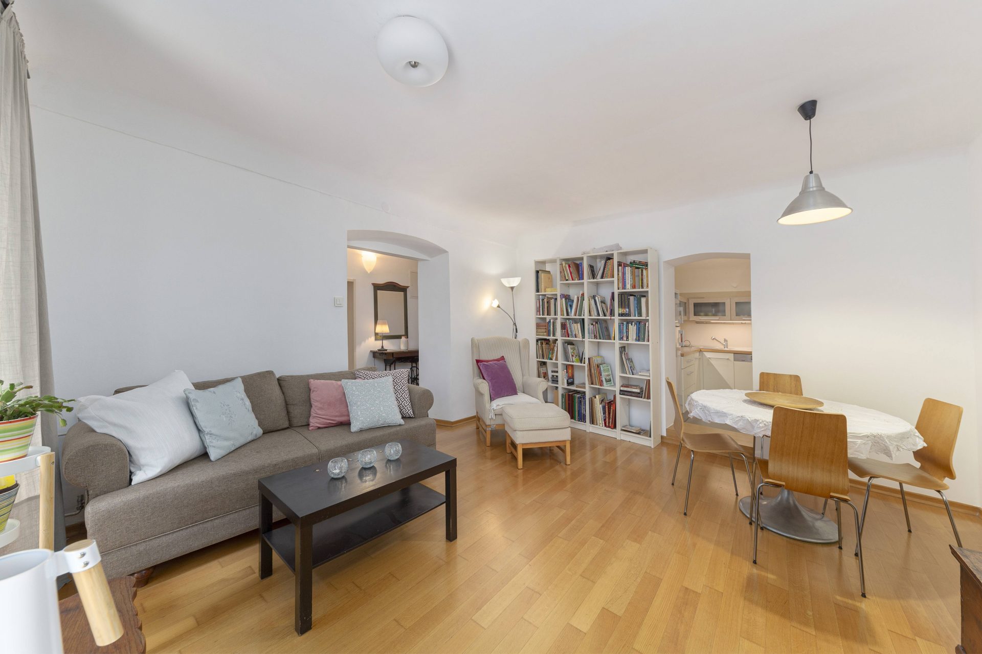 The smaller apartment is about 64m2 and comprises of a hallway, a well-sized kitchen, a large living & dining room. Off the living room is a lovely bedroom with direct access to a walk-in closet. Off the hallway are also a bathroom and a storage room. The living room and the bedroom overlook Gornji trg.