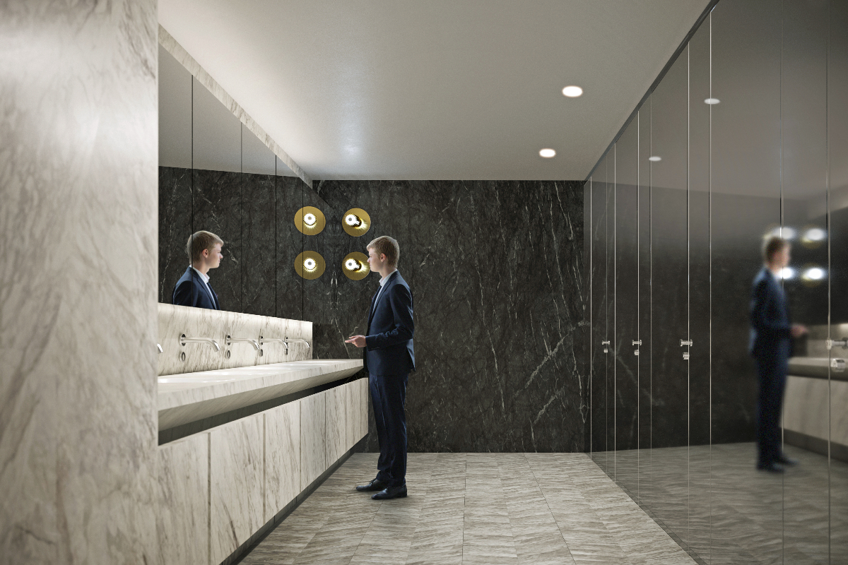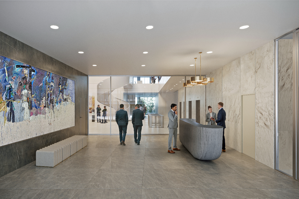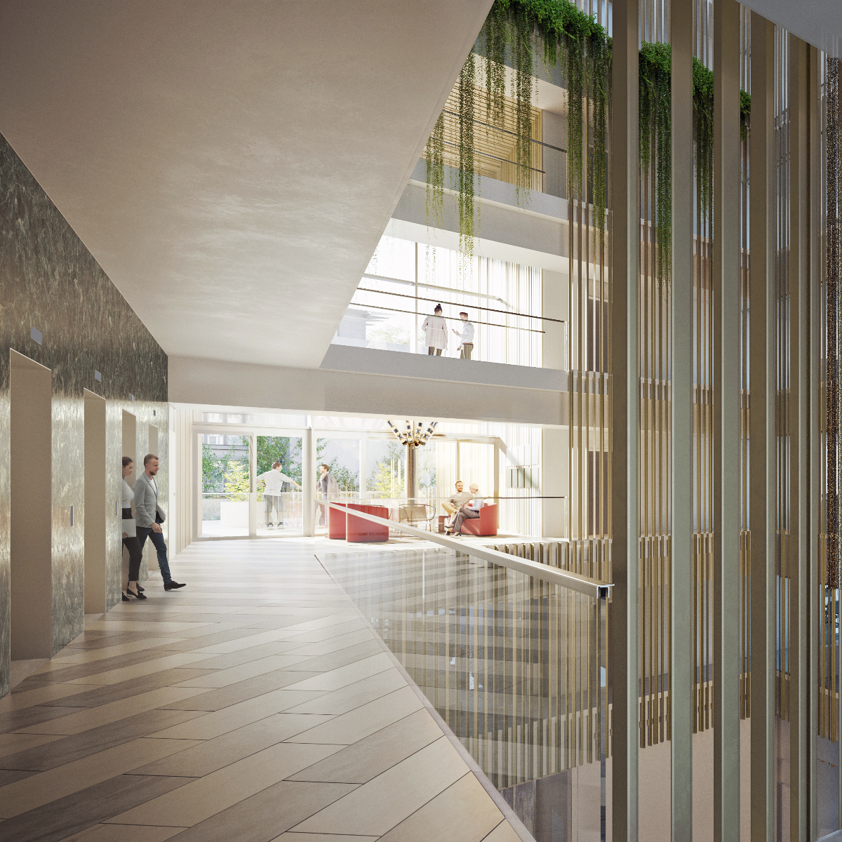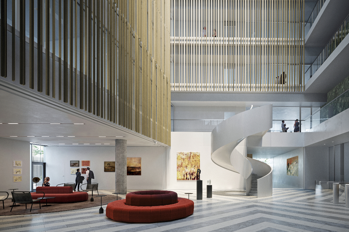 Entrance hall with reception: On the ground floor the multi-storey atrium ends with an entrance hall. In the lobby, there is an access control room next to the core of the elevator.The lobby can be used for social events such as receptions or exhibitions and is well connected to the gallery. There is also a reception area at the entrance.