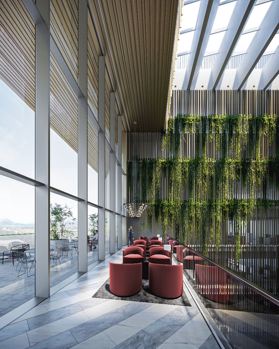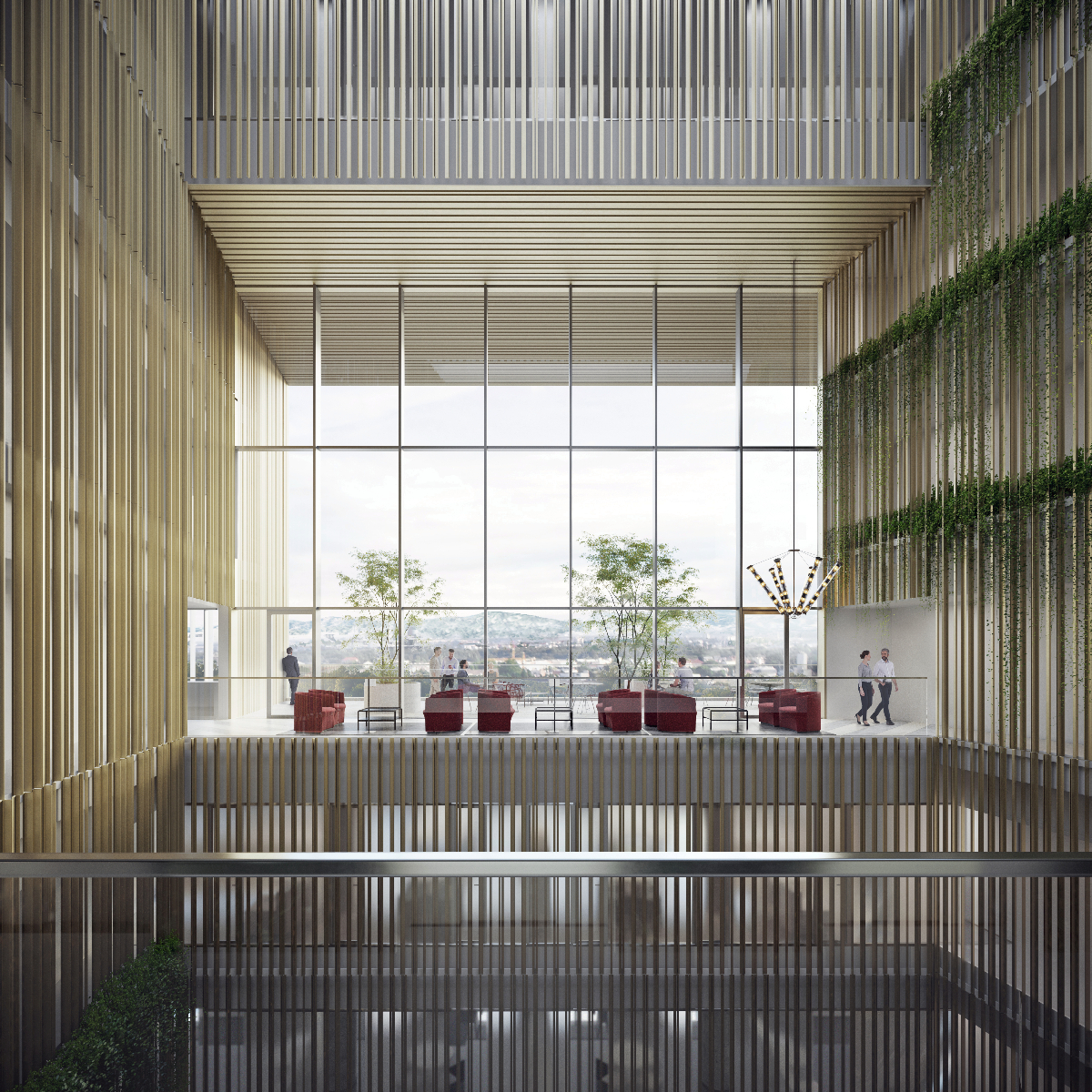 The interior atrium offers natural light for all office spaces. It gives light to the internal office space on the lower floors and open magnificent views of the city centre and the mountains for the upper floors.