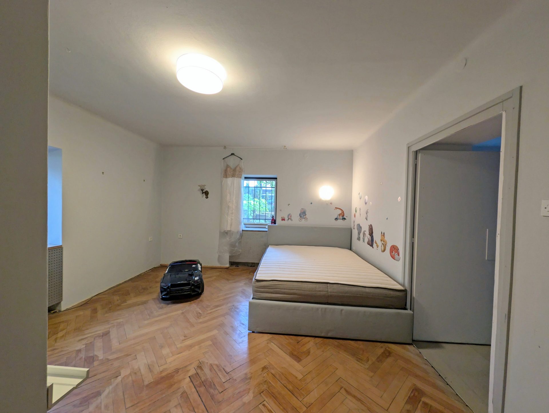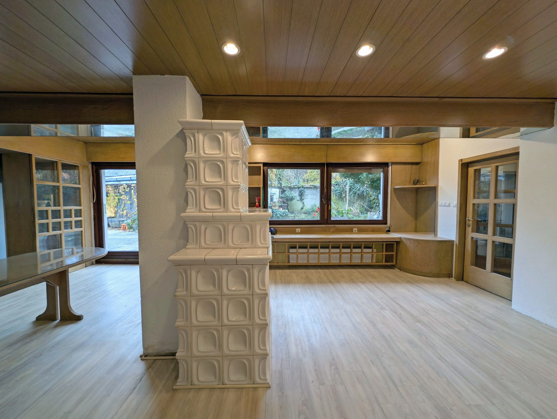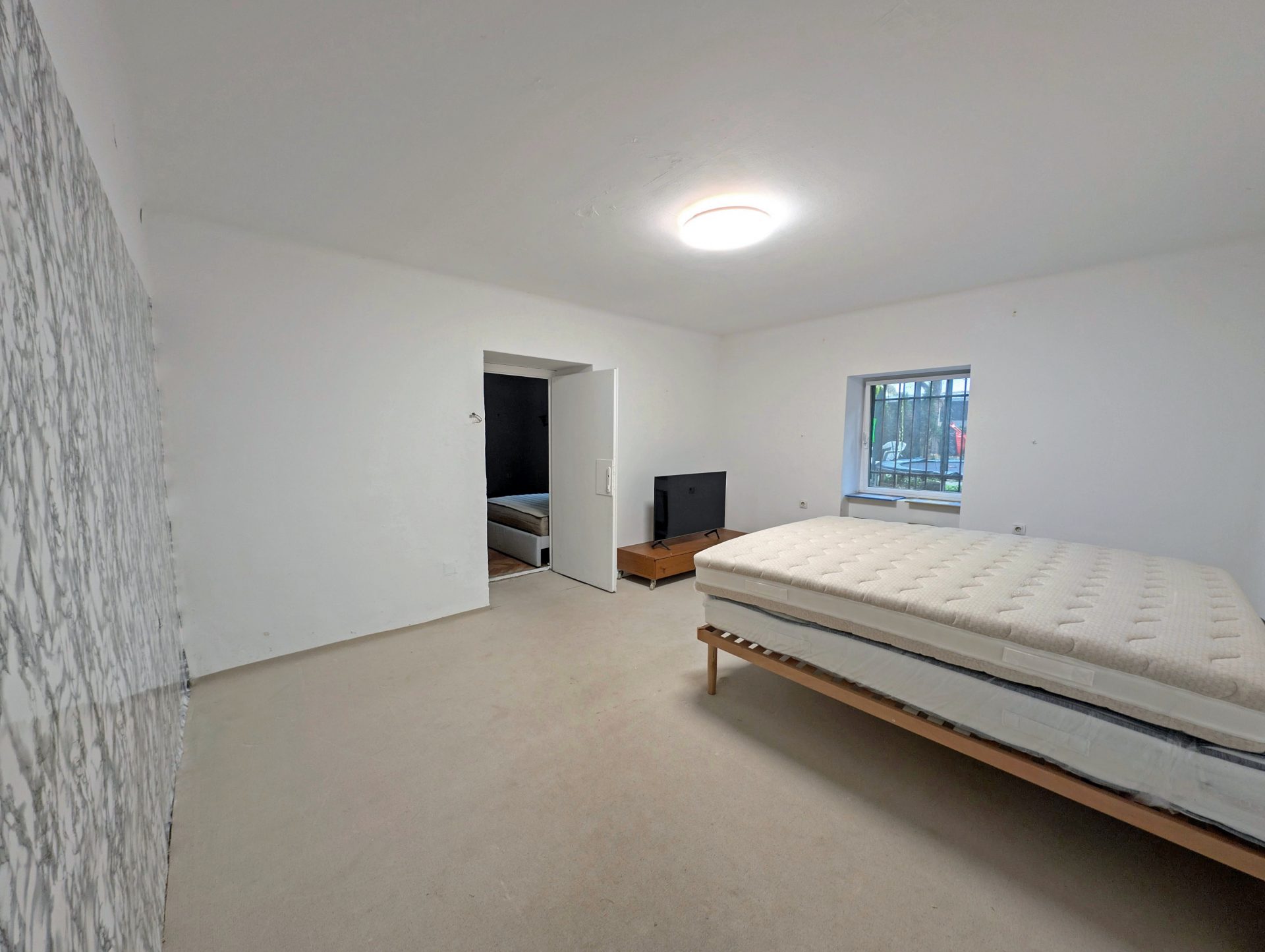 From the entry area and central hallway, there is access to all rooms. On the right hand side there is a spacious and bright living room, dining area and a kitchen that has access to the outside garden. Following the hallway, on the left, there is a bathroom and separate toilet. At the end of the hallway there are three big rooms, one of them is currently used as a living area. An additional smaller one for wardrobe.