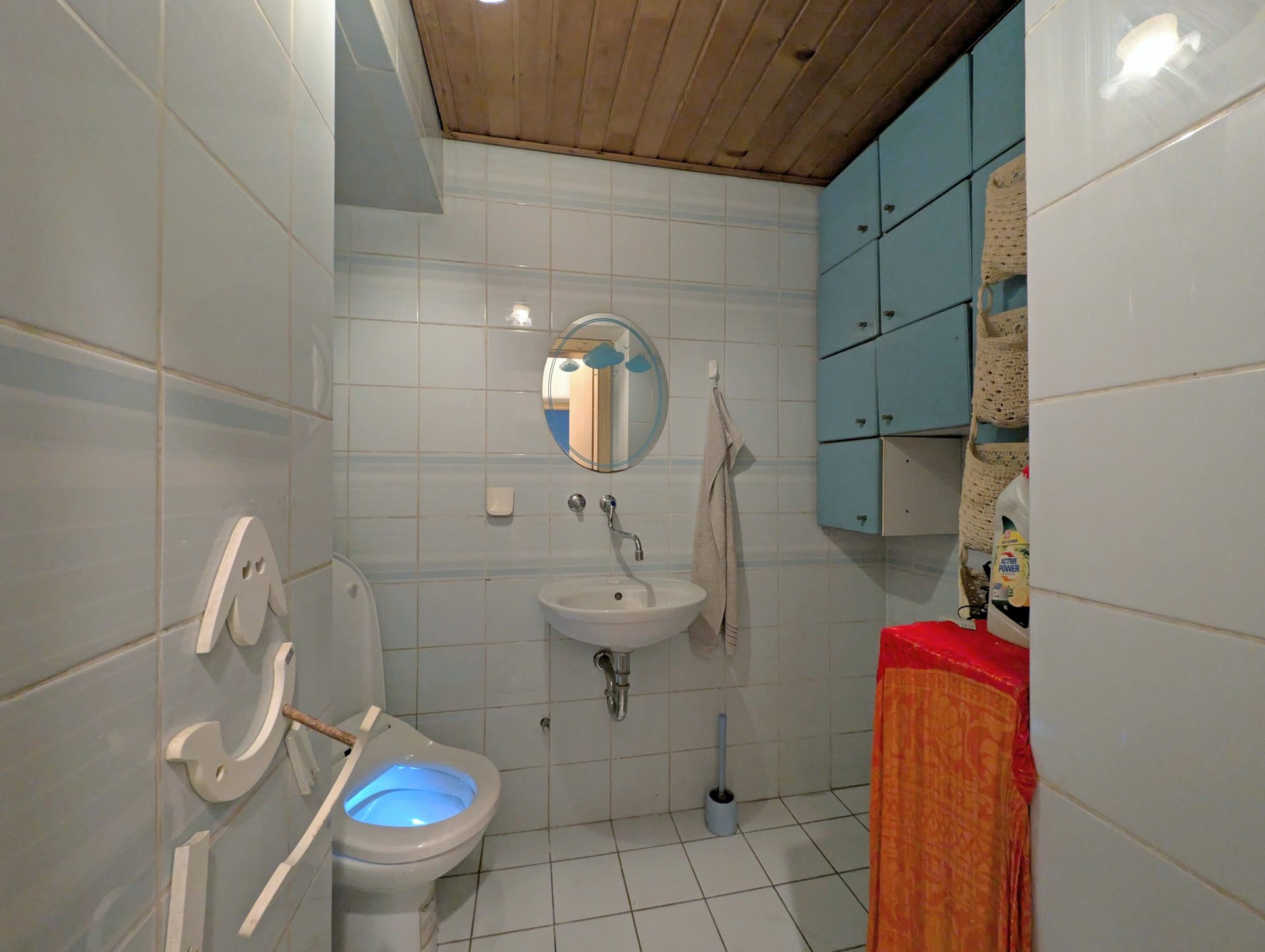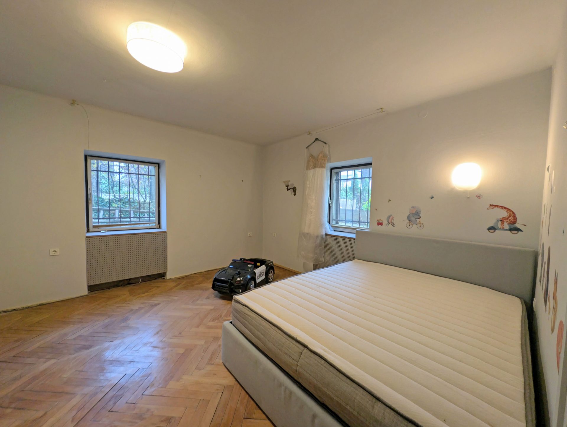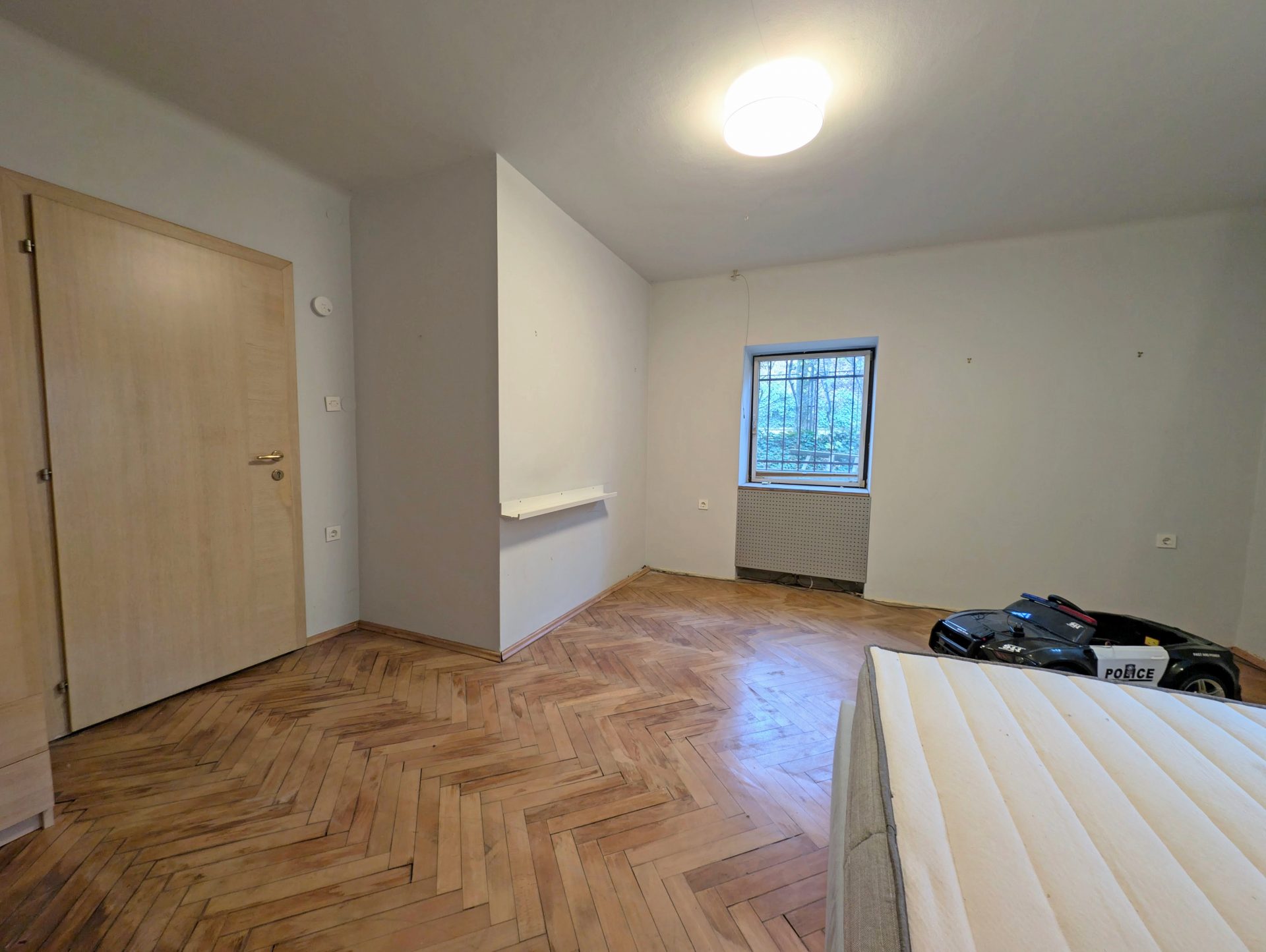 From the entry area and central hallway, there is access to all rooms. On the right hand side there is a spacious and bright living room, dining area and a kitchen that has access to the outside garden. Following the hallway, on the left, there is a bathroom and separate toilet. At the end of the hallway there are three big rooms, one of them is currently used as a living area. An additional smaller one for wardrobe.