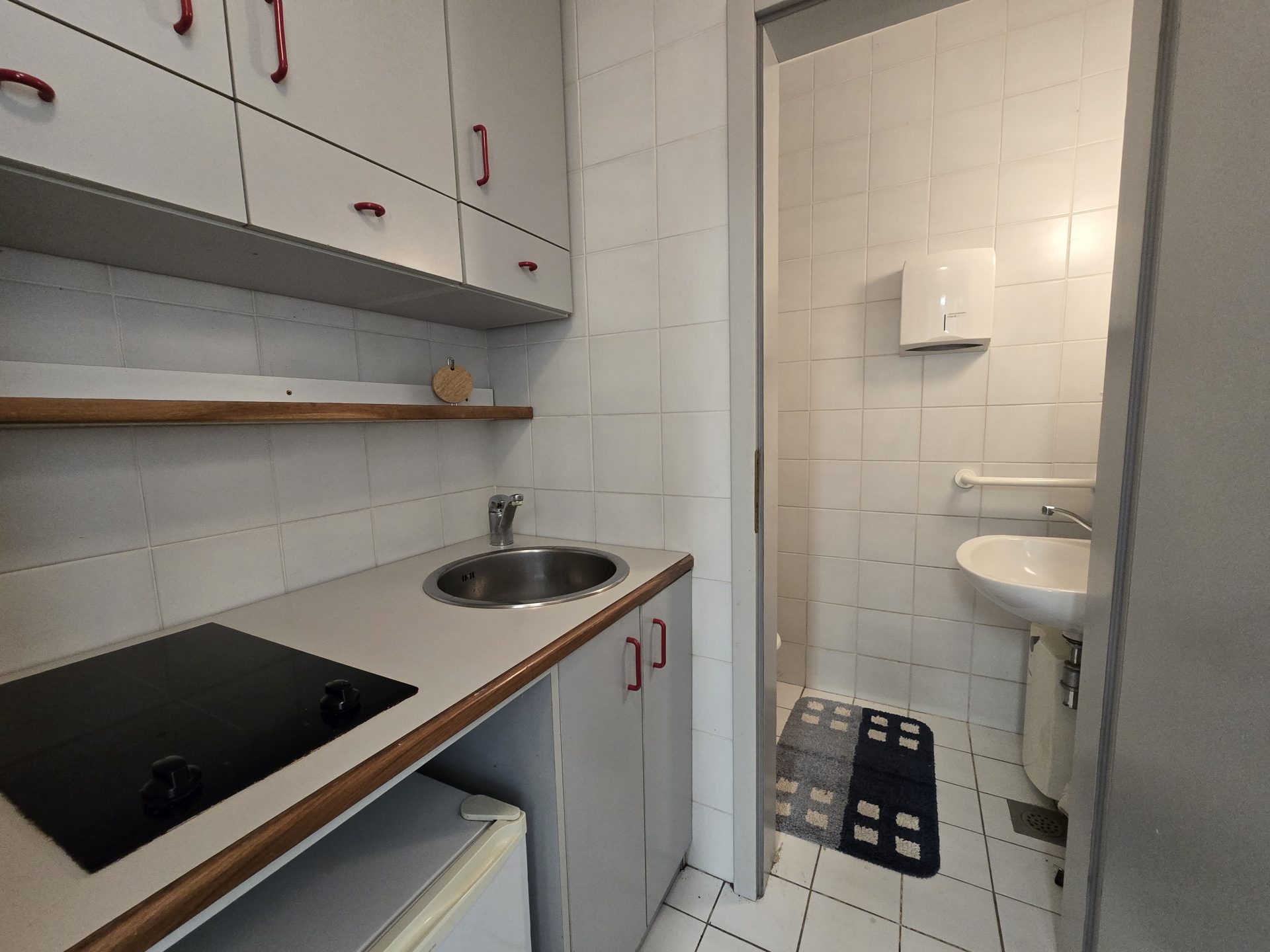 The office comprises two separate offices, a meeting room, an entrance area, a small kitchen, and restroom facilities. The layout is practical and allows for an efficient workflow, with a clear separation between individual workspaces and collaborative areas.