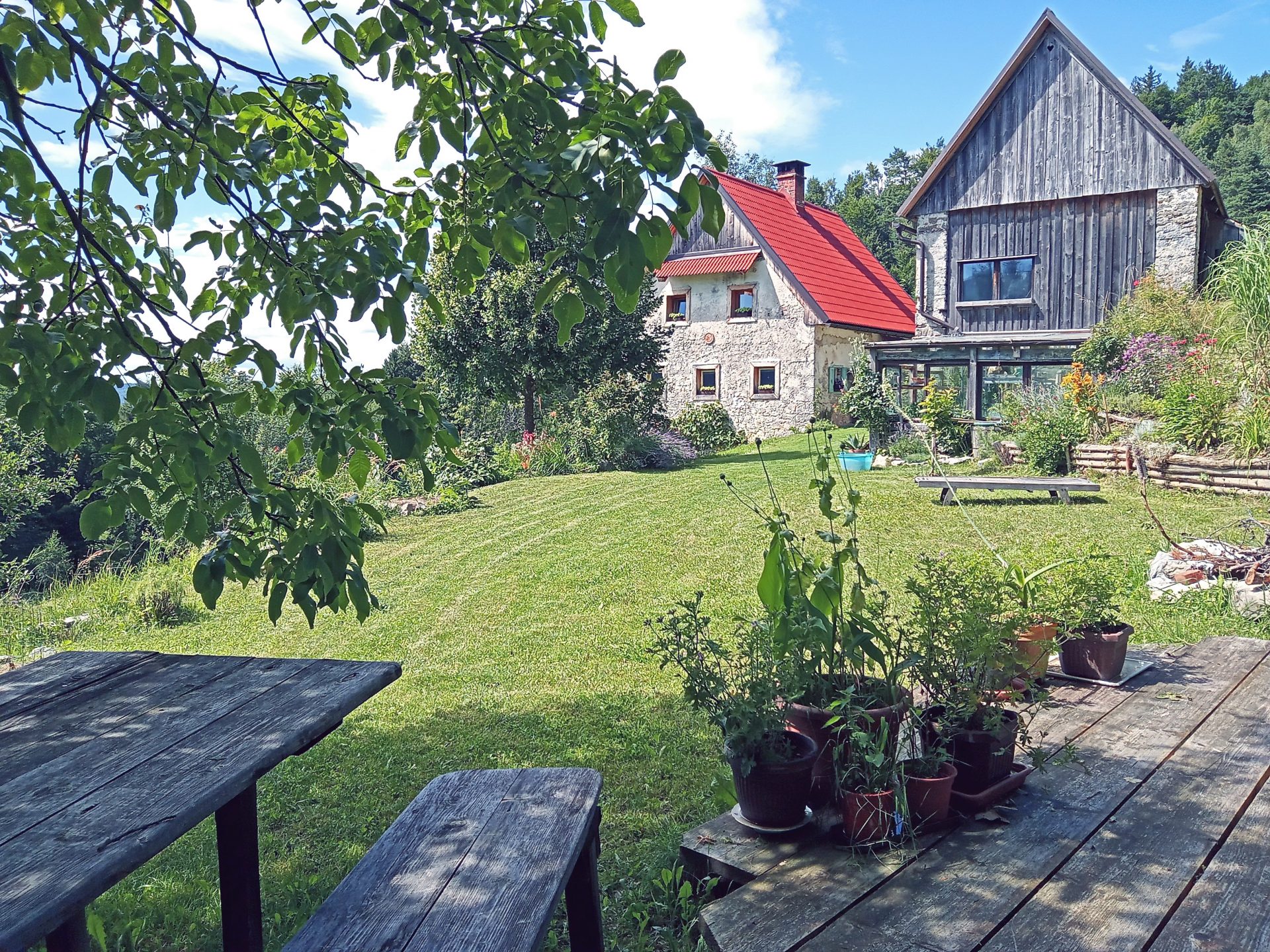 Kmetija je lepo vzdrževana in ima urejena dva velika vrtova in njivo. Vrtova imata urejene zalogovnike vode za zalivanje.Zemlja je zelo rodovitna in je obdelana z občutkom do narave, po načelih permakulture in biodinamike. Ima stare sorte visokodebelnih hrušk, nasad jablan, nasad ameriških borovnic, malin, robid, ribeza in še mnogo drugih sadnih vrst. Okolica hiše ima veliko cvetličnih in zeliščnih gredic.