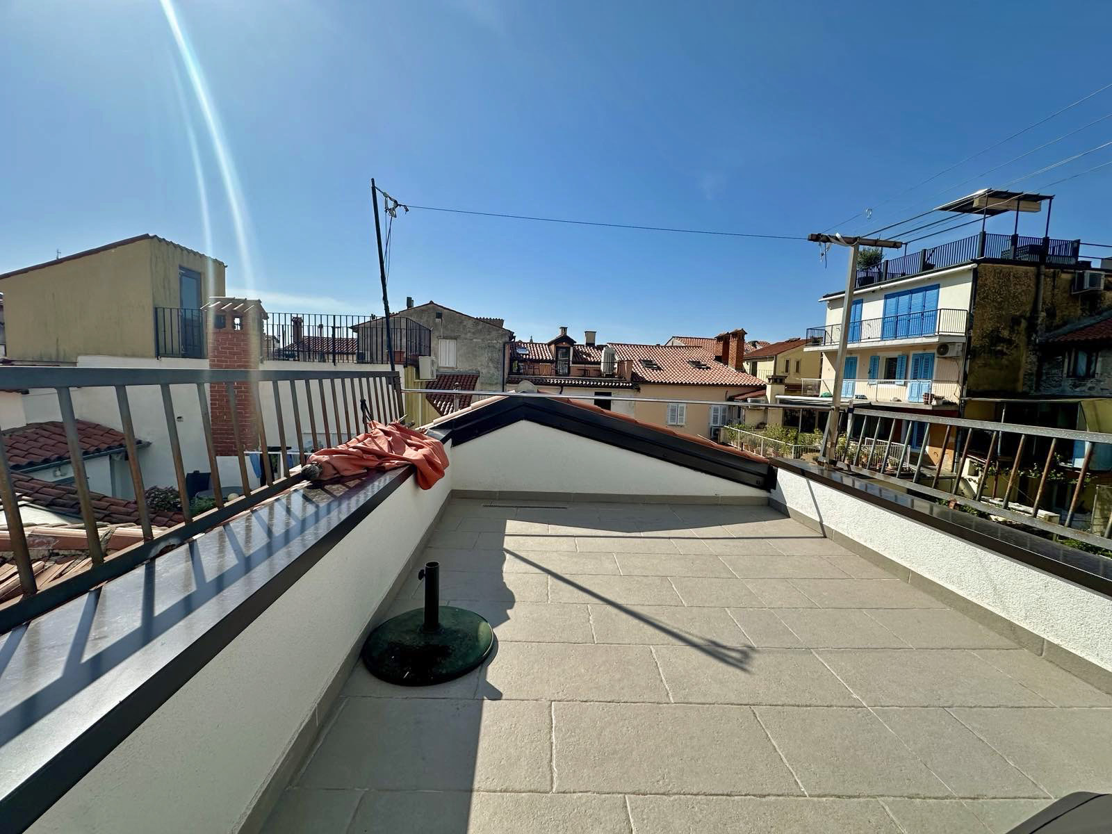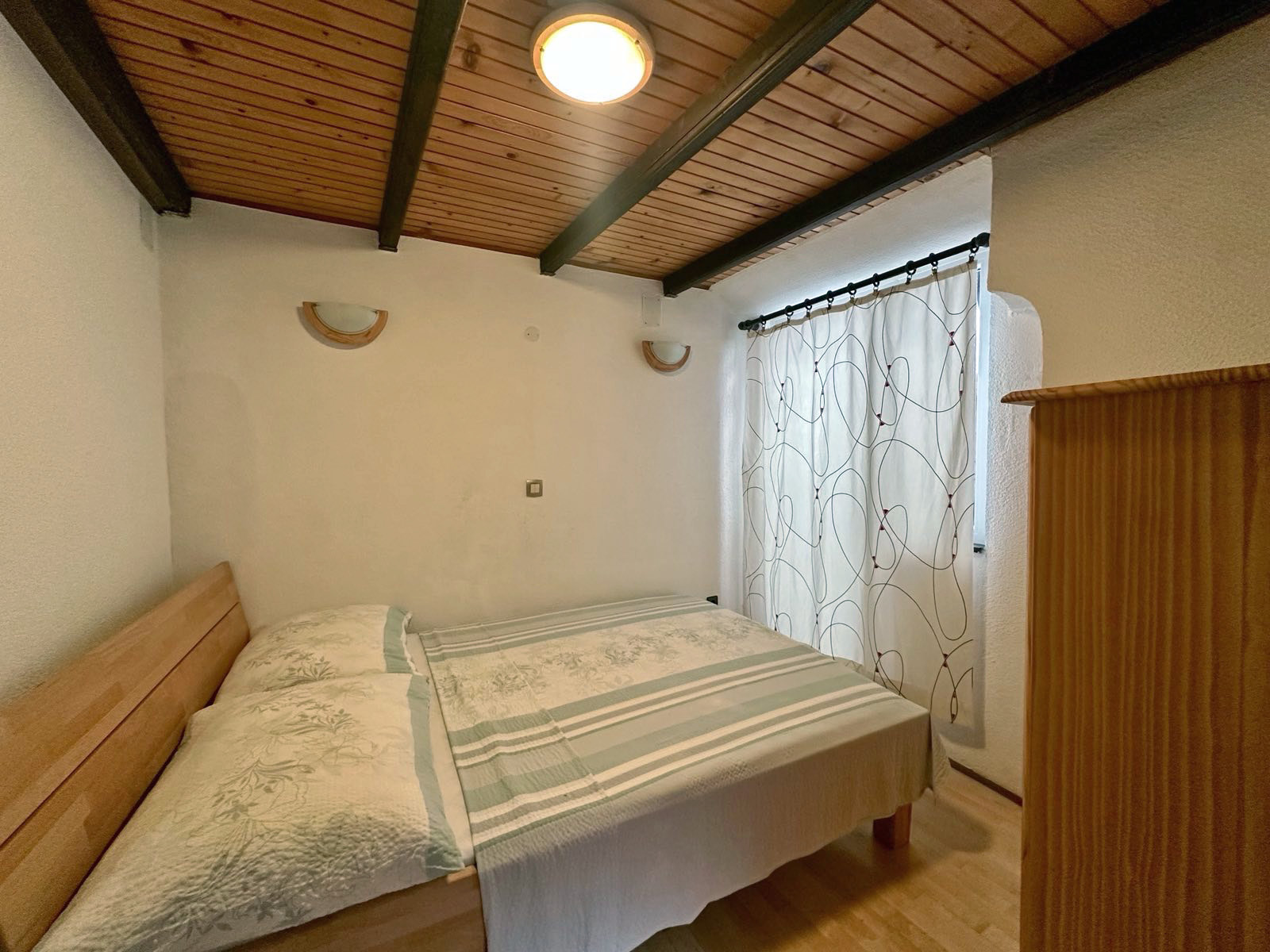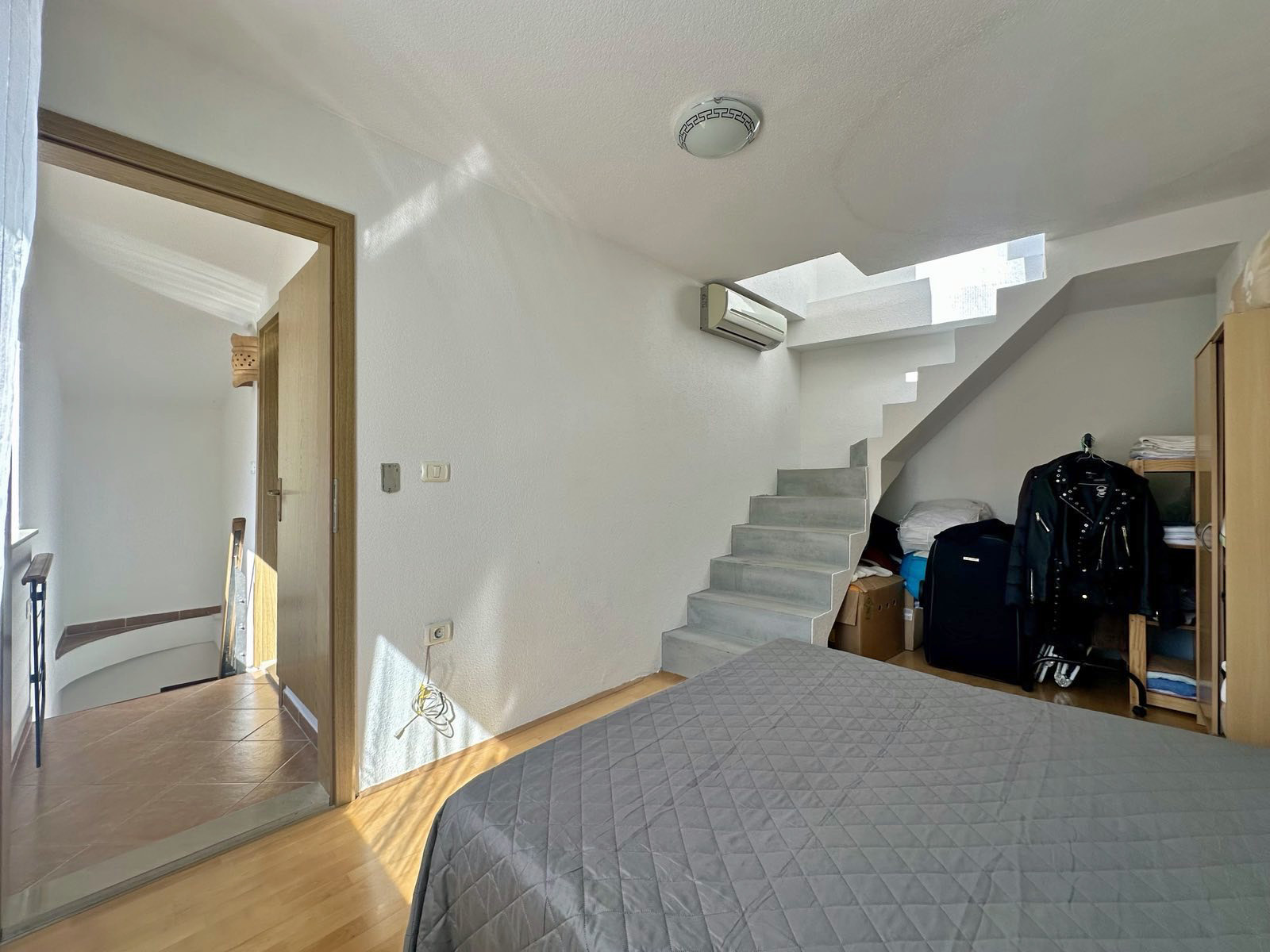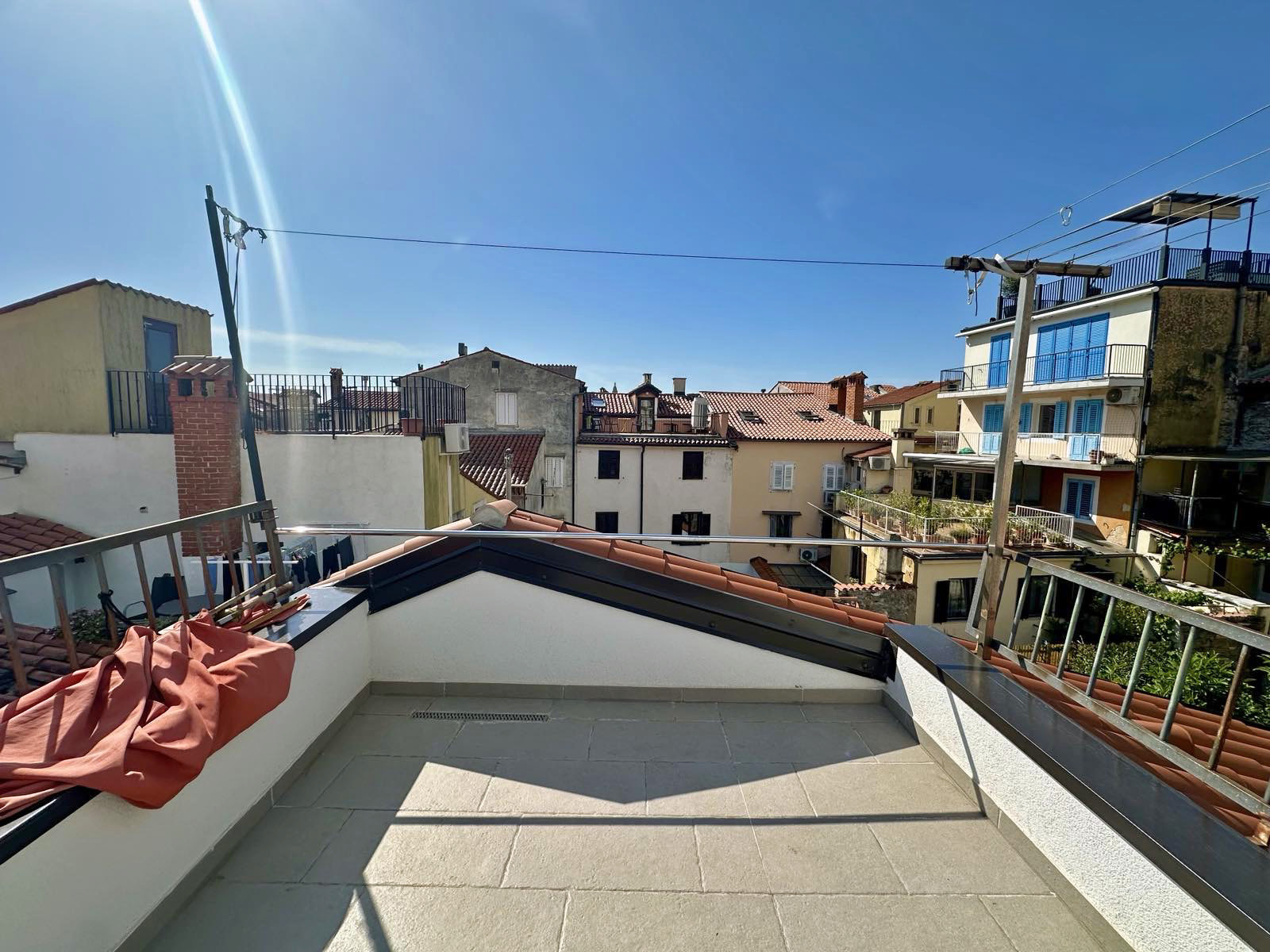 On the second floor there is a spacious bedroom connected to the terrace that offers great views of the red rooftops of Piran.