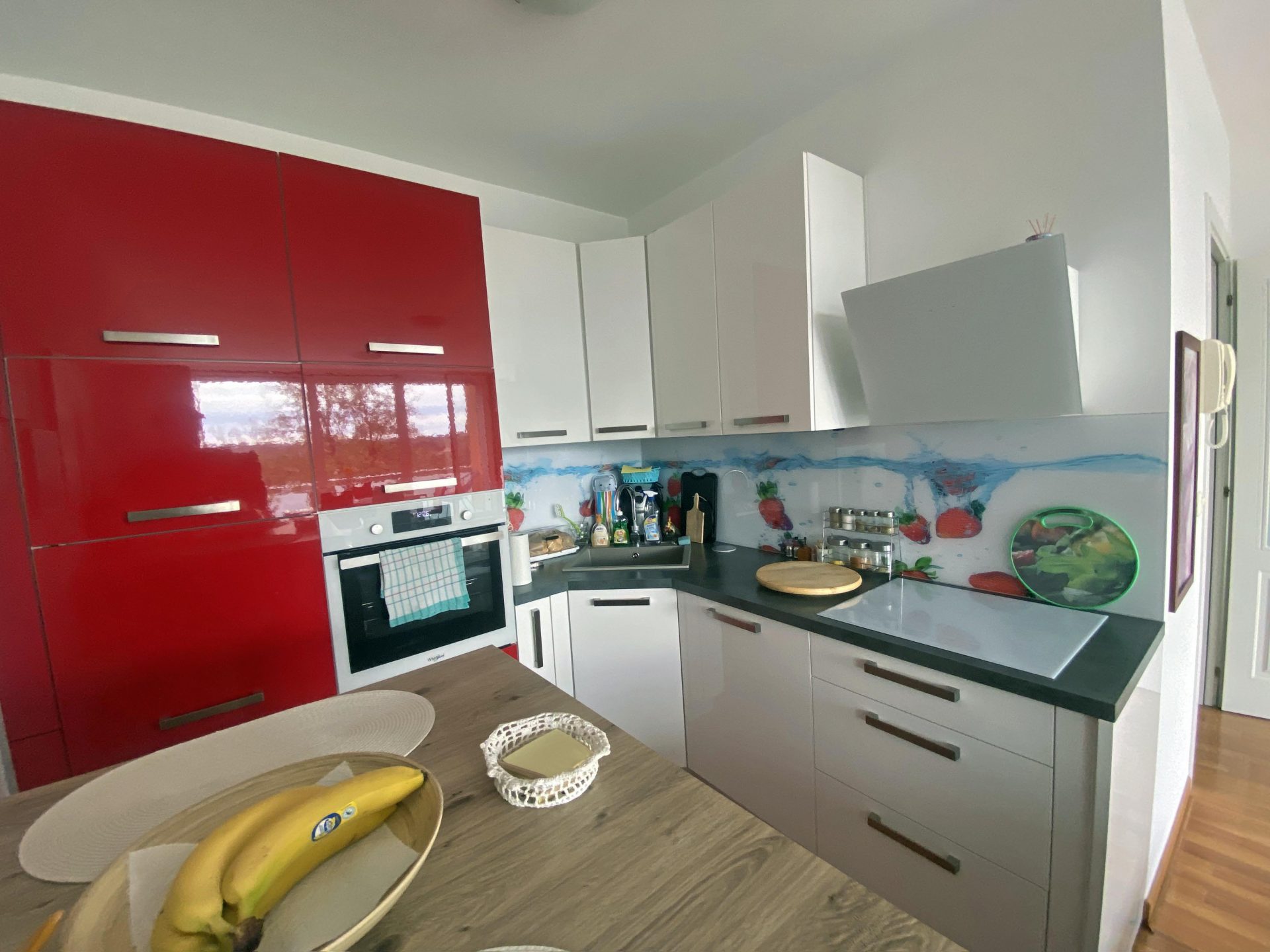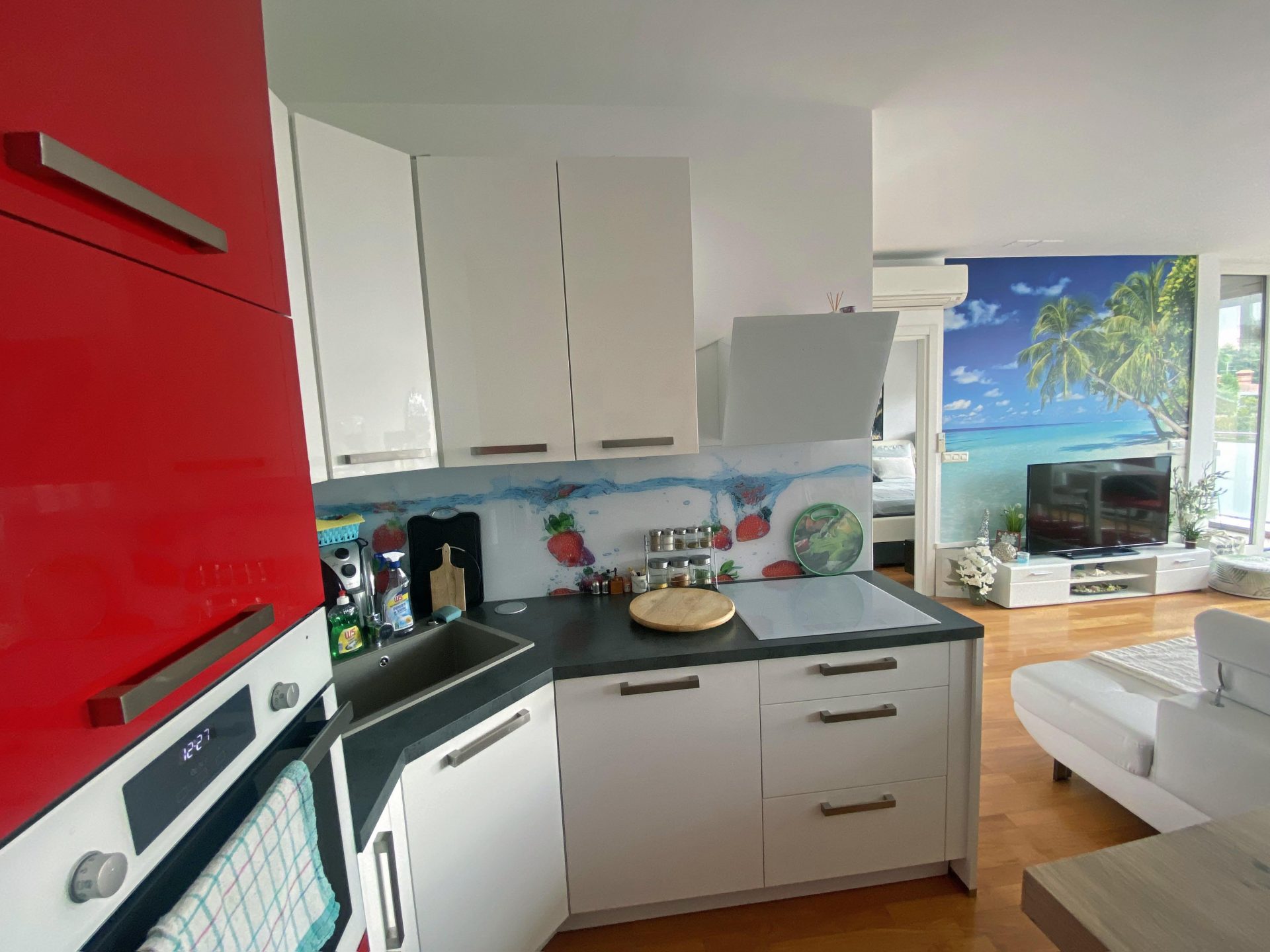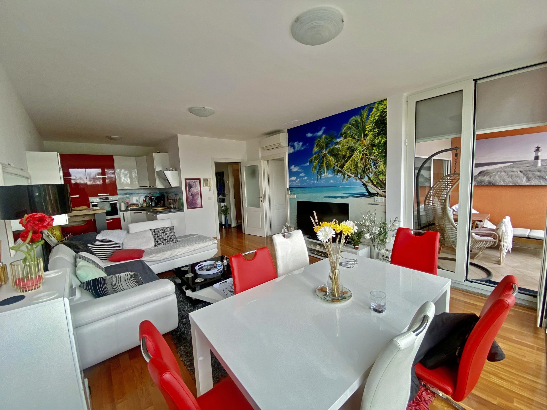 It comprises of an entrance hallway with a large wardrobe, a bathroom with a shower and a bathtub, a kitchen with a dining room area and a larger living room with a balcony. There is an additional closed balcony and a bedroom with lots of closet space.