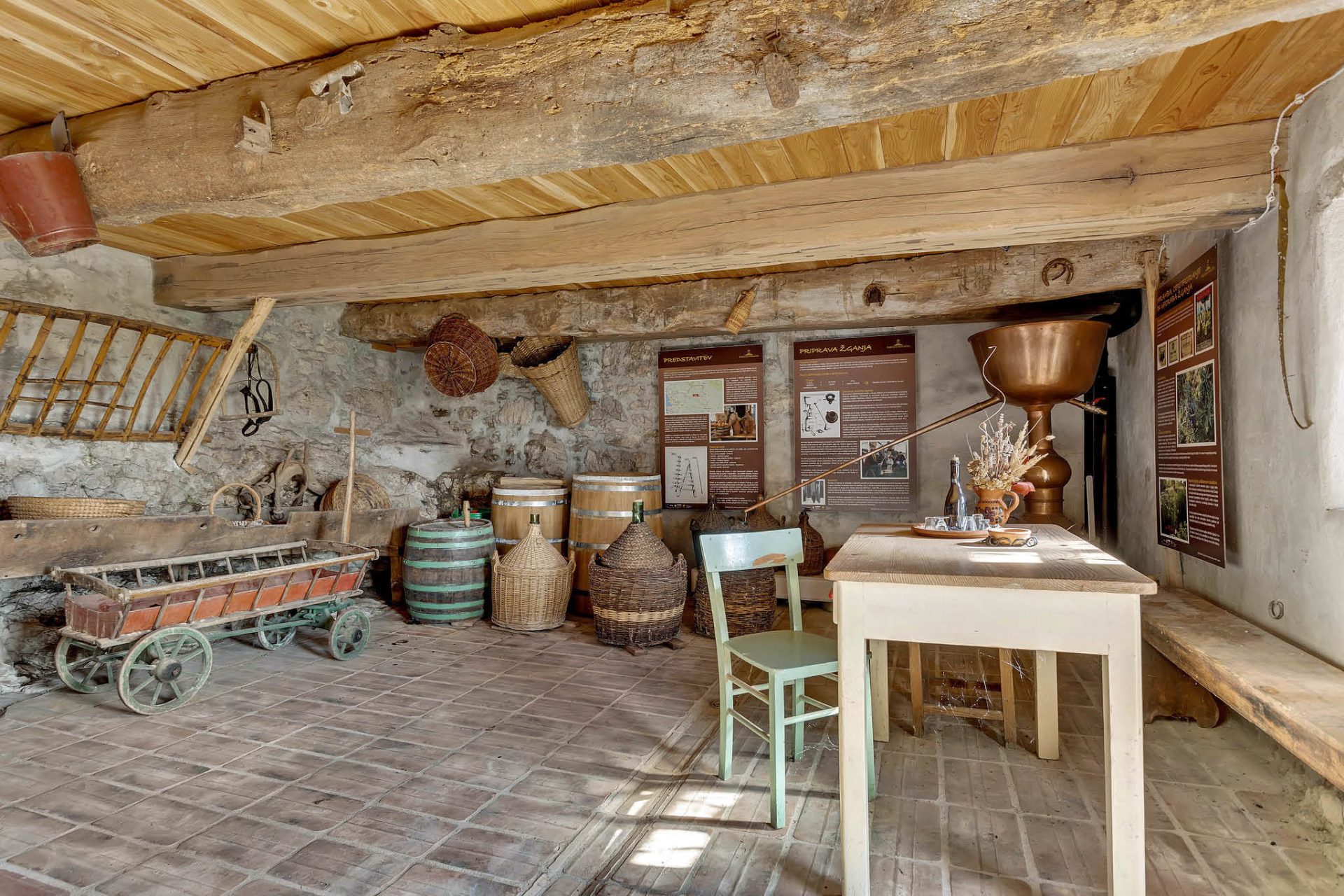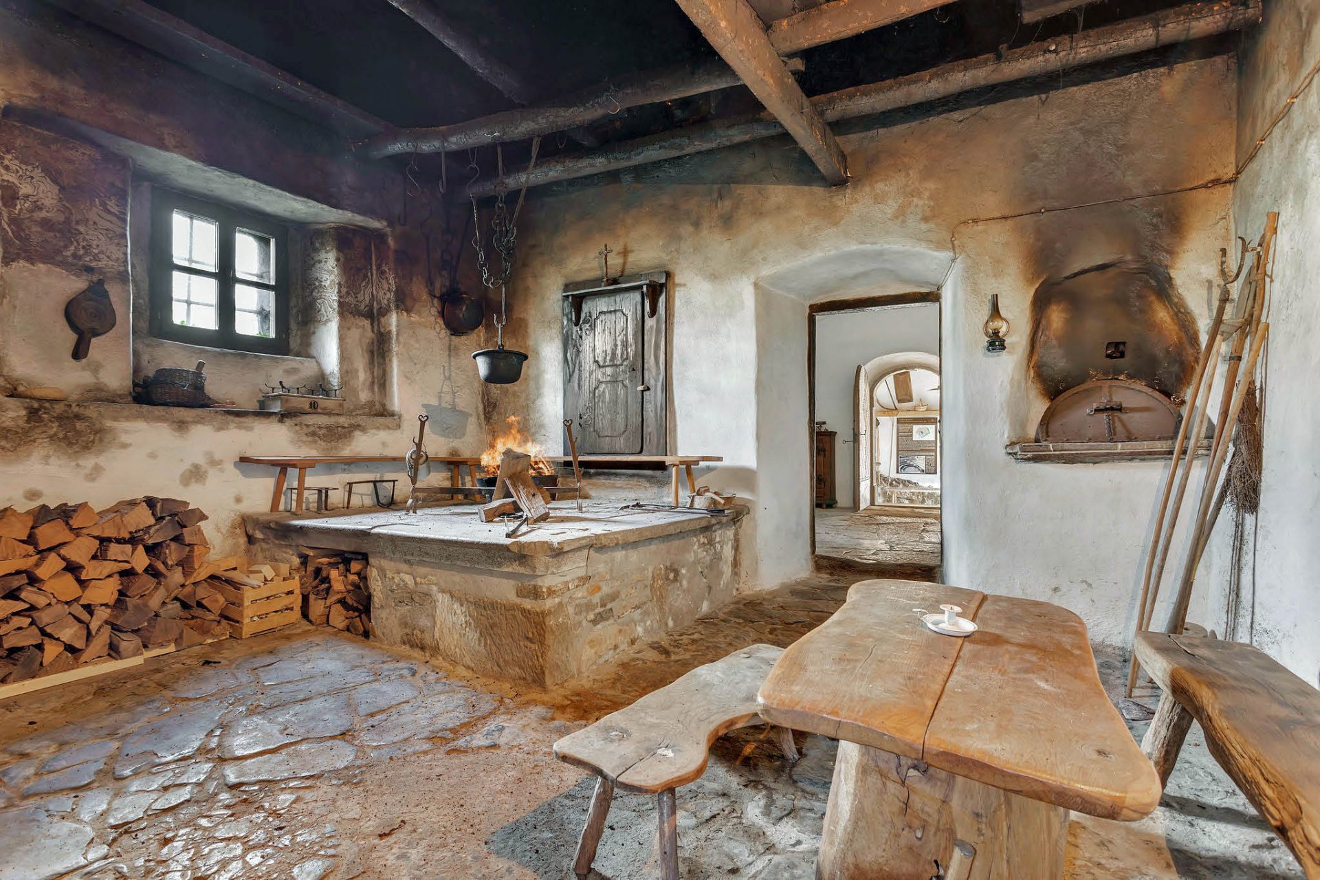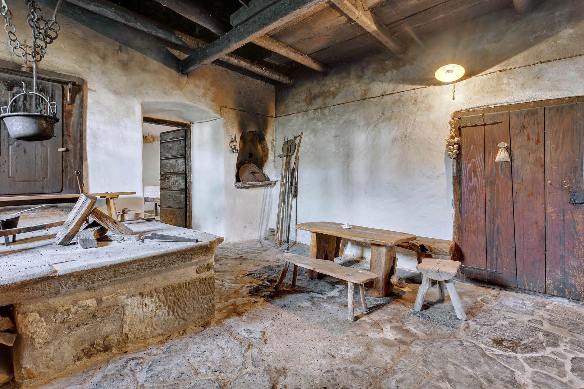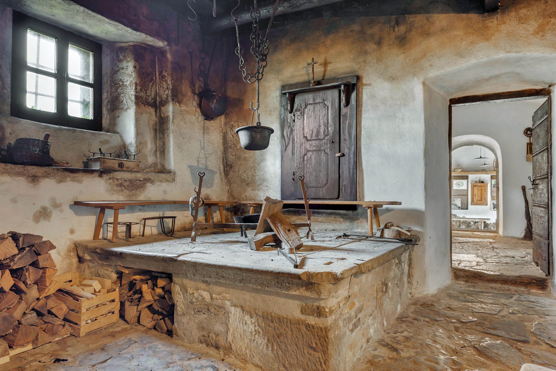There is an entrance with a large hallway that leads to additional room with a display of pictures and tools from the old times and so called “black” kitchen.