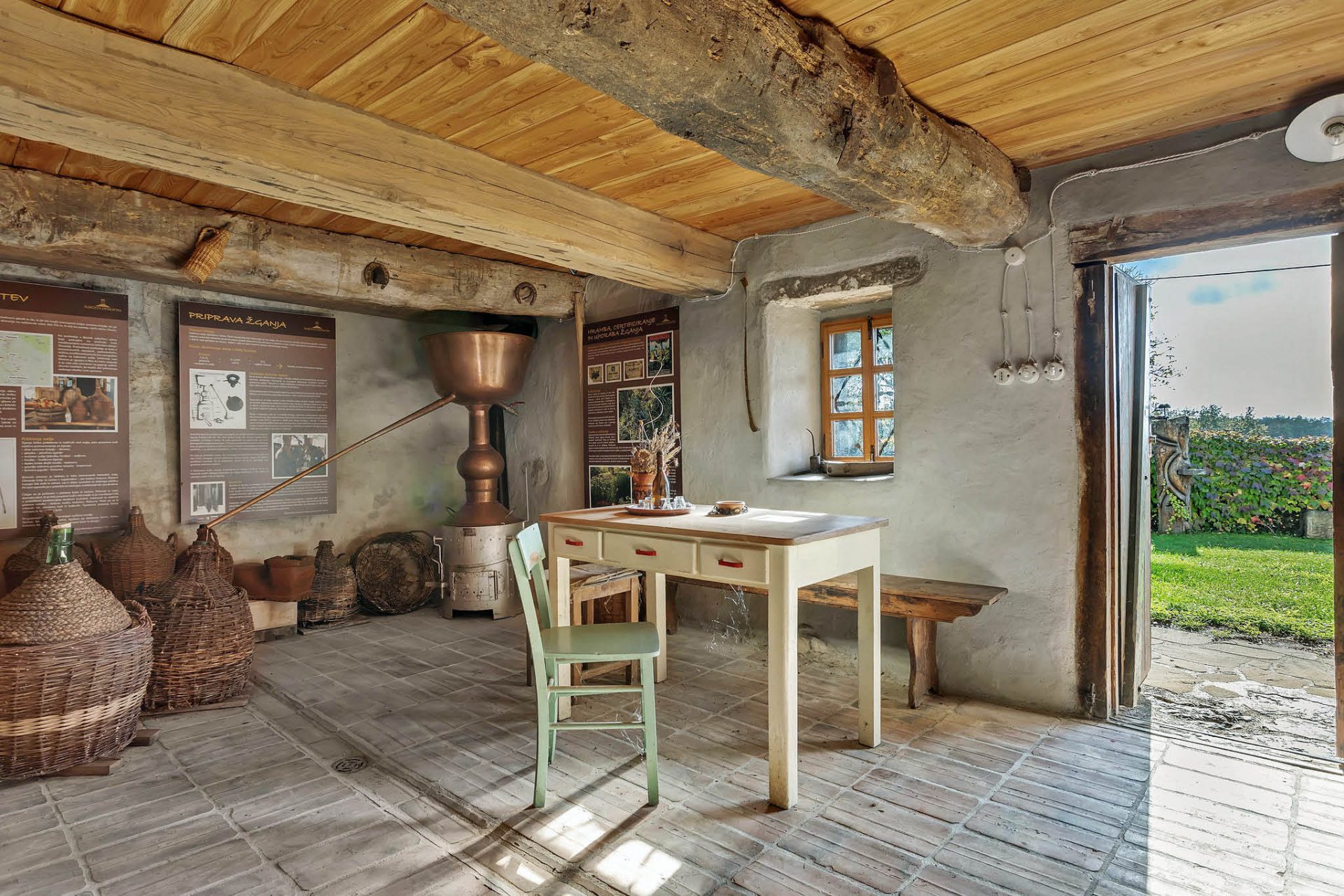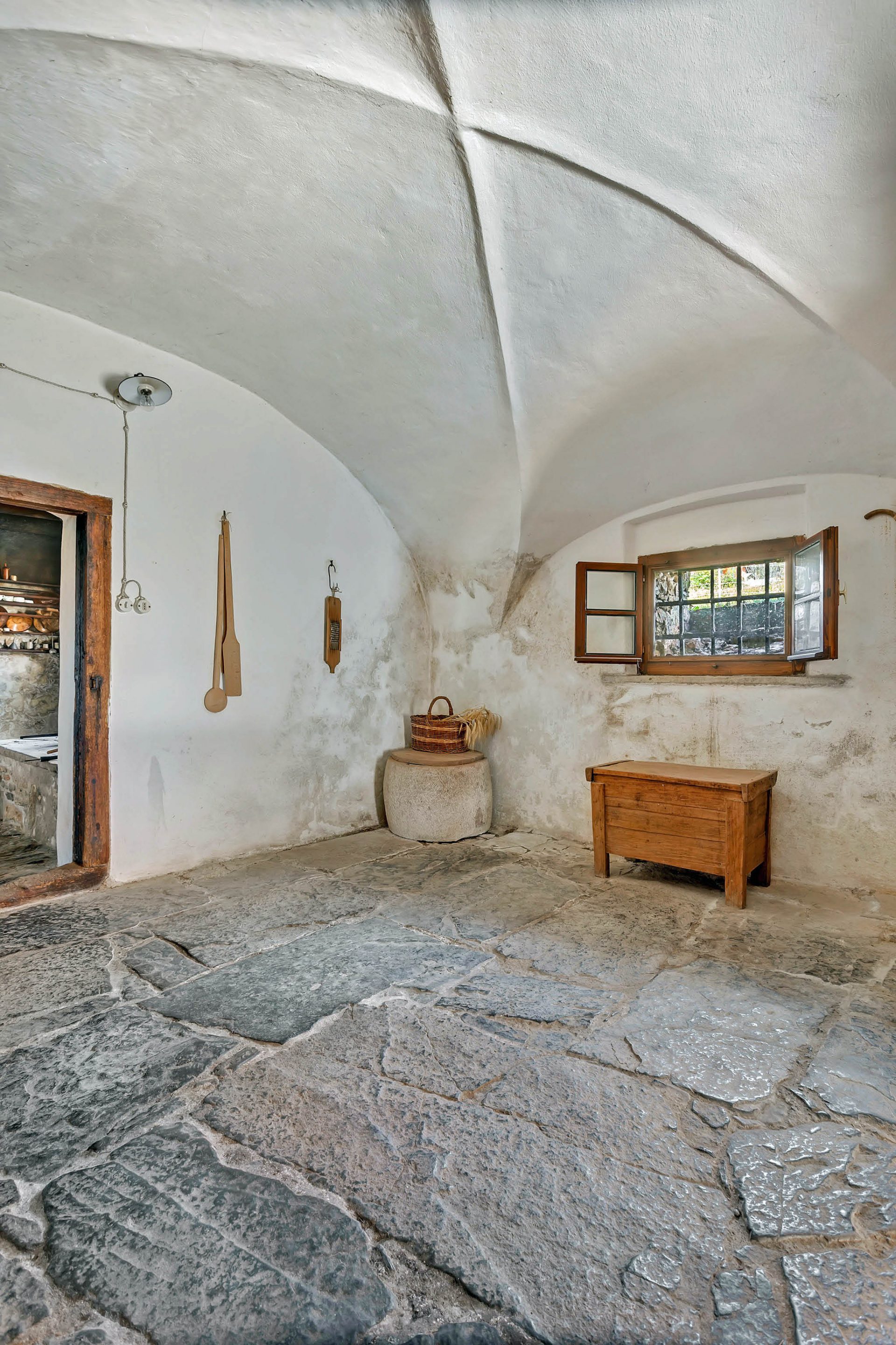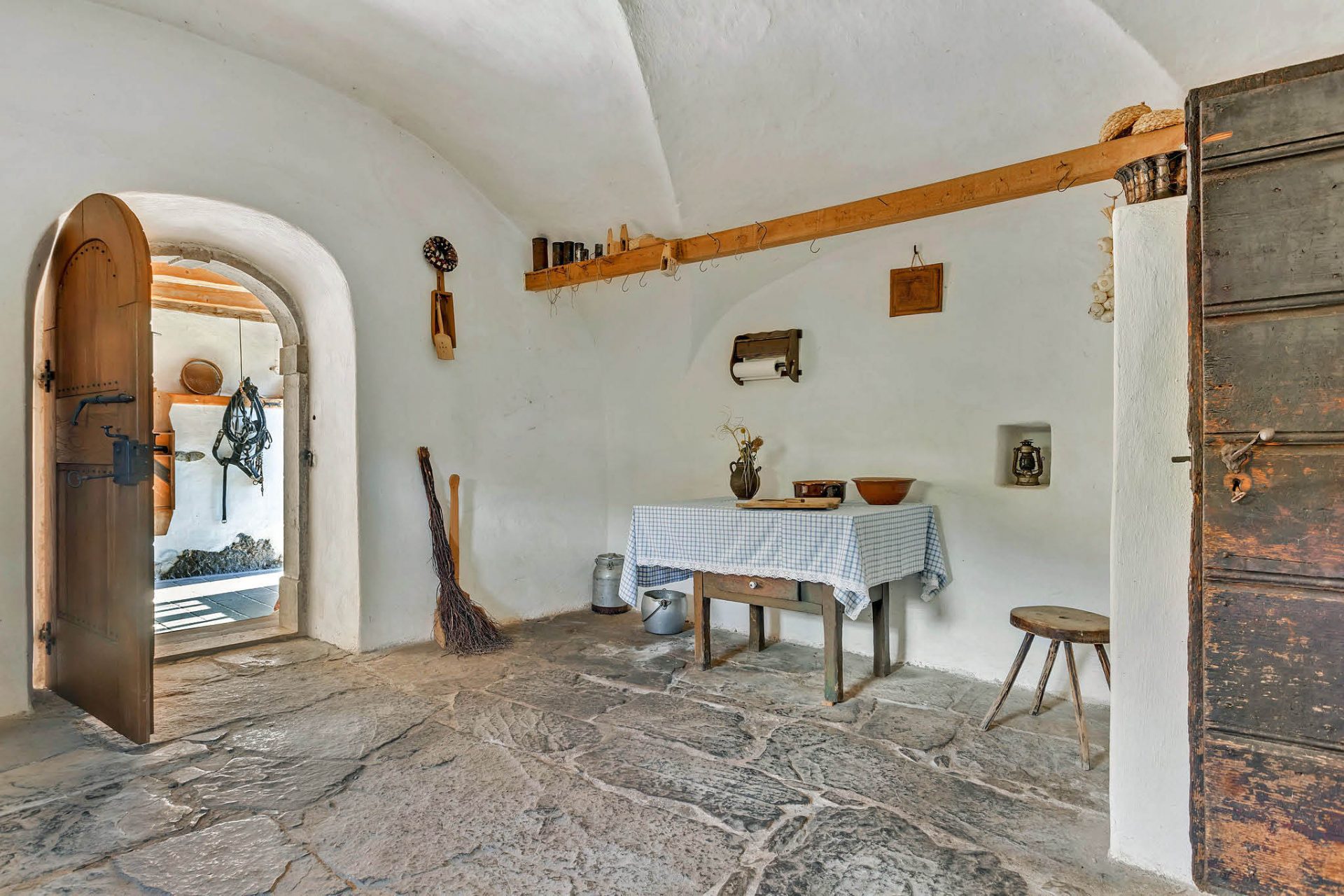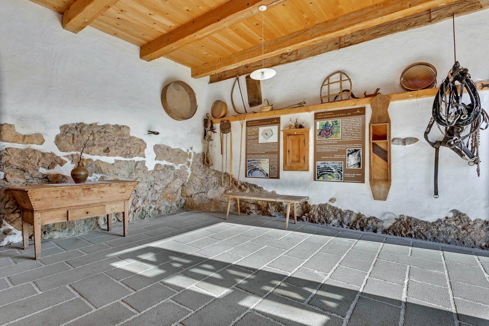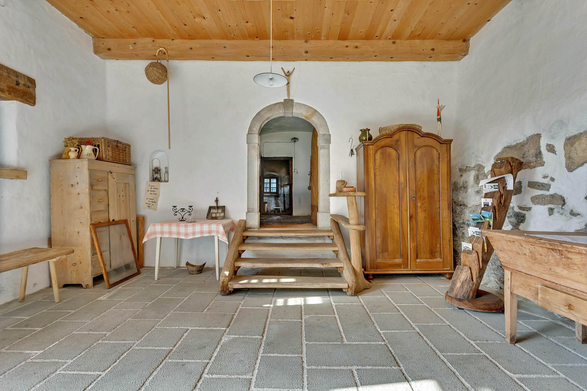 There is an entrance with a large hallway that leads to additional room with a display of pictures and tools from the old times and so called “black” kitchen.