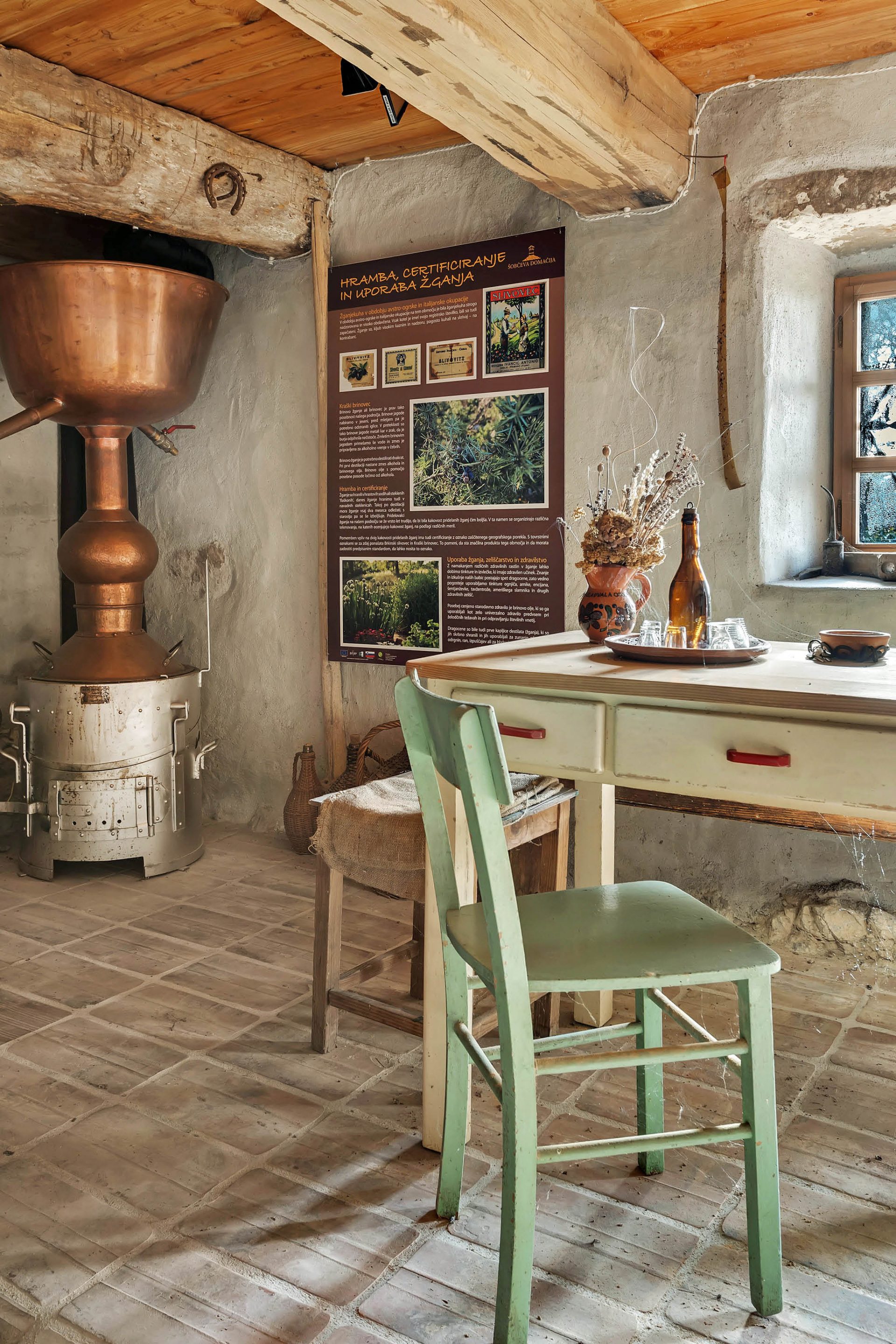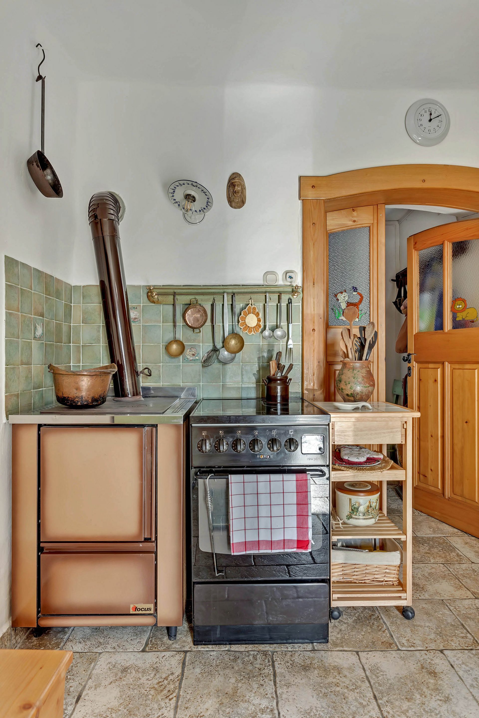A black kitchen is a room in which smoke is led through the chimney. The kitchen is a specialized room in the house where food is cooked and otherwise prepared. The black kitchen has an open hearth and the mouth of the heating stove, which is located in the adjacent smoke-free, mostly main living room. The smoke rises (intercepted by a spark arrester above the fireplace or if the kitchen is vaulted – through an opening in the vault) to the space above, to an old stone roof with and old chimney.