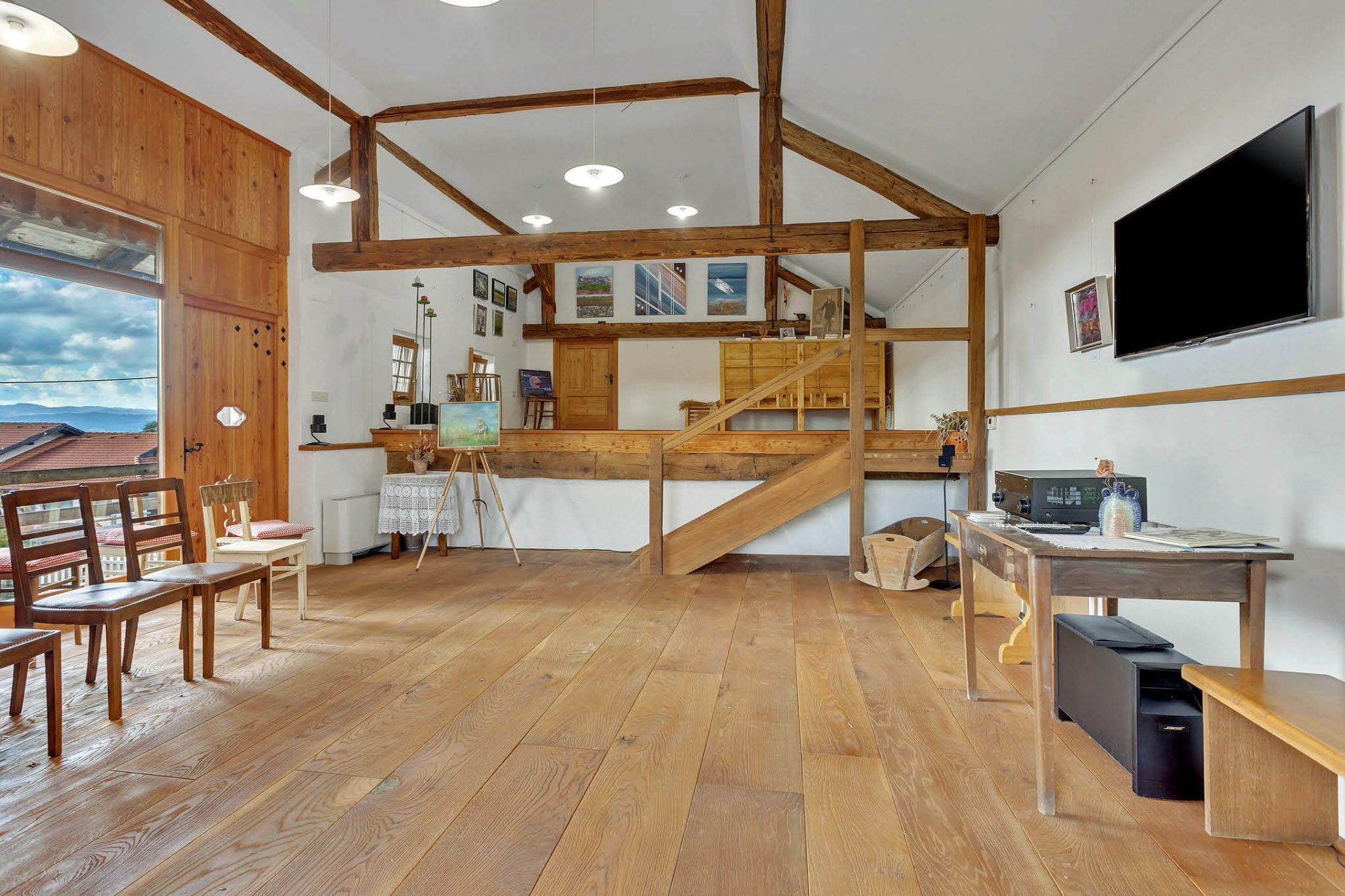 The second part consists of ground floor and the 1st floor. On the ground floor there is a kitchen, heating room and toilets for guests. The gallery above has some space for hosting events.