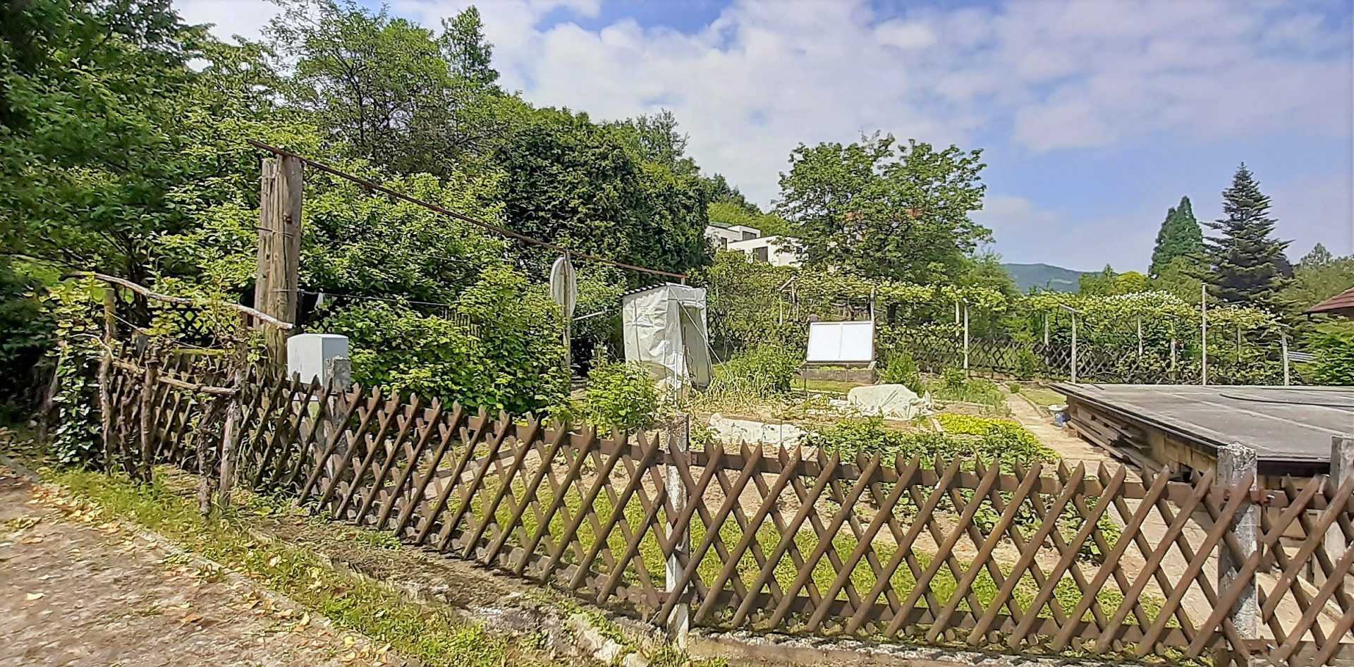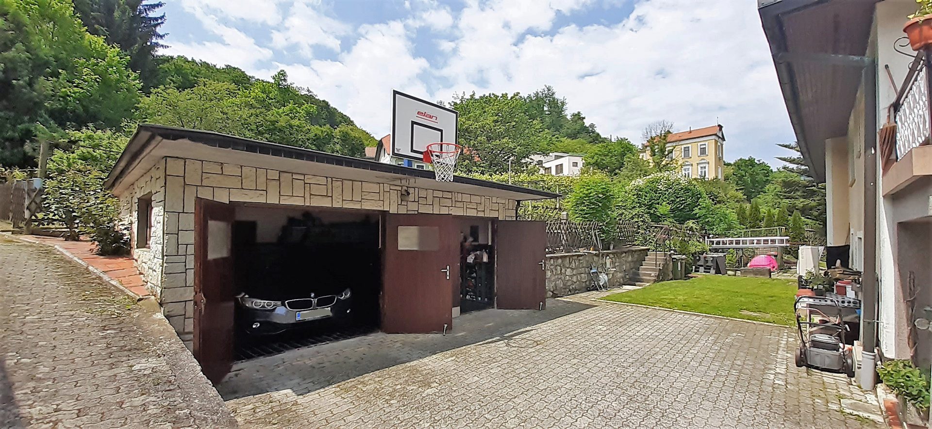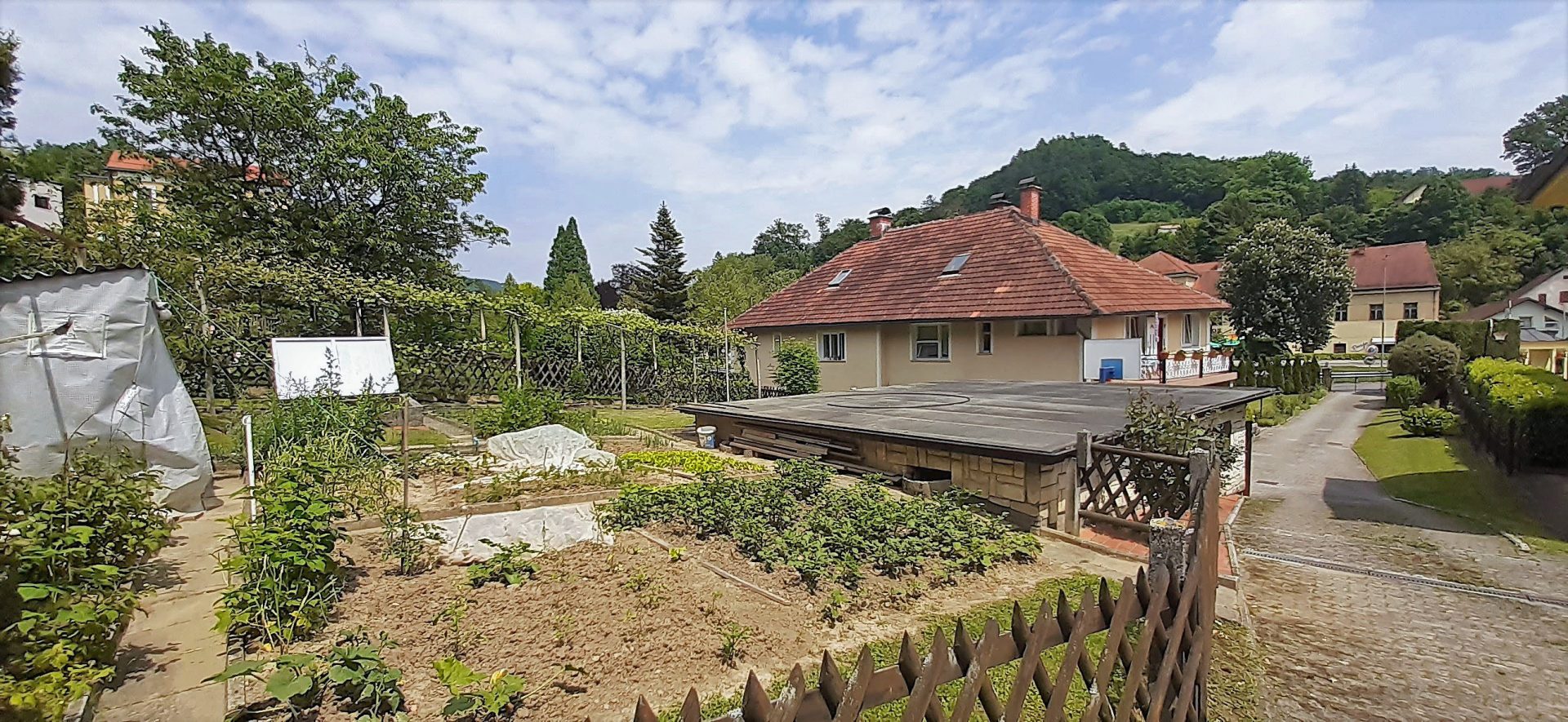 In front of the house, there is a lovely, well maintained garden with ornamental plants. Behind the house, there is a garage for two cars and a large vegetable garden. There is also parking space for additional vehicles in the courtyard.