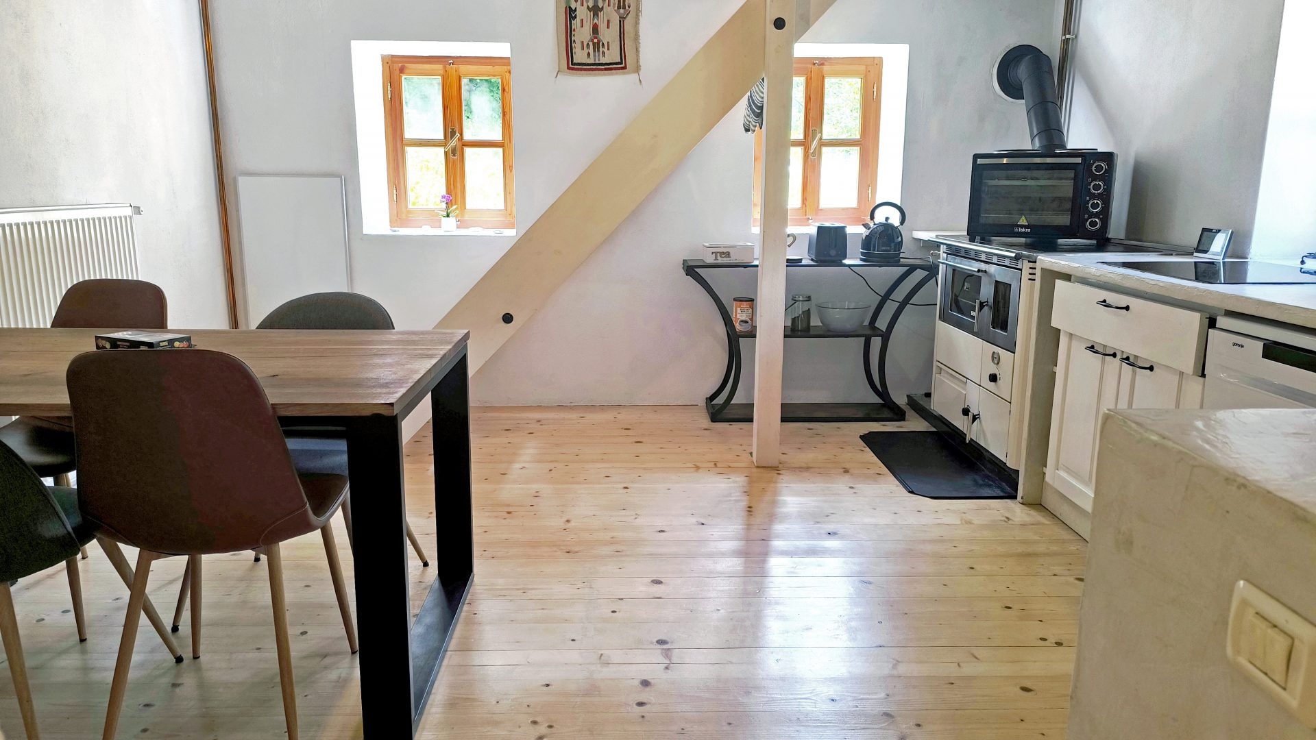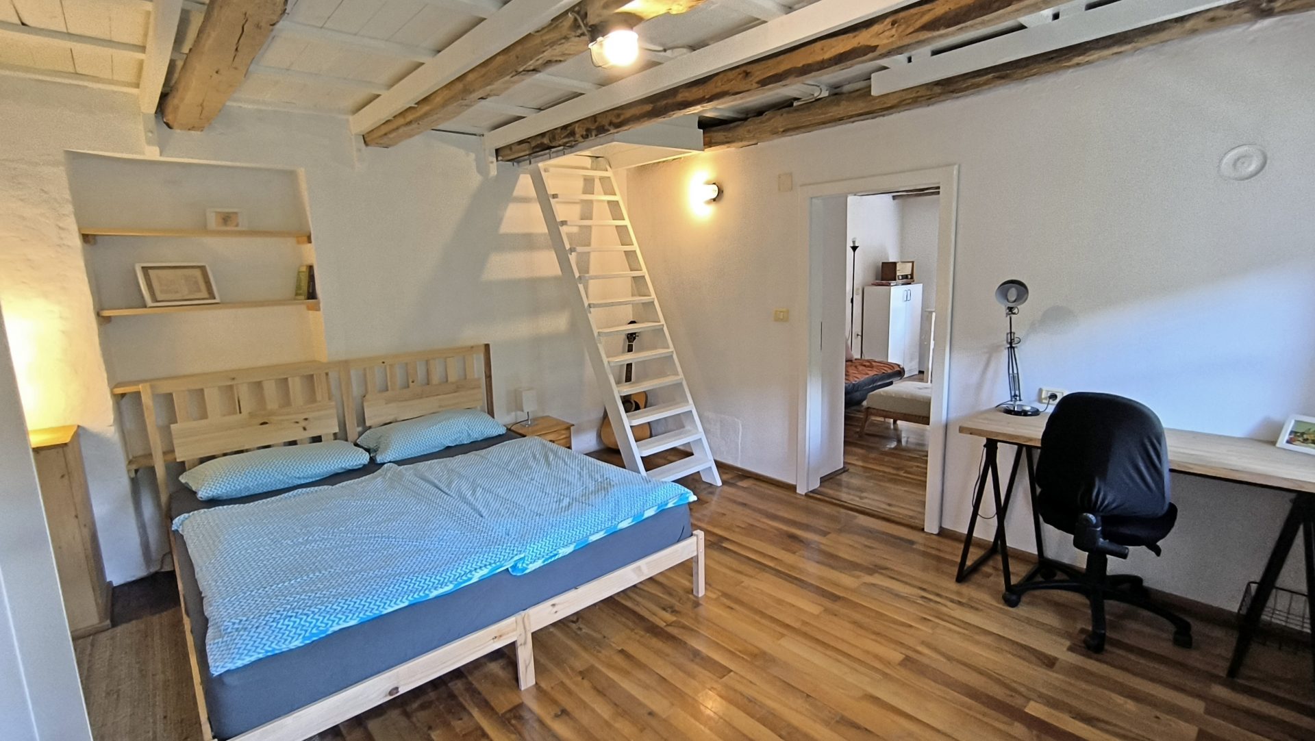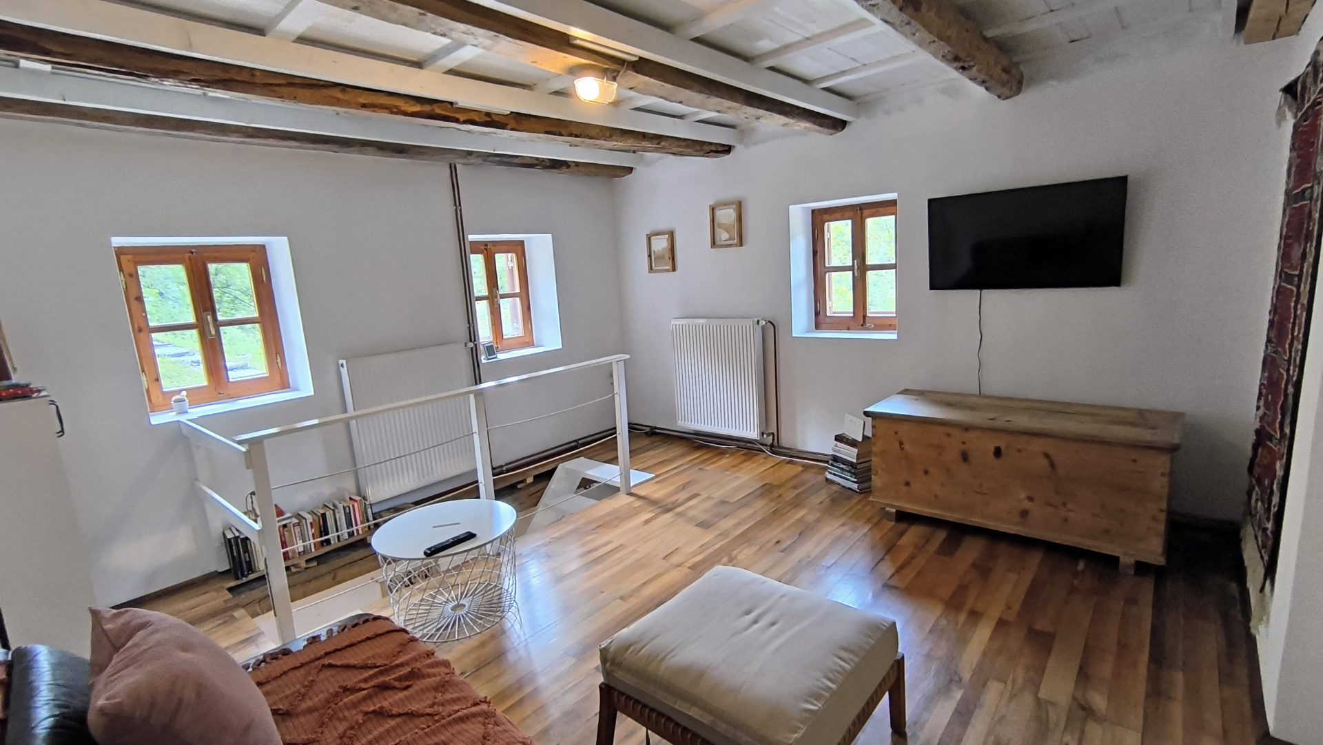 To the upper floor leads a wooden staircase, where there is a living room and additional bedroom.